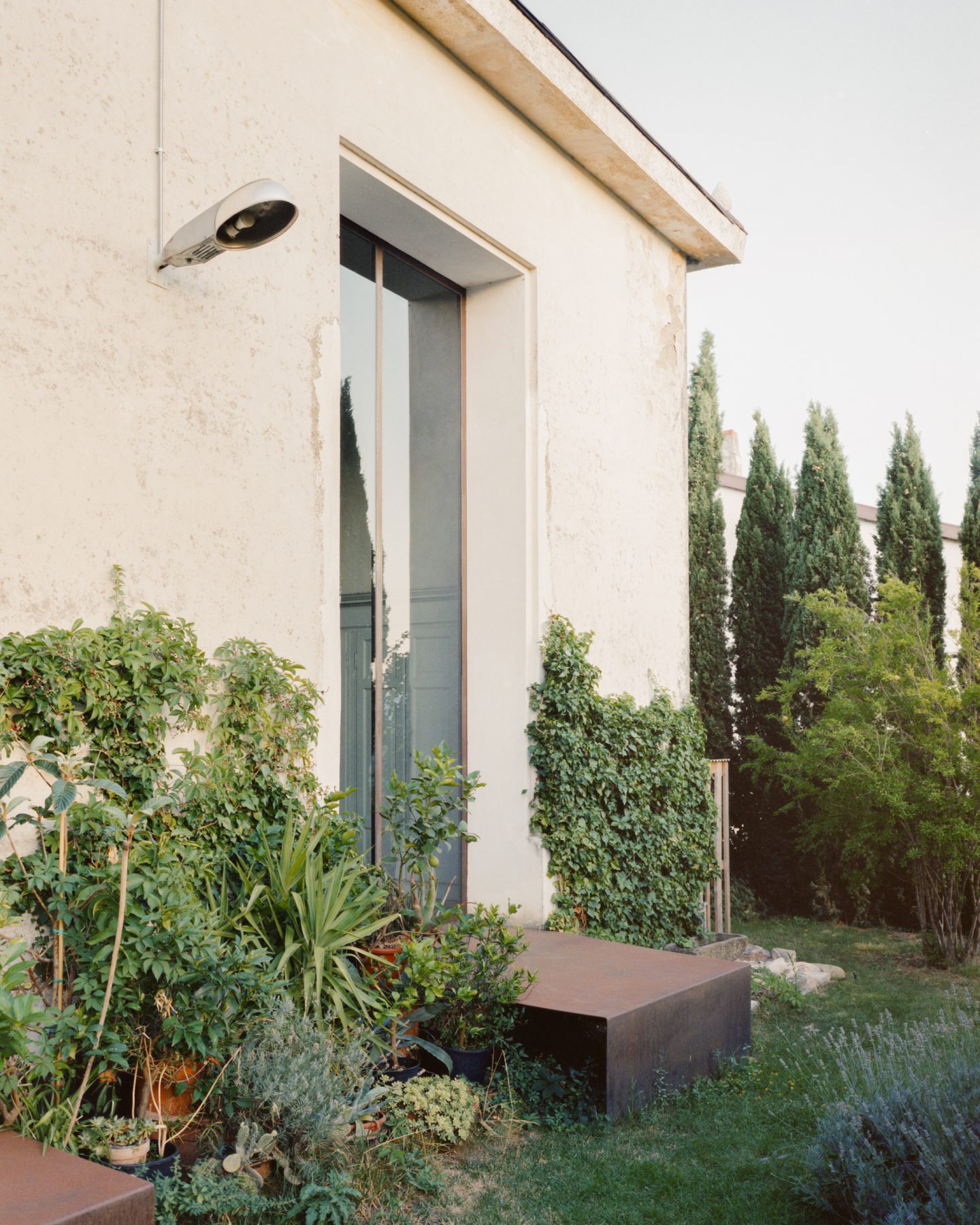 The site unfolds through three distinct landscape conditions. The natural hills form a wild and unspoiled backdrop, representing the most primal dimension of the territory. Closer to the house, the domestic garden introduces a more intimate layer, planted with rustic species yet arranged with a contemporary sensibility. Beyond this, the agricultural landscape of cultivated fields and vegetable gardens establishes a productive layer that filters and frames the new architecture, creating a balanced coexistence between human intervention and nature.