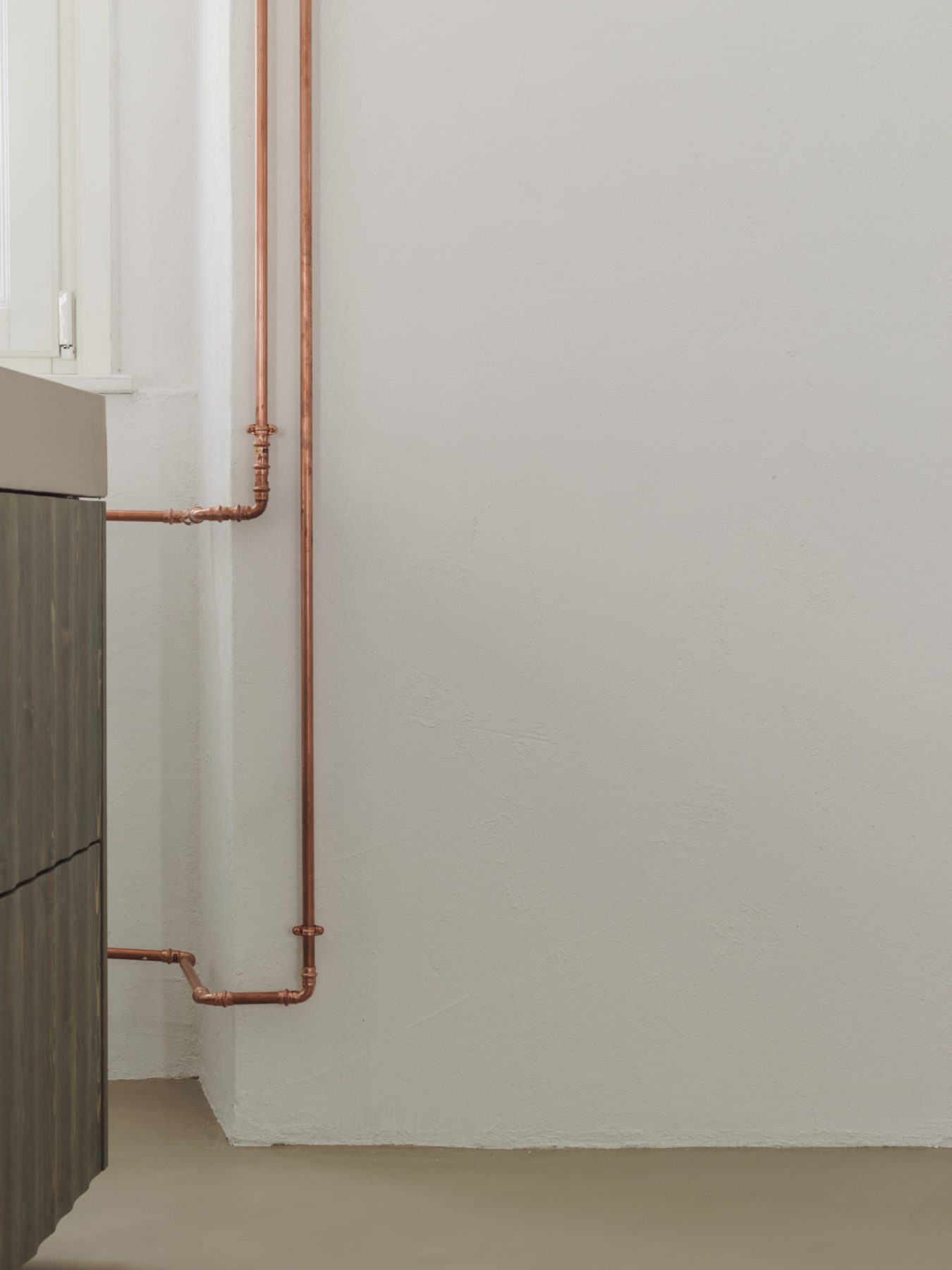 Few, targeted interventions characterize the renovation: sandstone-colored resin flooring, a rough plaster for the masonry provides a backdrop for the new customized copper planting, and finally a fixed masonry element in the center of the large room, the kitchen.