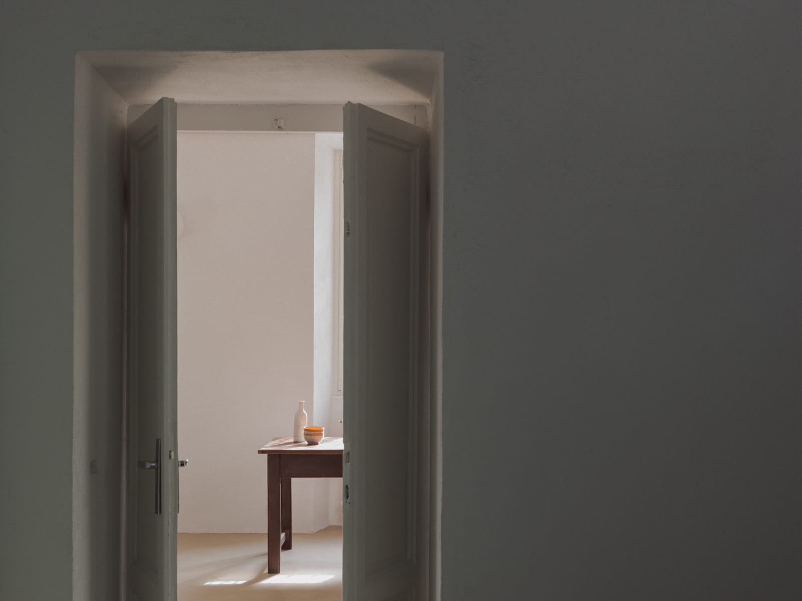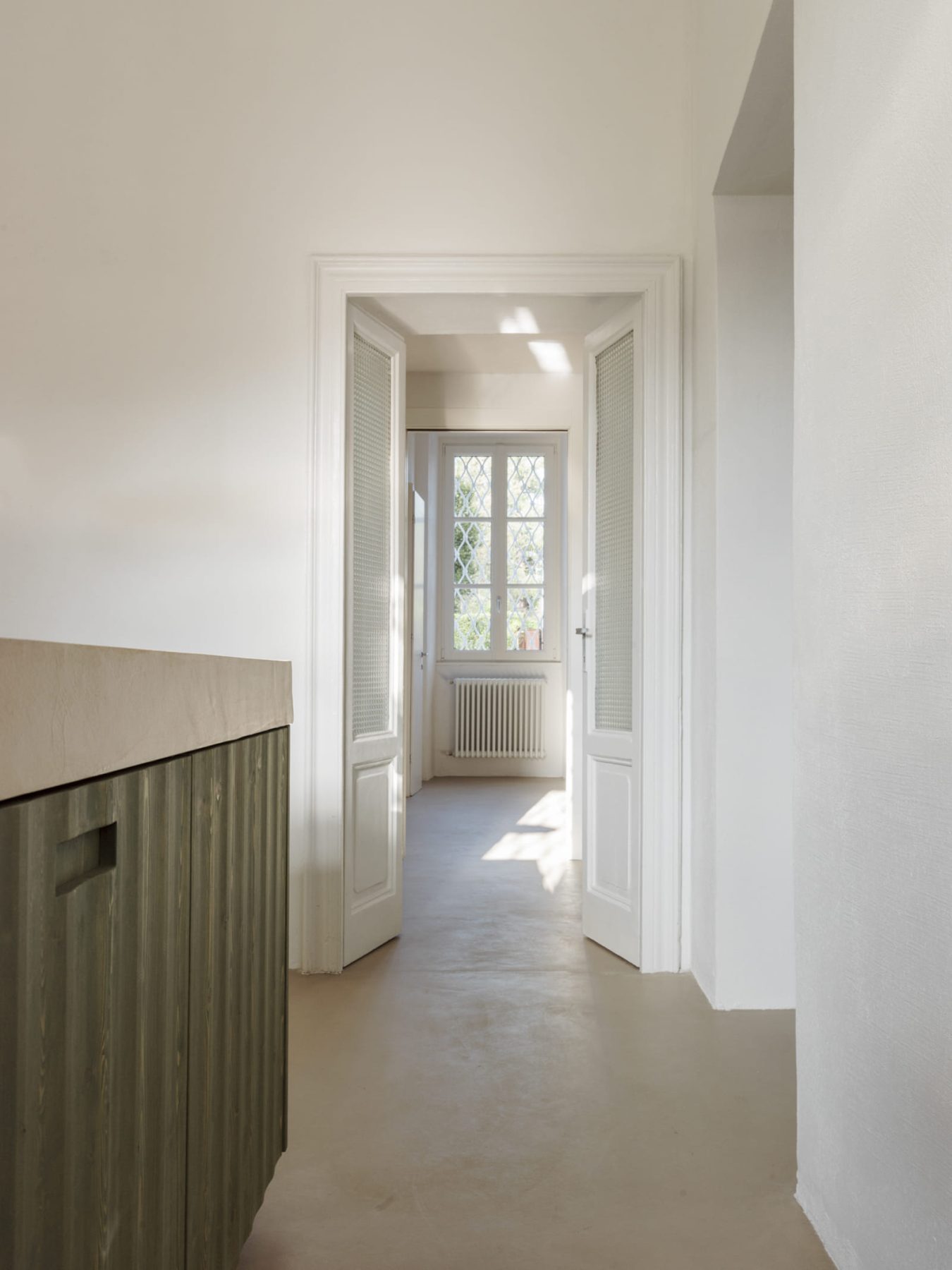 Two rooms relate to this large space through two historic doors, where relatives and friends will be received; the master room is instead identified with a new door and also overlooks the living room. From here there is access to a small garden with two old birch trees that provide shade for the outdoor space.