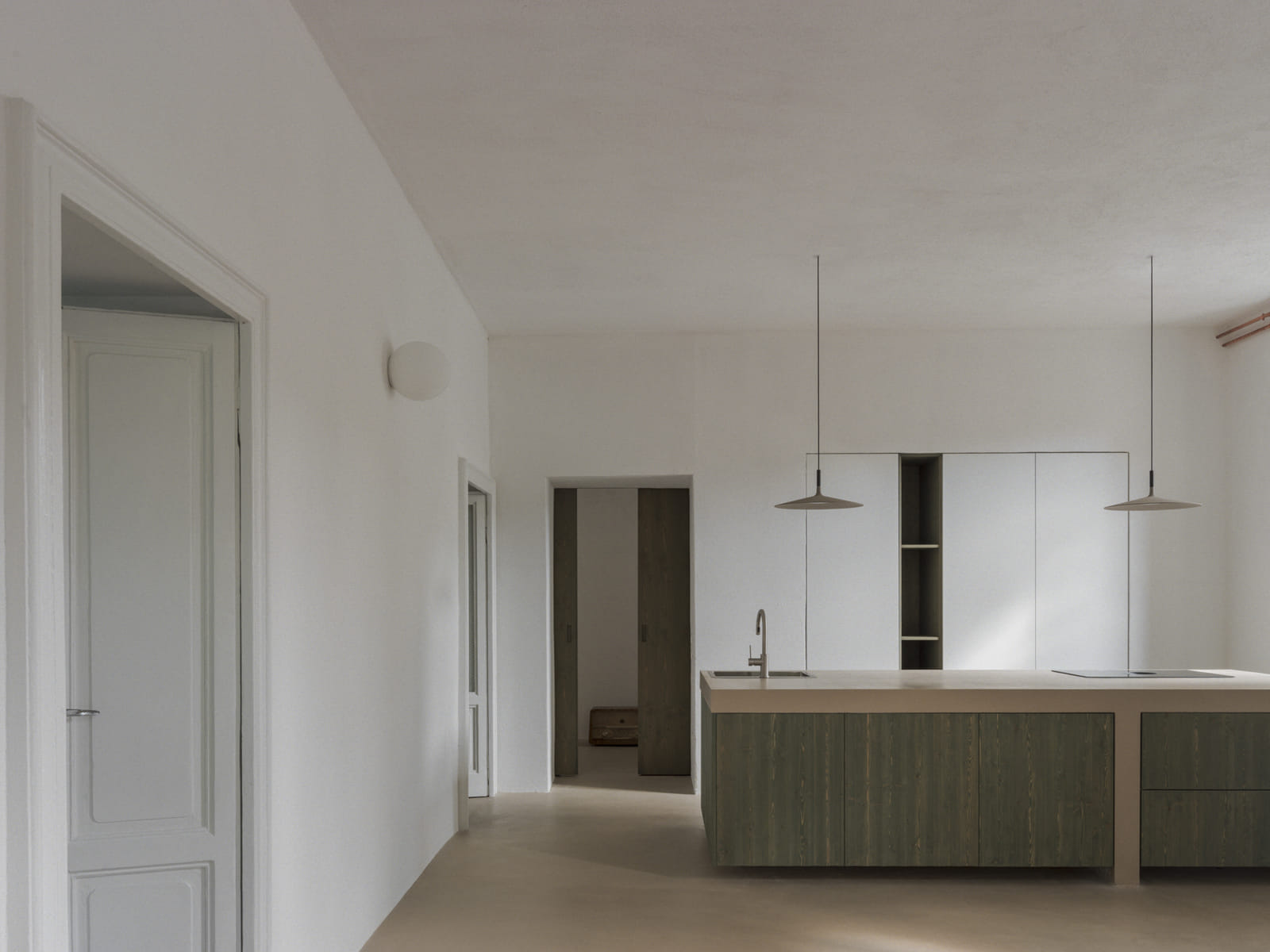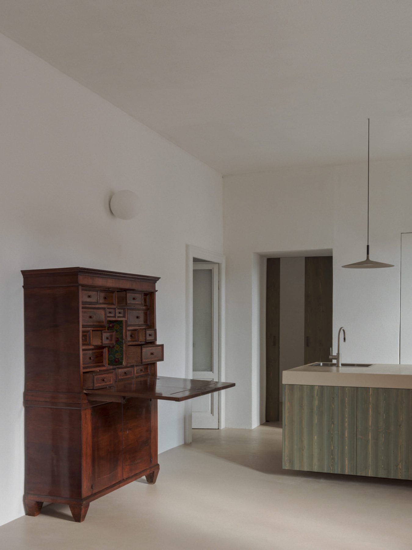 Few precise elements build the space. The only new and fixed furniture element is the kitchen, made of concrete, a unique piece, an architectural object that measures the space. The furniture around it, on the other hand, can change, adapting to the needs and uses the house will have.