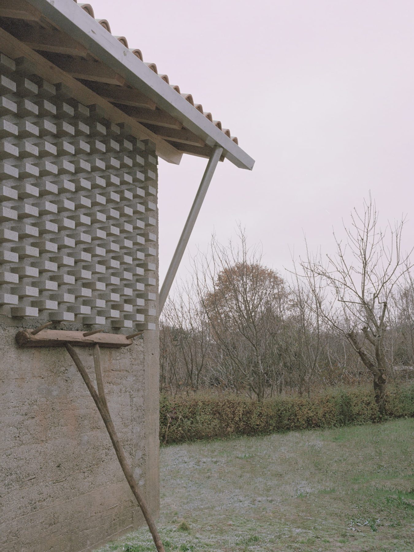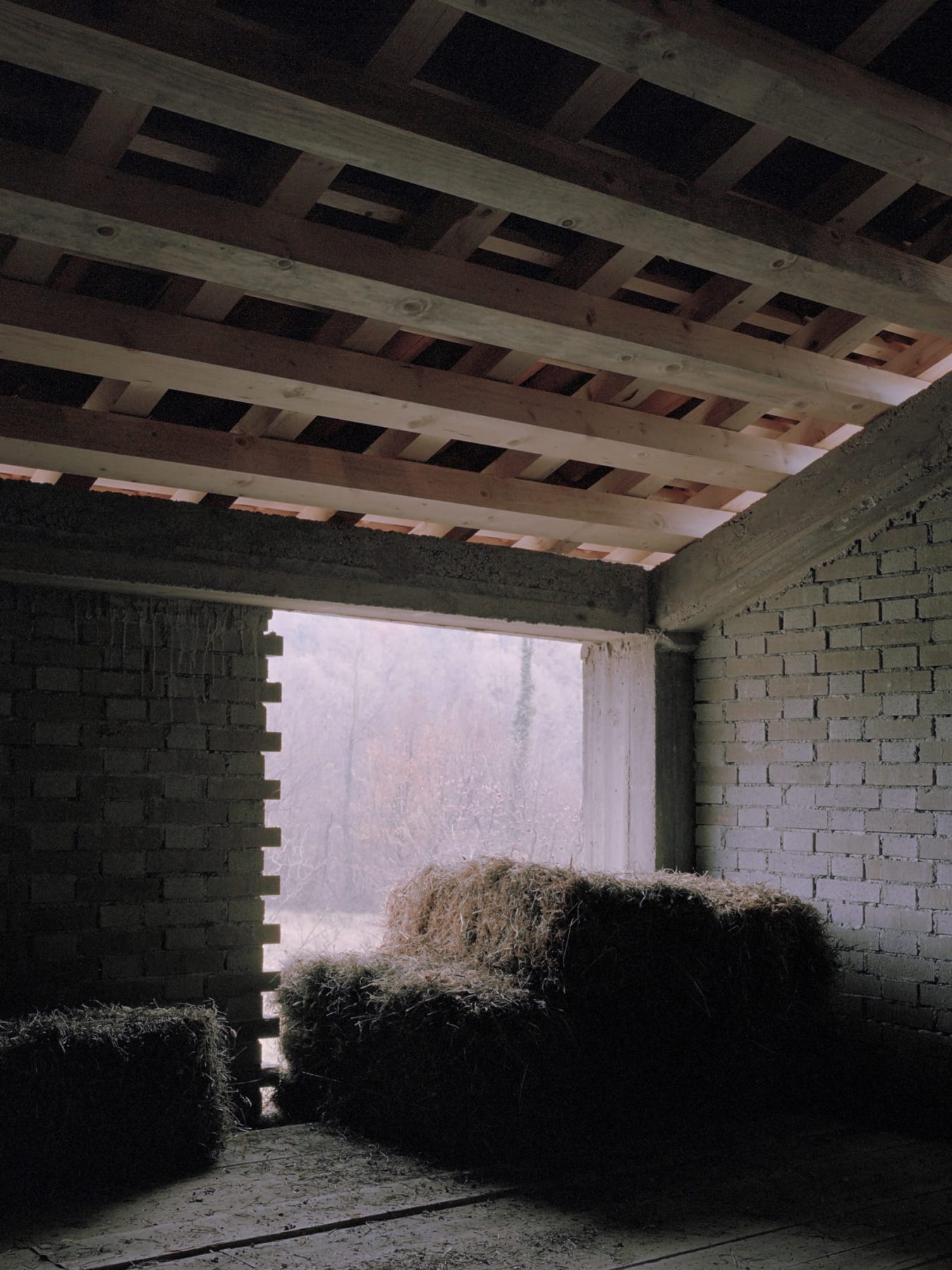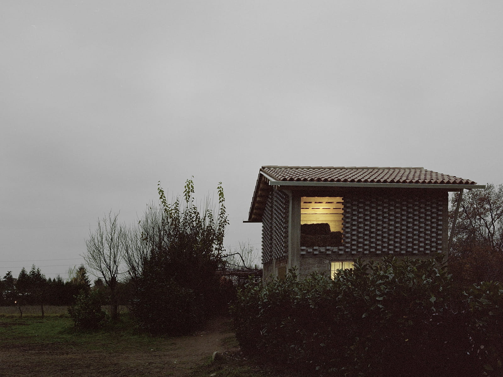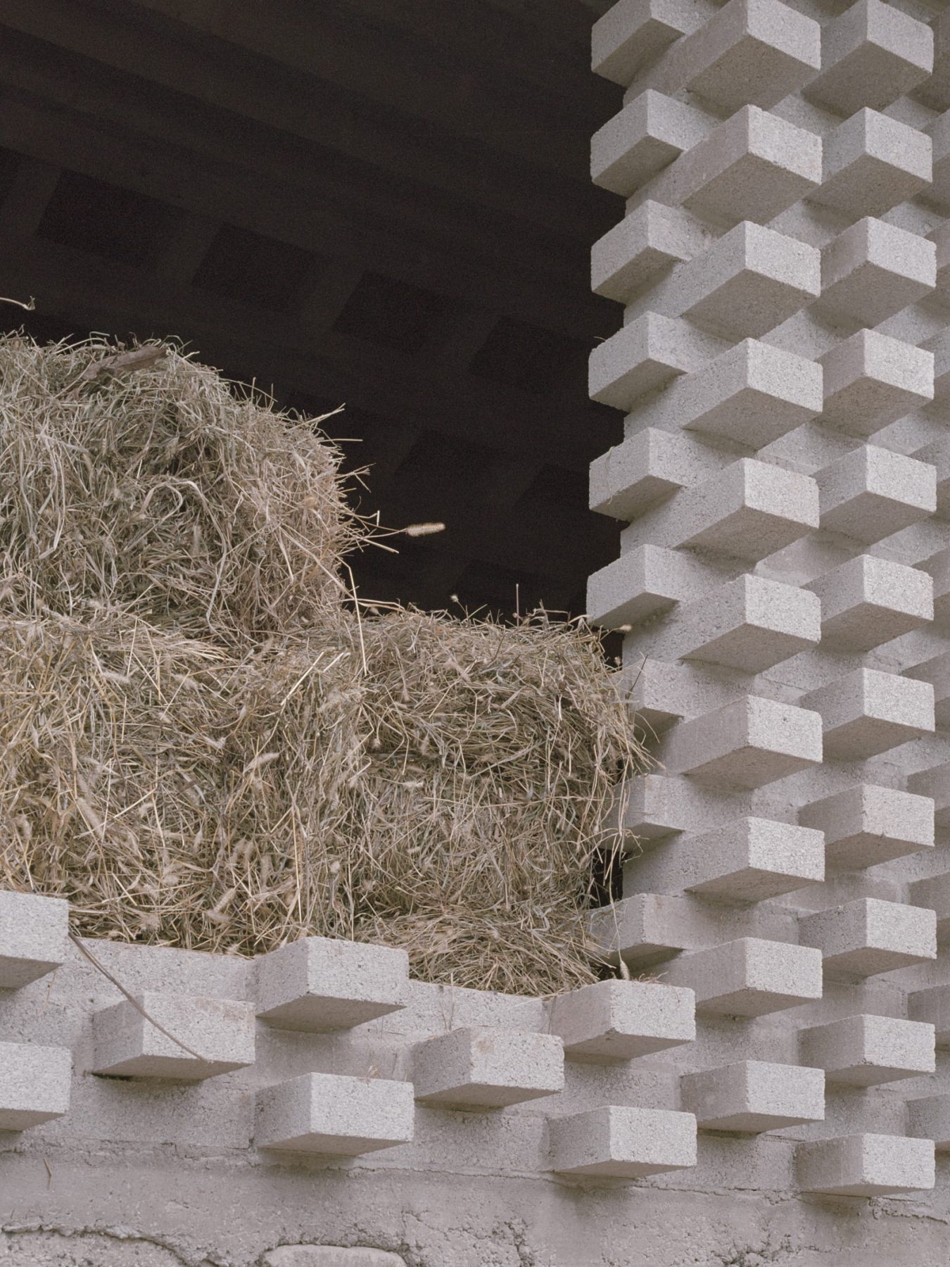 The upper floor remains devoted to agricultural use, functioning as storage for tools and small dried hay bales. Unlike traditional barns, which often feature permeable or open façades to allow for hay drying, this building did not require such conditions. Instead, the cement brick walls reinterpret, in a contemporary manner, the perforated masonry historically found in rural Lombard farm buildings—solid, pragmatic, and expressive in their restraint.