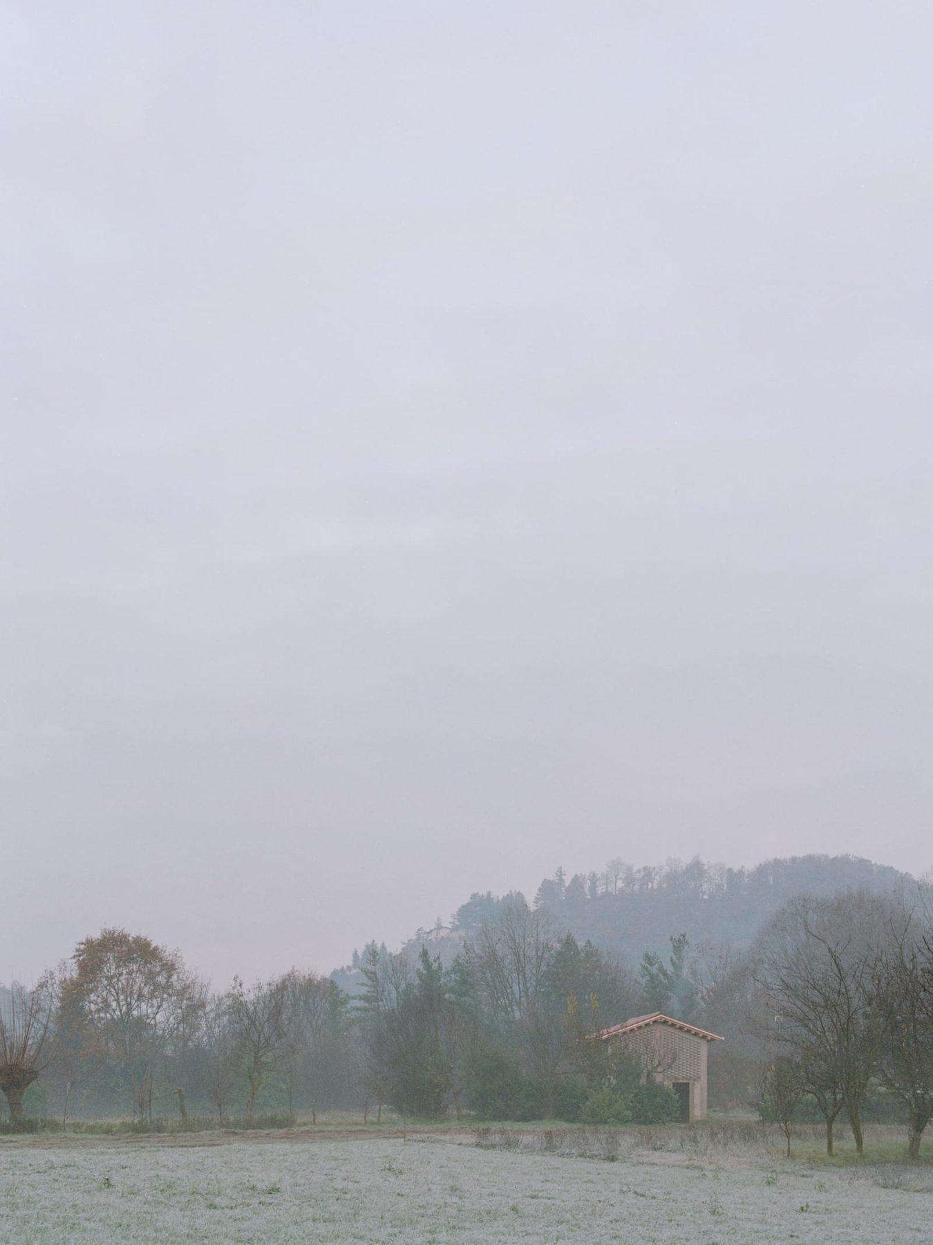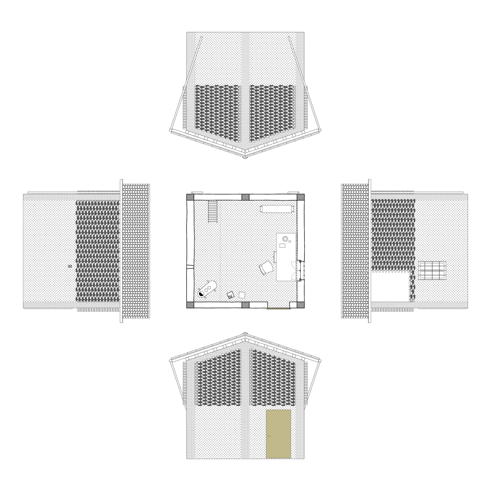 Inside, the atmosphere is deliberately minimal and intimate. A small table, a few chairs, and a single window carefully frame the surrounding landscape. The space feels private, almost secret—less a room than a pause within the rural fabric, where time slows and the outside world is quietly observed.