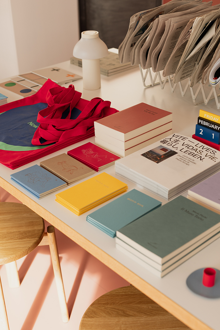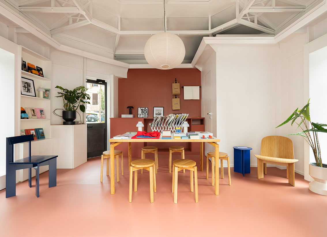 Custom-designed, it features new furniture and materials: lacquered wood shelving and a counter crafted by an artisan workshop, sustainable Forbo vinyl flooring, and a collection of design pieces including a table by Magnus Olesen, Chisel lounge chair, lighting by Hay and Artemide, stools and chairs by Audo Copenhagen and Ferm Living. Pop-up exhibitions, creative workshops, editorial presentations, and intimate events will bring the program to life, offering a concrete and accessible alternative to traditional commercial or institutional venues.