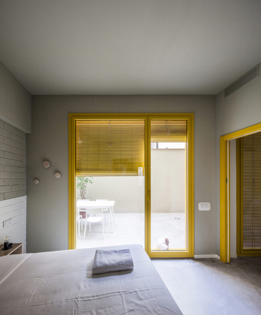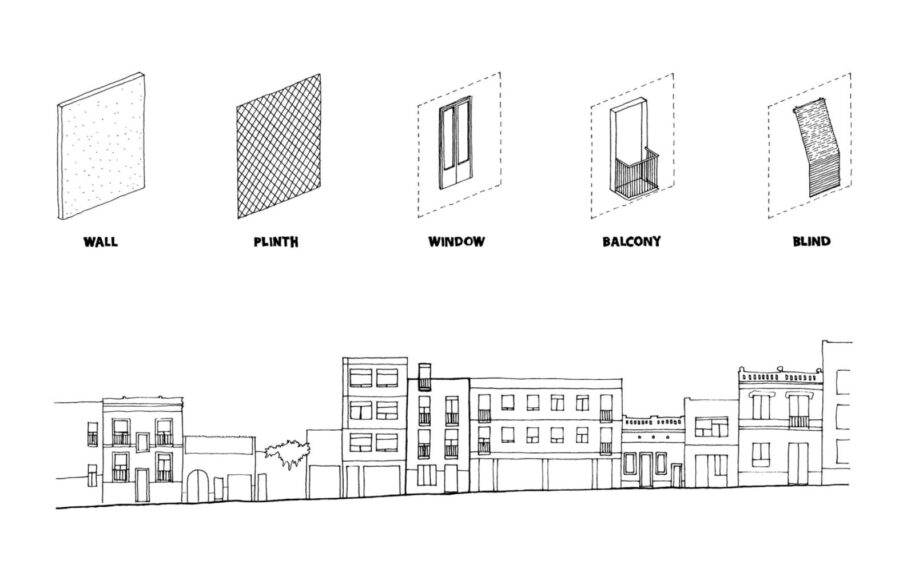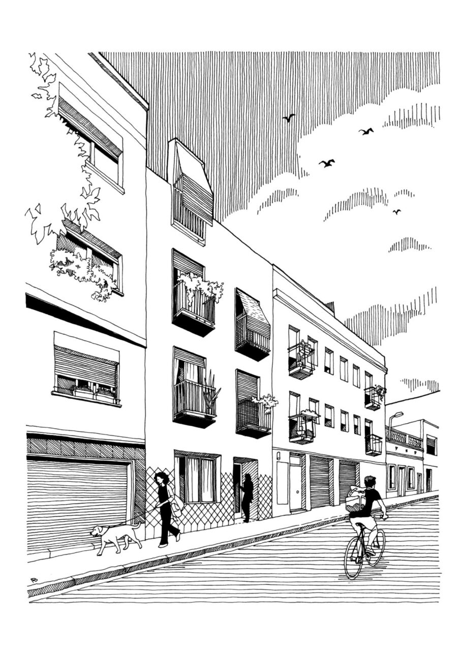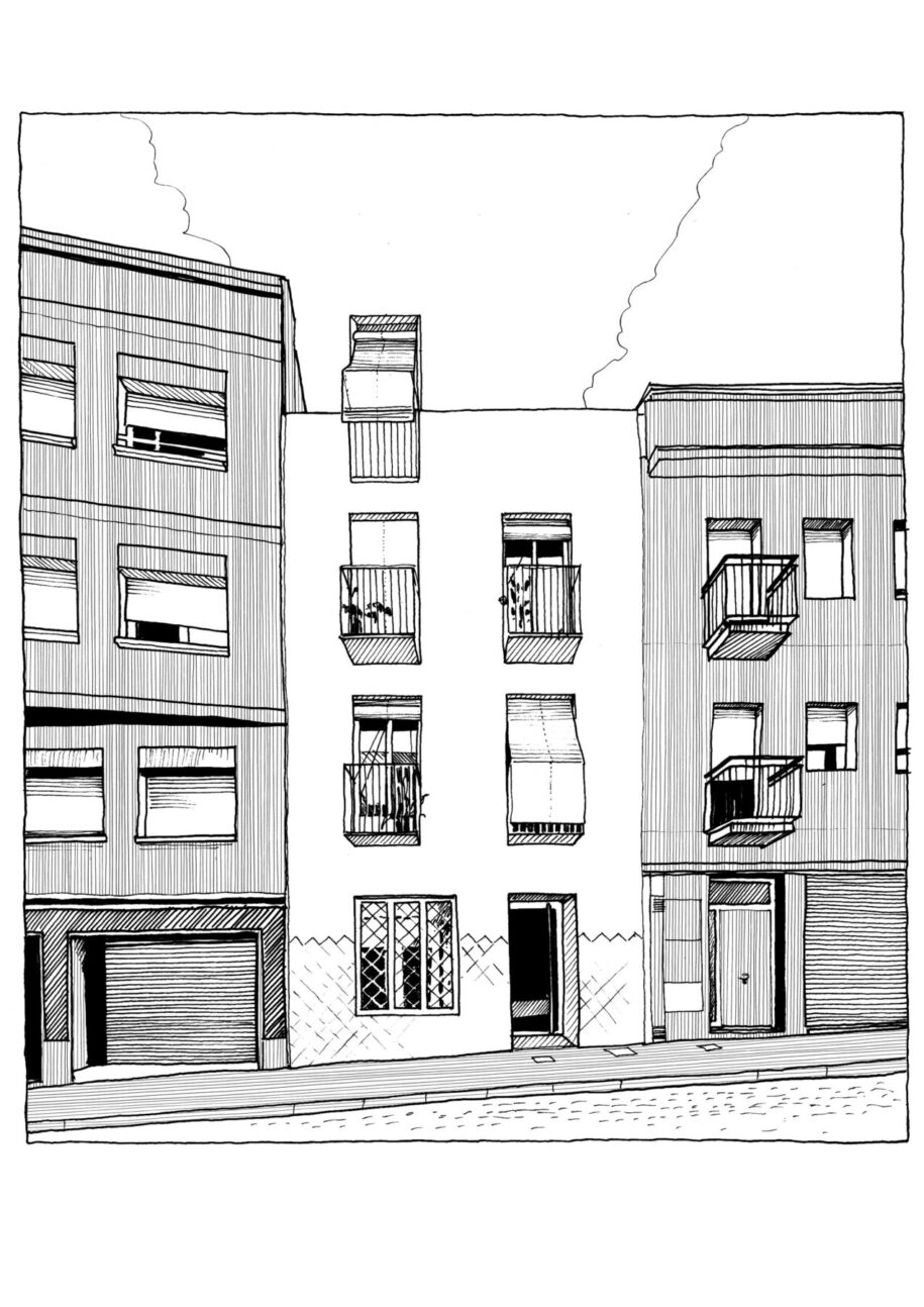 In this sense, the façade facing the street is made up of the usual elements and proportions in the neighbourhood: balconies, blinds, baseboards, stucco, etc. But we give the facade a twist in its details and the simplicity of its elements, with the peculiarity that one of these elements escapes from the perimeter of the façade. The effect is, on the one hand, to tie up the neighbouring lot, which is the only one on the street that does not comply with the rules of “good neighbourliness”, as it has one more floor than is allowed.