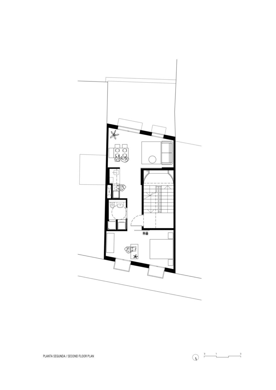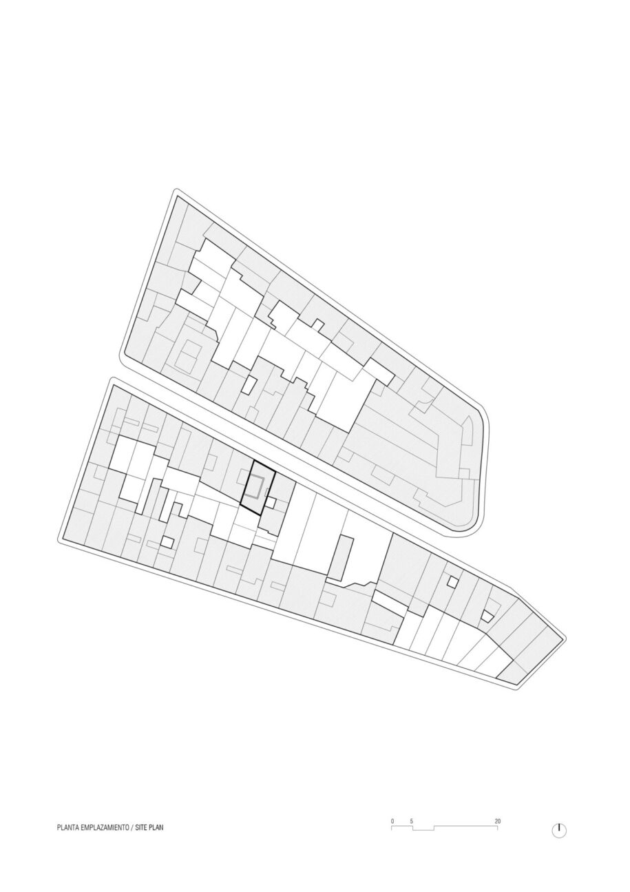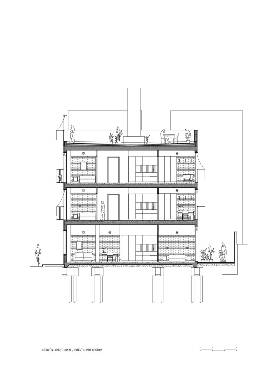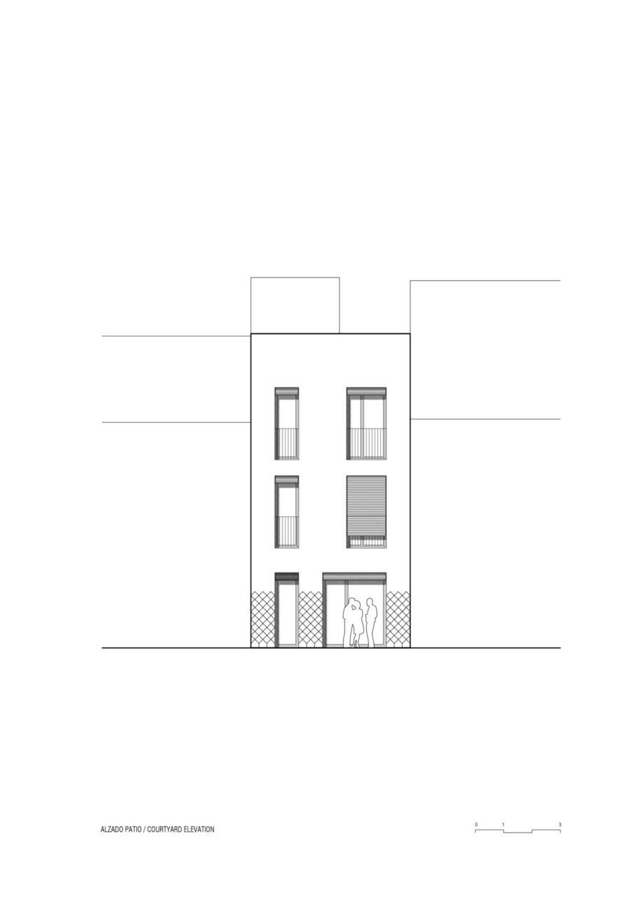 The plot is tight in all its dimensions, allowing for an apartment of only 40 m2 per floor. Given the scarcity of surface, the proposal adds value to the homes through a central space that includes the staircase, kitchen and bathroom. This provides for two equal spaces on both facades, one faces the street and the other the block’s interior patio.