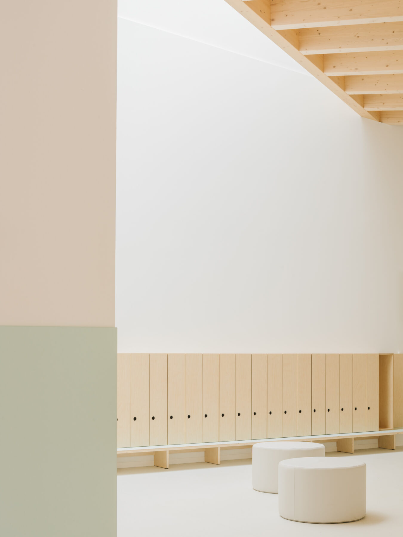 The articulation of spaces becomes evident at transitional junctures, where the seamless flow between environments is highlighted. Within these ‘intermediate’ spaces bridging the classrooms, various architectural elements—such as a striking portal, a skylight illuminating a double-height area, and a solitary column—emerge as focal points, inviting exploration and discovery due to their deliberate placement and size.