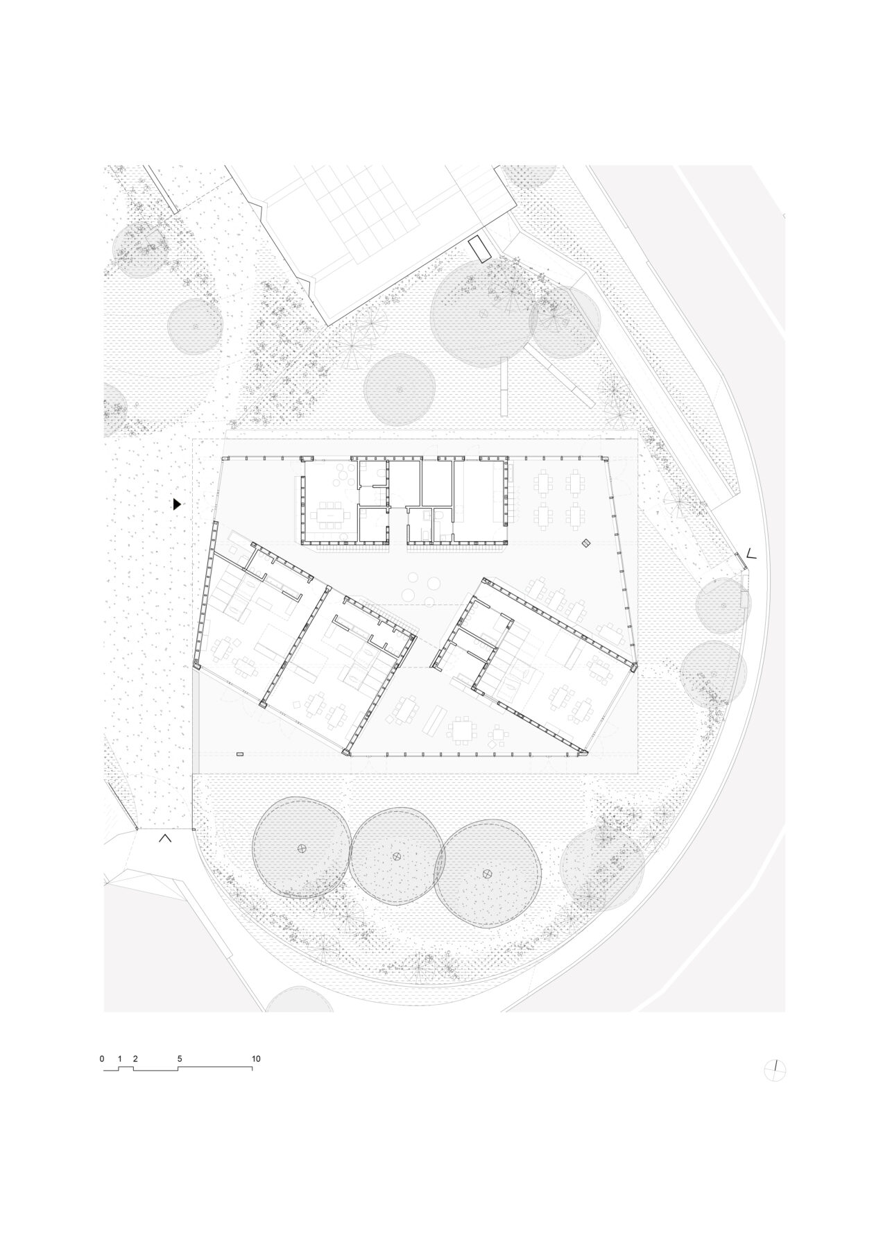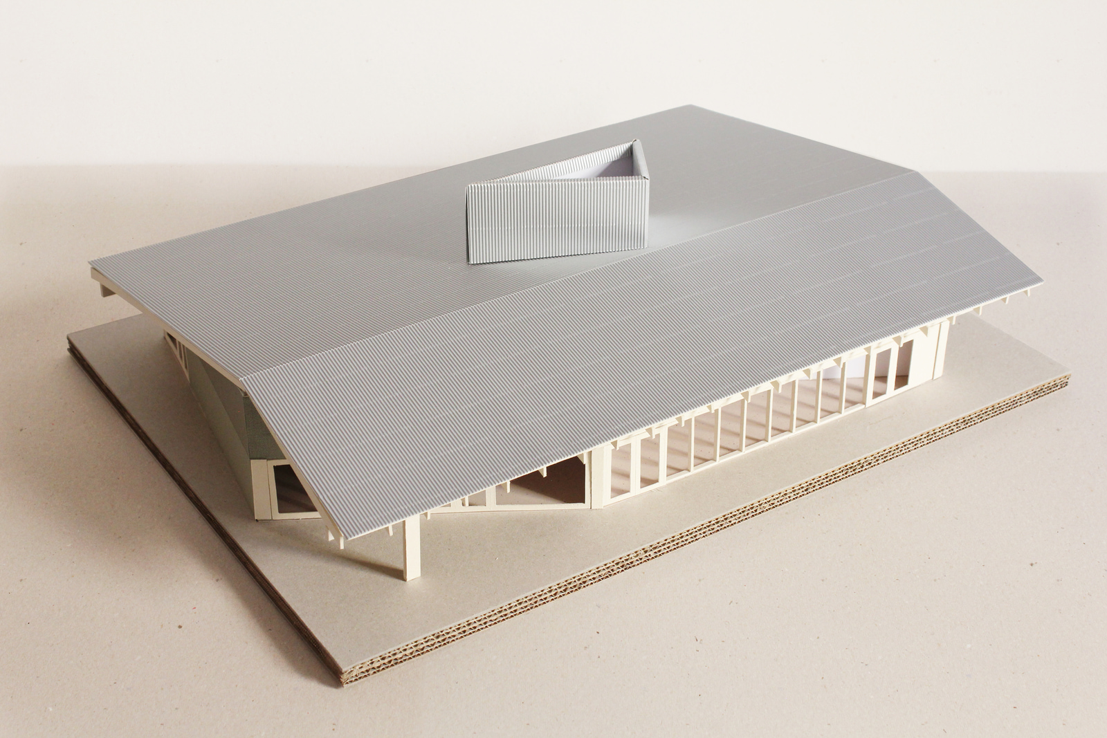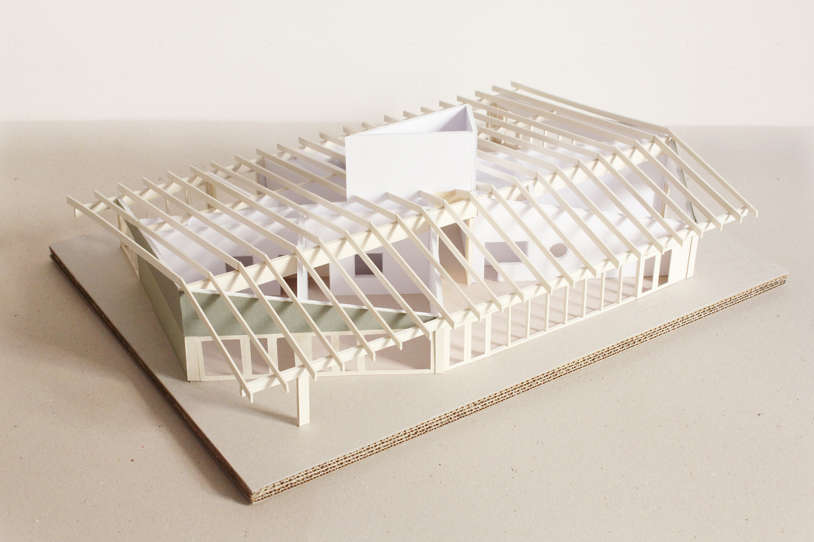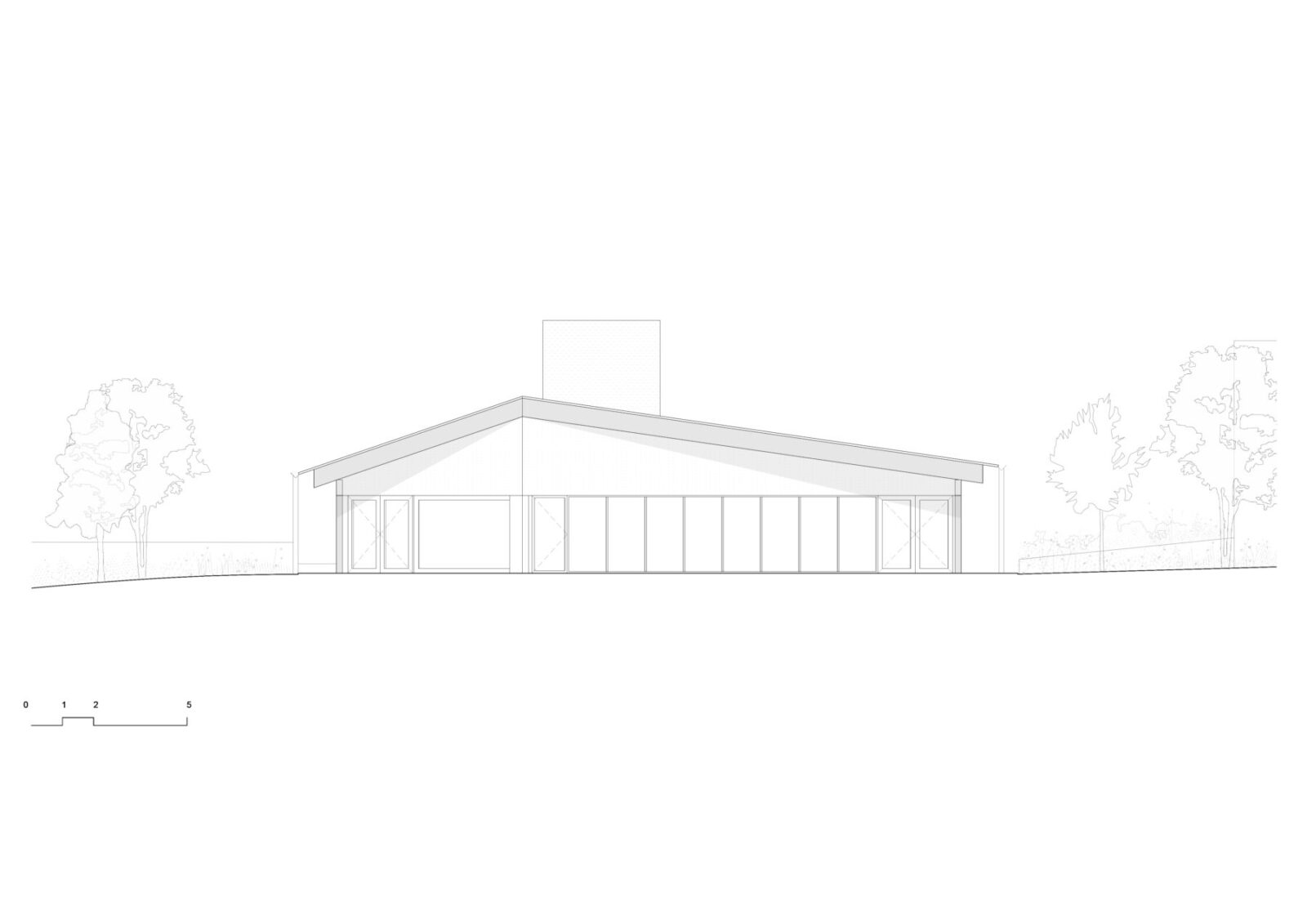The result is a porous system that seamlessly integrates with the garden through oblique views facilitated by changes in the roof section.