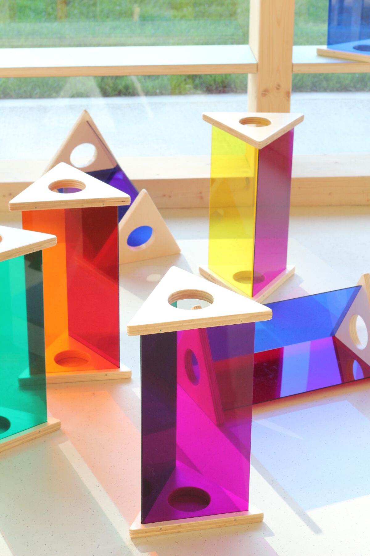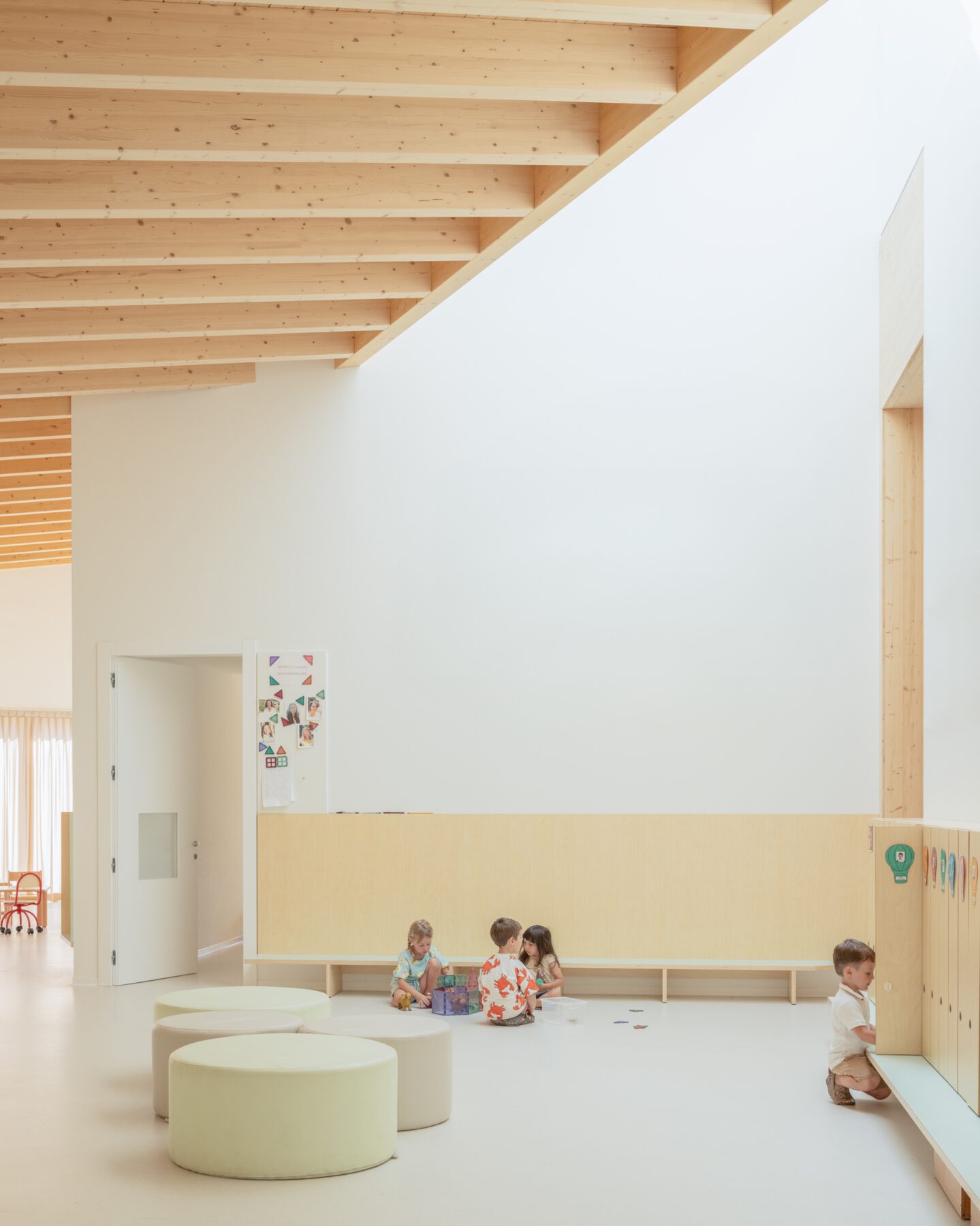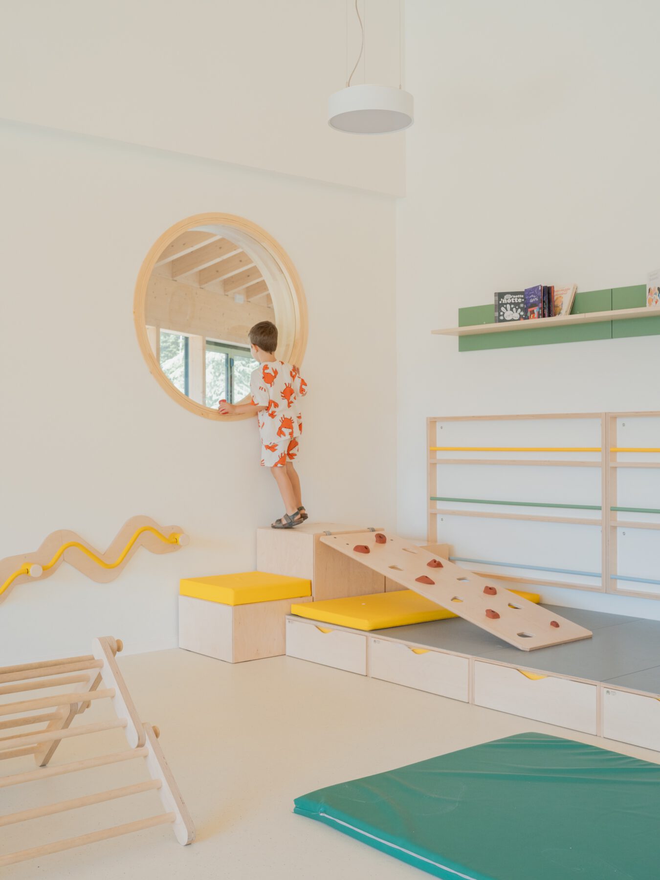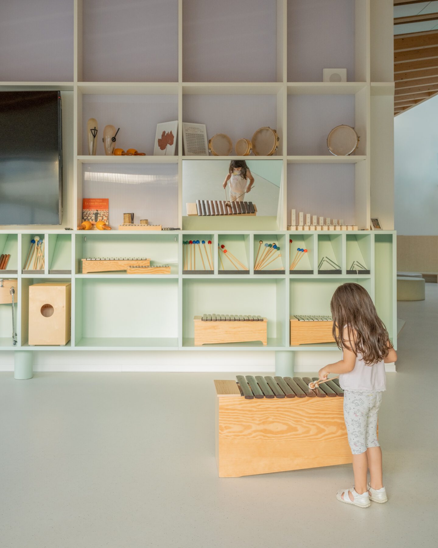 The building accommodates spaces for welcoming families, children, teachers, and educators, along with a music workshop, a sensory workshop for exploring smells and tastes, and a library. Within the same area, children can also share mealtime, as the facility is equipped with a fully functional kitchen.