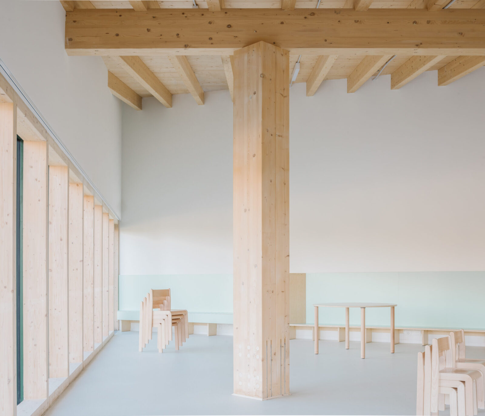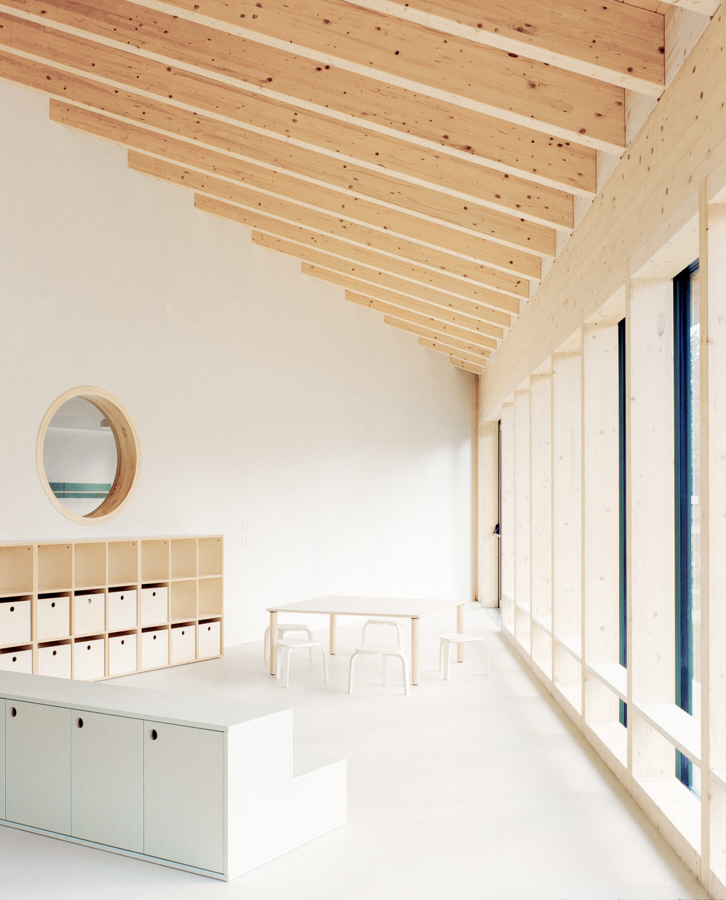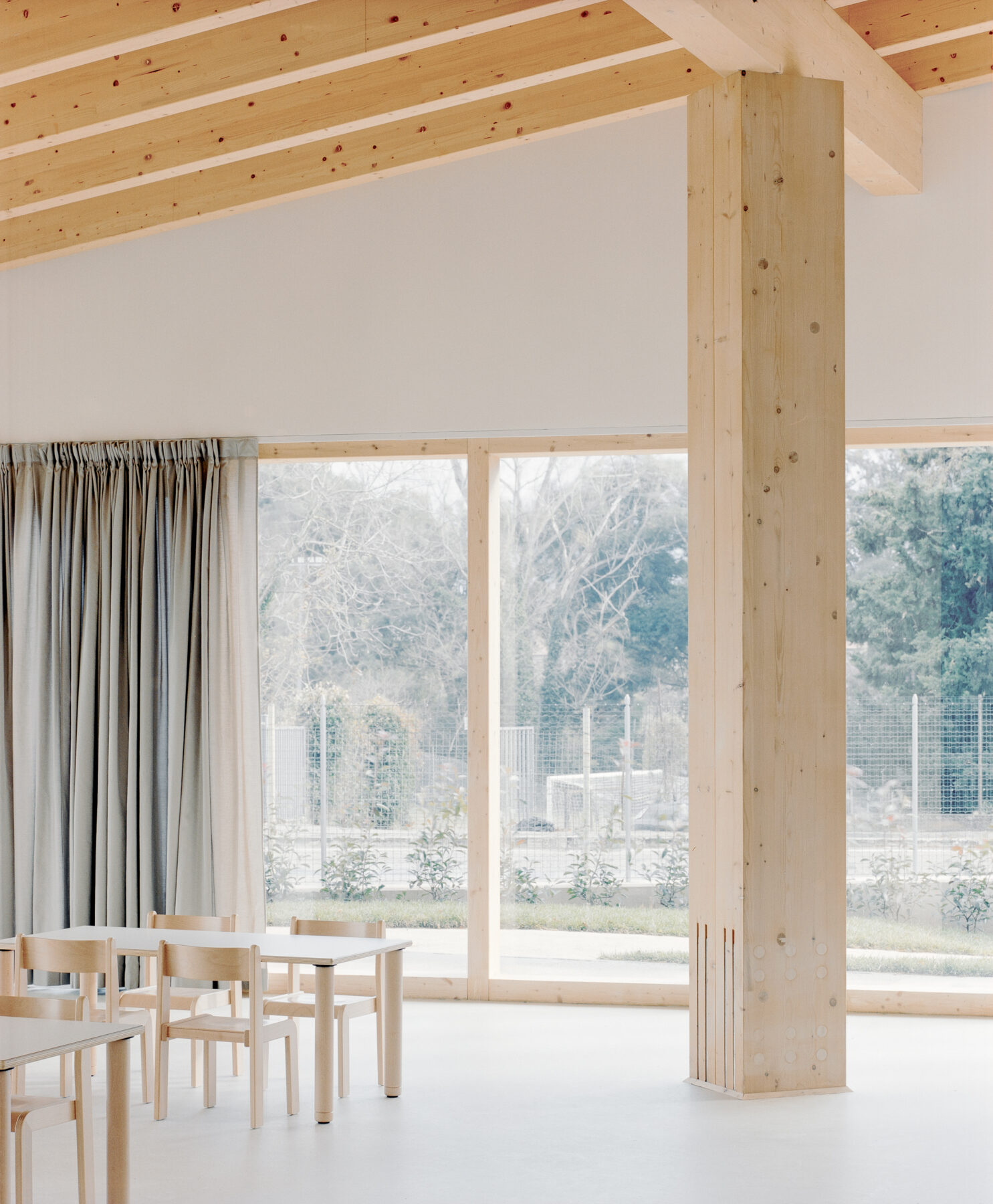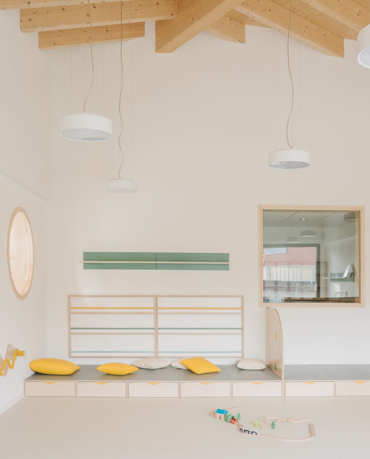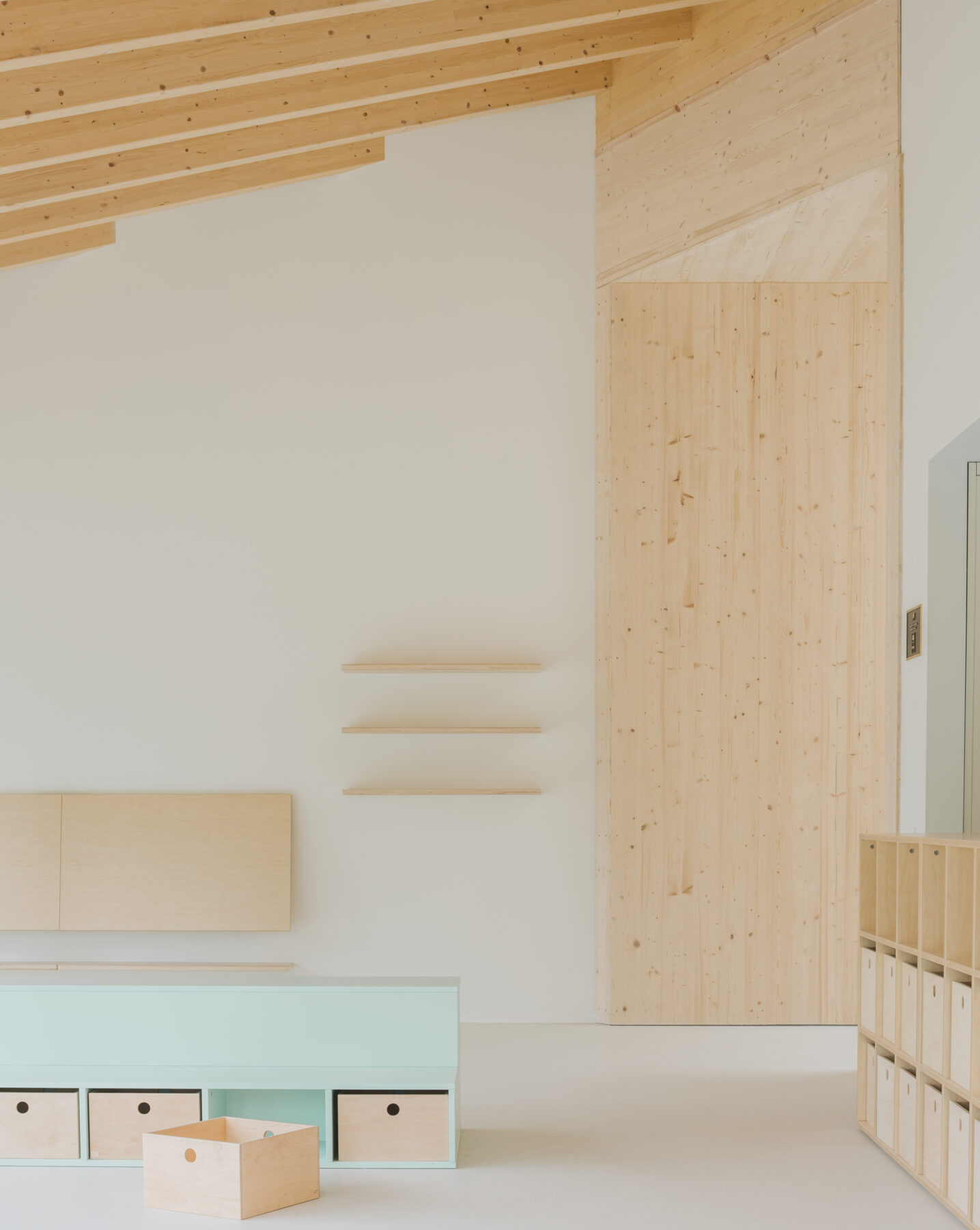 Designed based on simple typological characteristics and construction solutions, the new preschool is built in wood and consists of a series of disjointed volumes organized beneath an ample pitched roof. The building provides an open educational environment where the interconnectedness of spaces and the relationship between indoor and outdoor areas are part of an educational experience aimed at providing children with numerous opportunities for discovery.