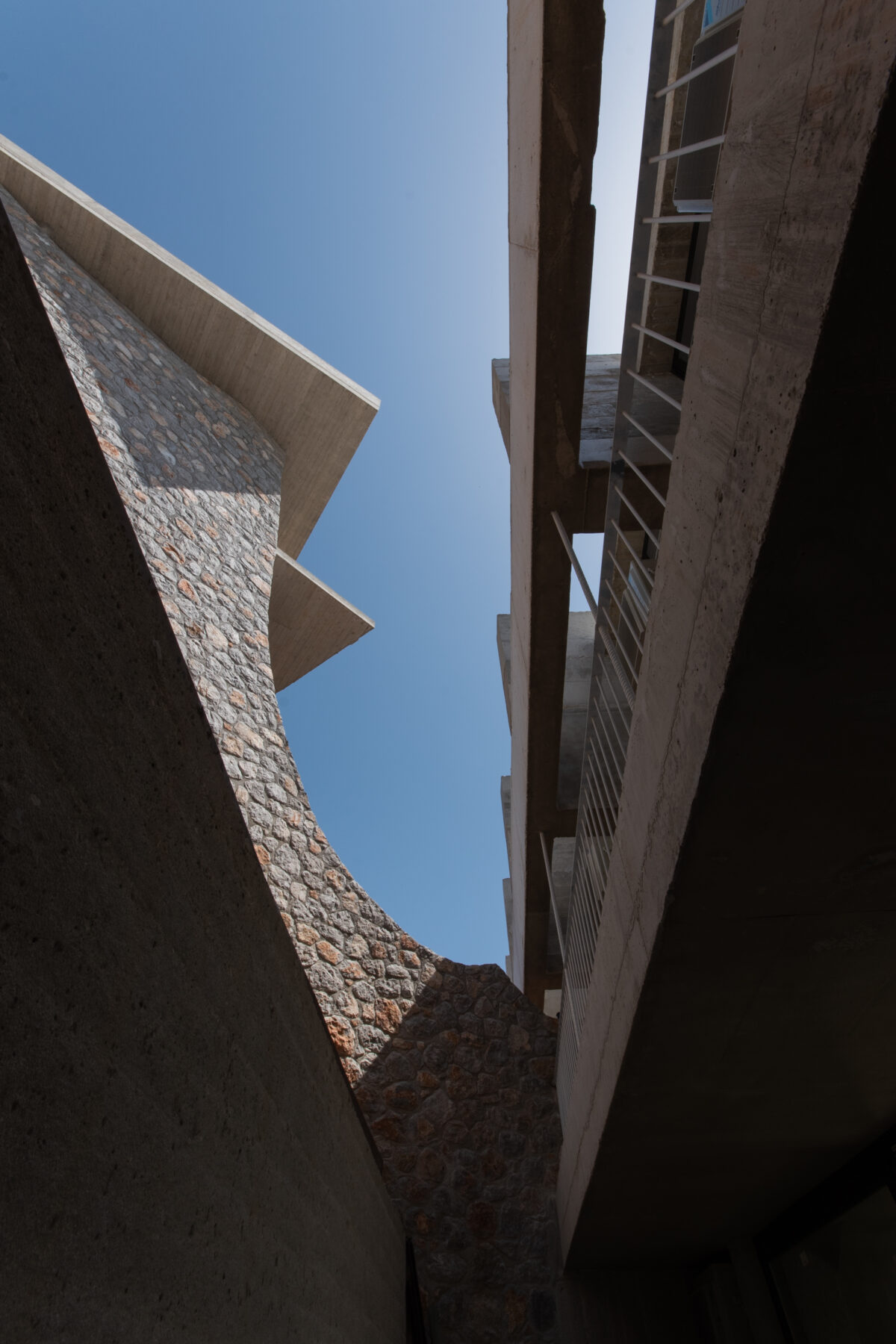 Έτσι, στο διαμορφωμένο έδαφος του οικοπέδου, εναποτίθεται μια μεγάλη μπετονένια κατασκευή, που στεγάζει τον ανοικτό ισόγειο χώρο διημέρευσης των δύο κατοικιών φιλοξενώντας στο εσωτερικό της τις πιο ιδιωτικές λειτουργίες τους. Η κατασκευή αυτή συνδιαλέγεται με τις πέτρινες κυματοειδείς μάντρες, χτισμένες με πέτρες από τις εκσκαφές, οι οποίες αναλαμβάνουν να ορίσουν τους προαύλιους χώρους αλλά και να δημιουργήσουν προθετικά τις άλλες δύο κατοικίες, μέσα από δύο συνεχόμενους ελιγμούς στο νότιο τμήμα και μια κορύφωση στο βορειοδυτικό τμήμα του οικοπέδου.