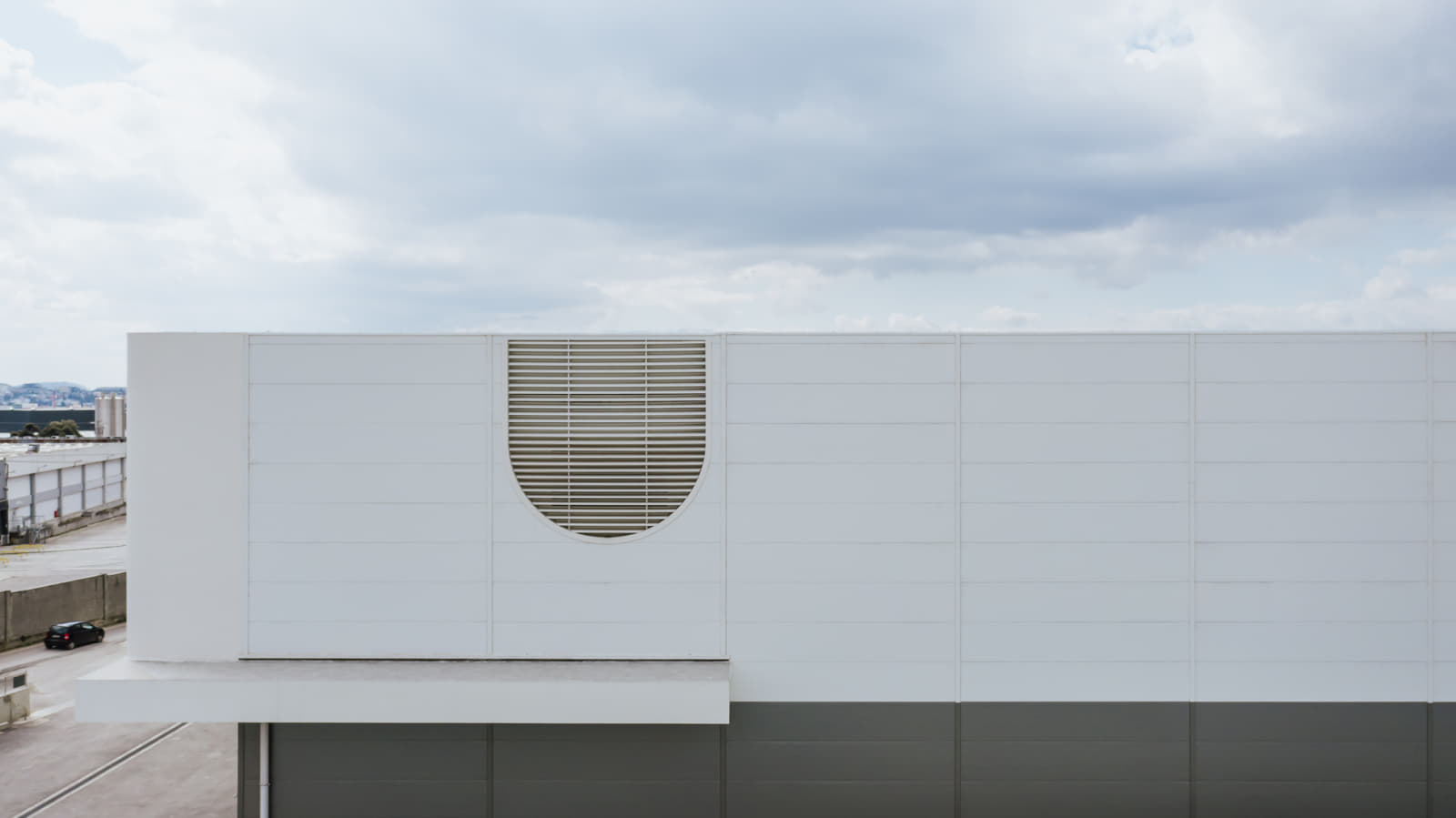 The building is conceived as a monolithic gray mass that is interrupted by a white balcony on the second floor, dividing the structure into two nearly equal parts and distinguishing the different functions inside.