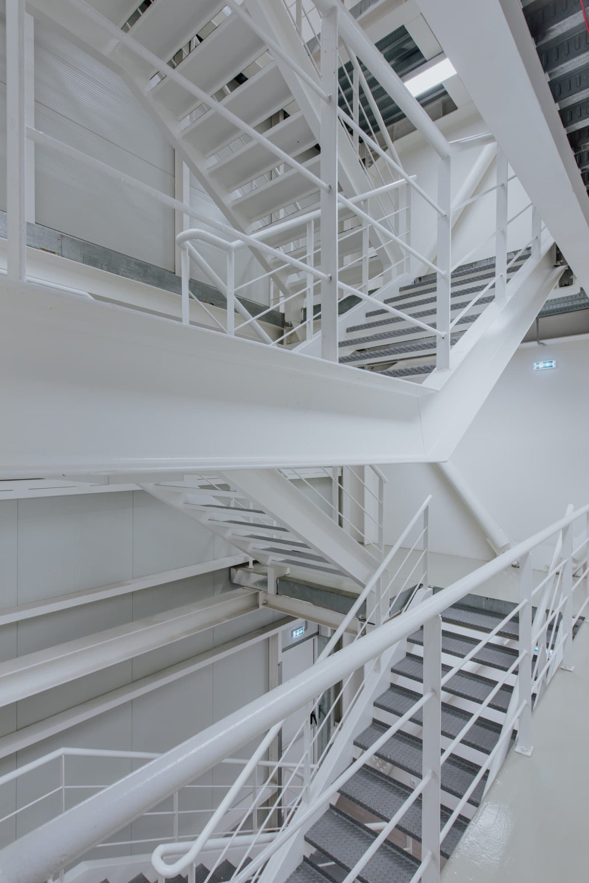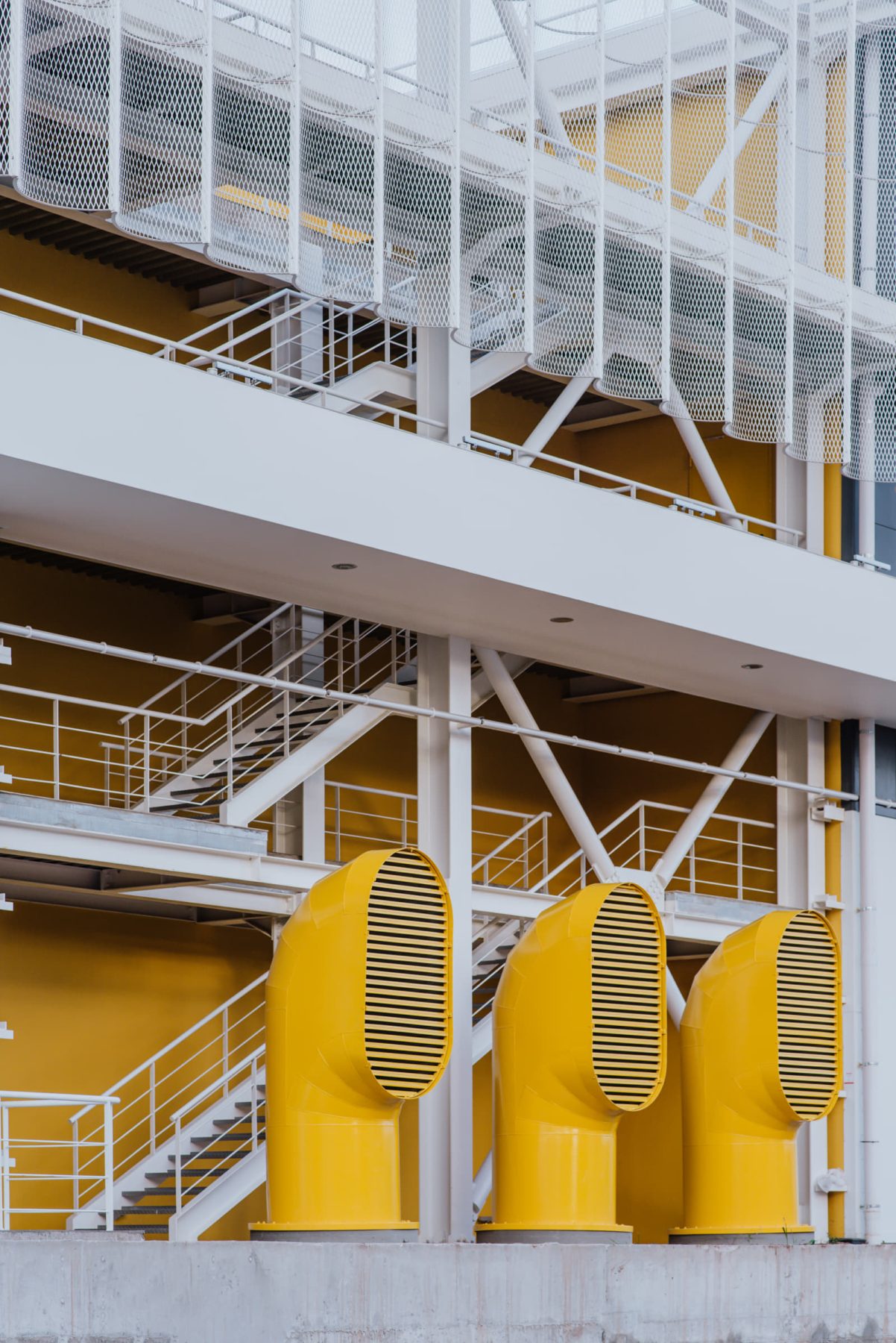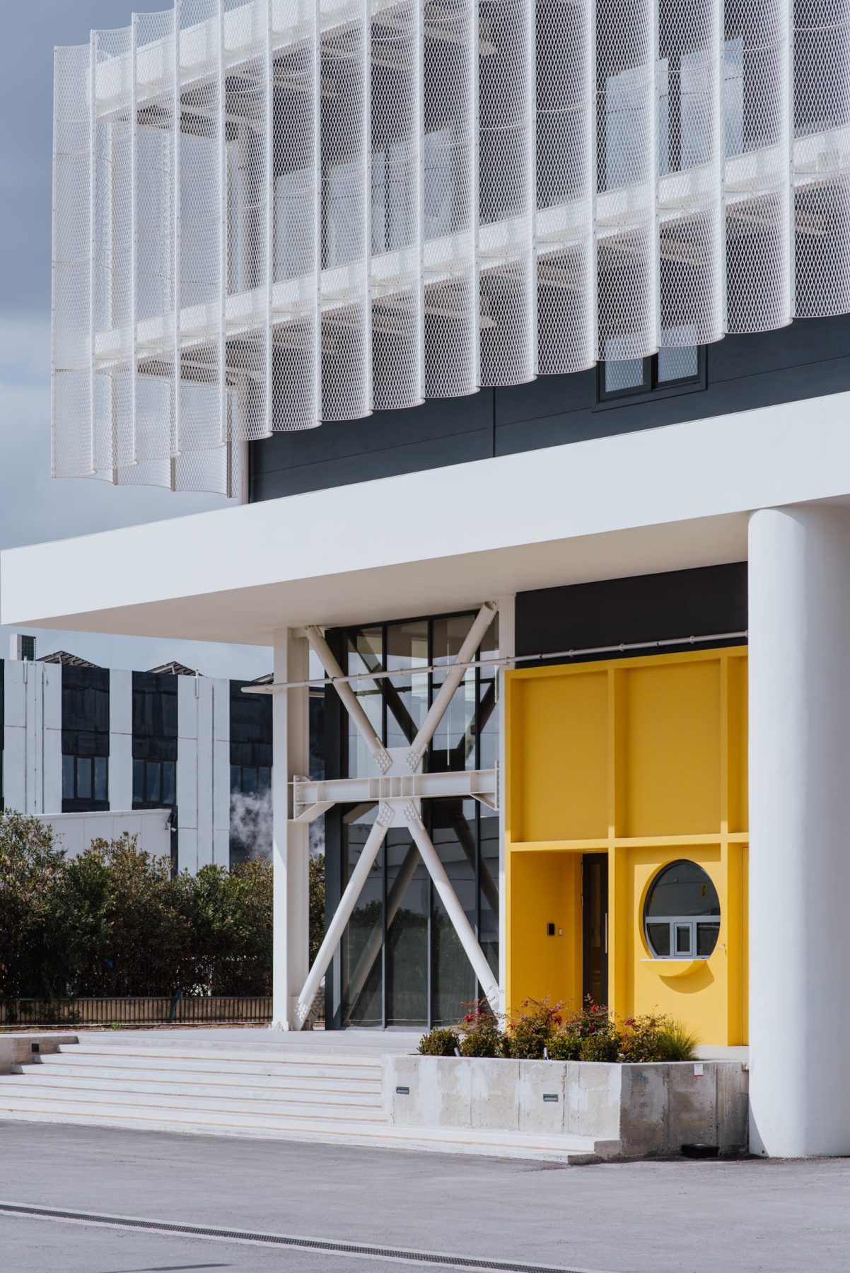 The only exception to the white and gray elements is the yellow colour of the fire escape staircase and the main entrance of the building.
