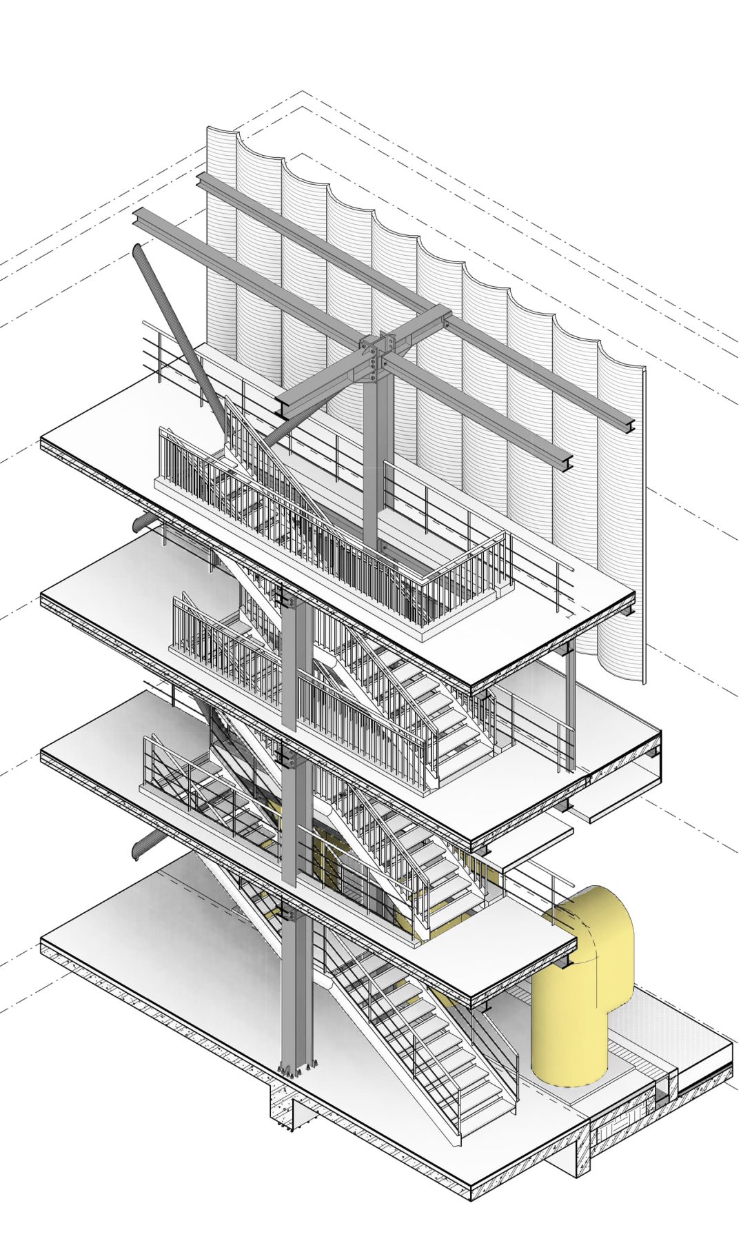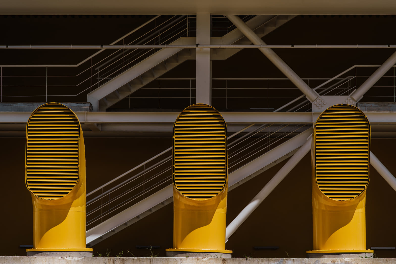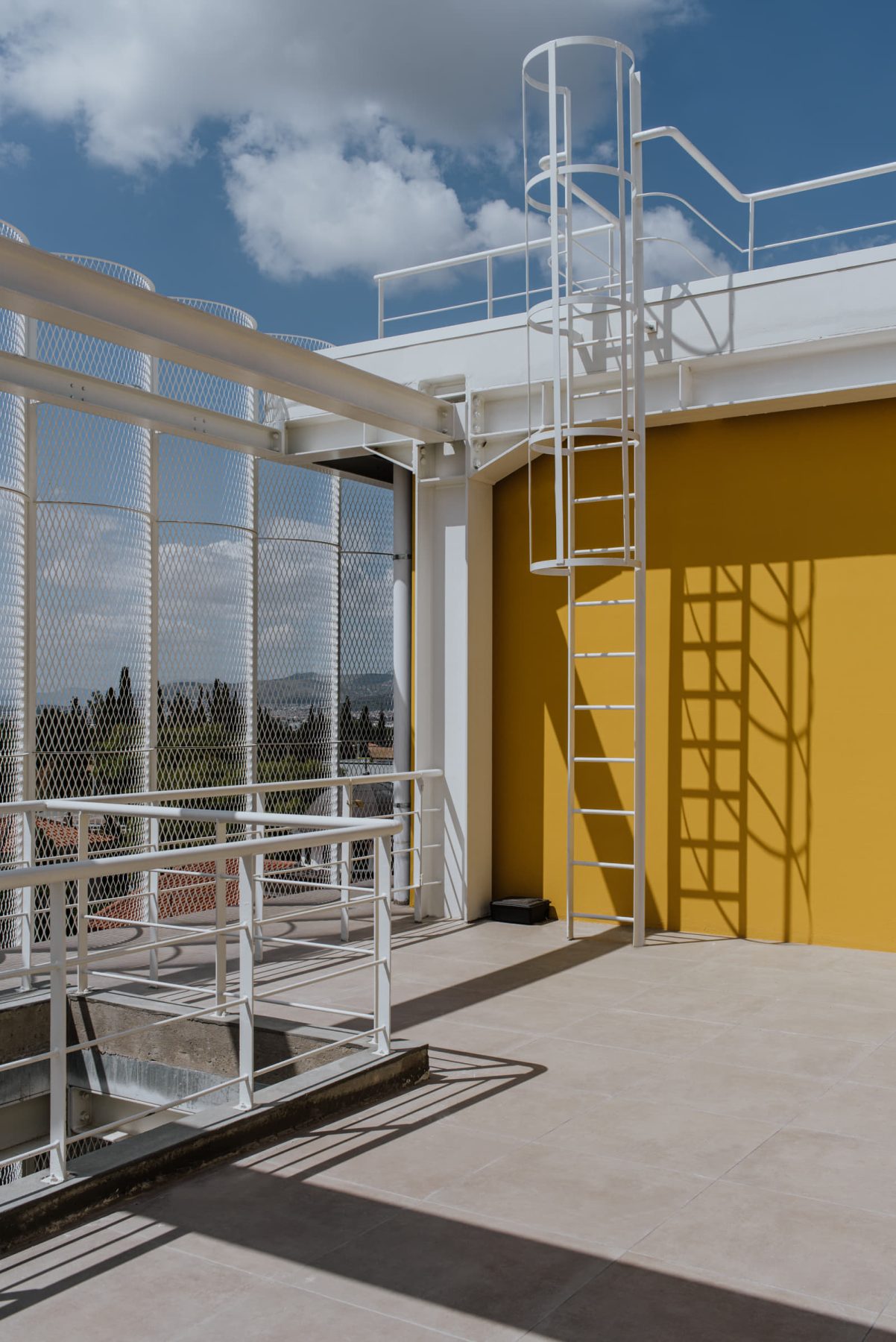 The only exception to the white and gray elements is the yellow colour of the fire escape staircase and the main entrance of the building.