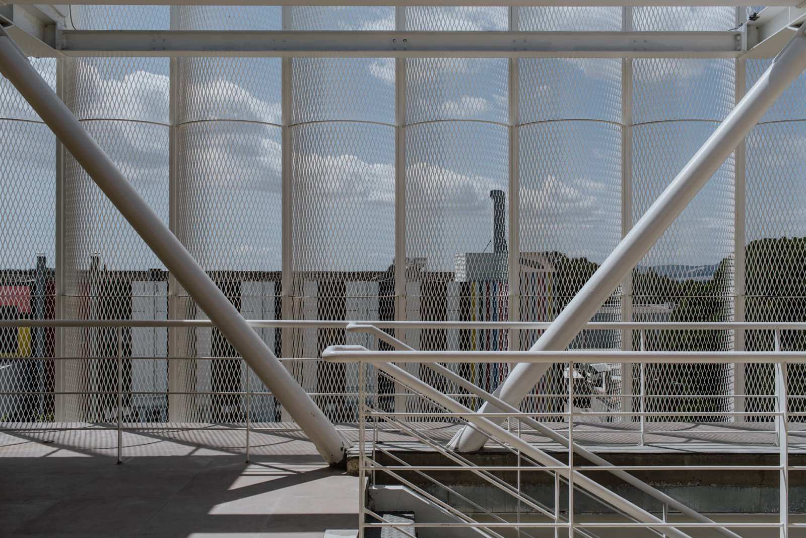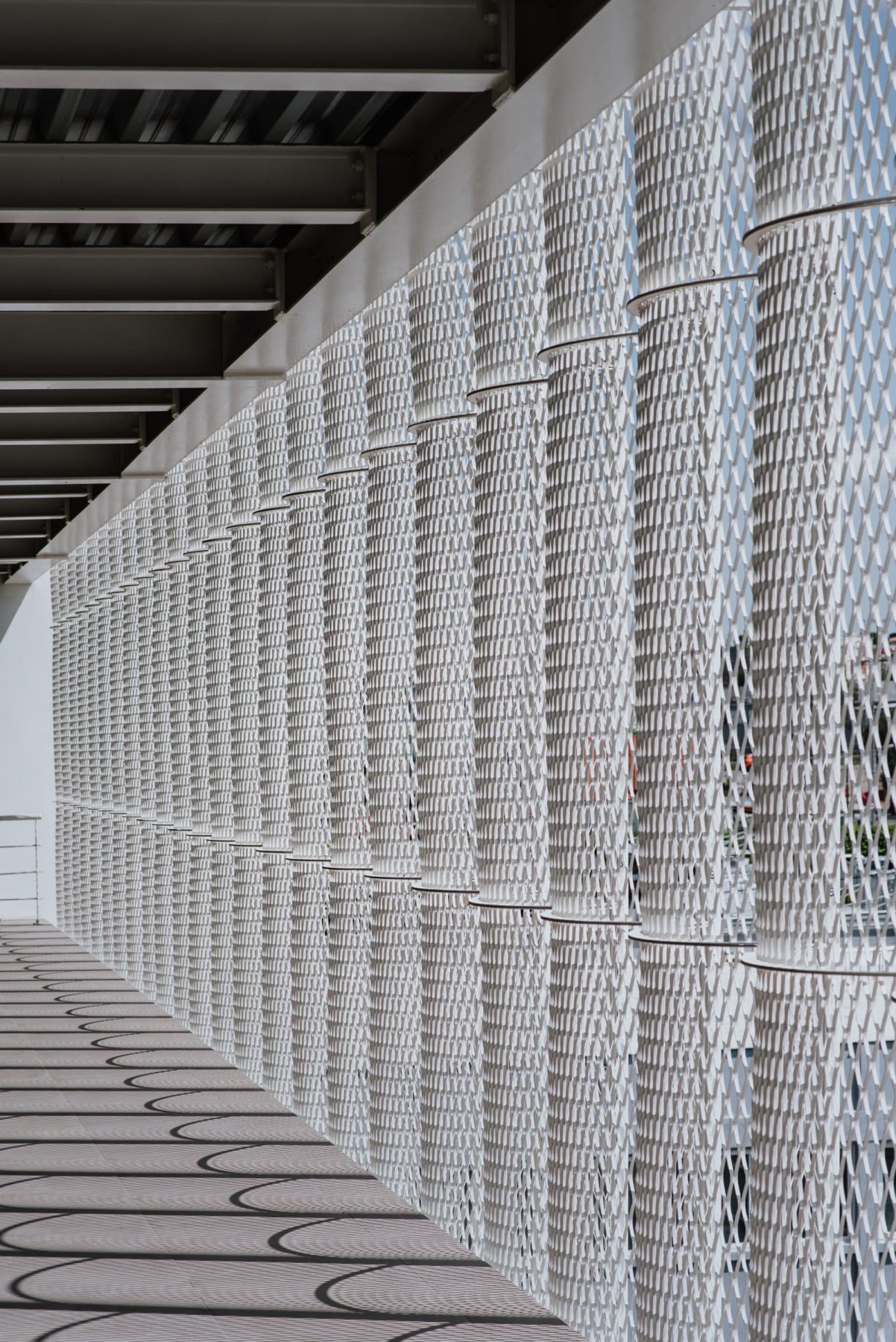 The exterior white, shading system of the southern and western façade creates a homogeneous second skin that hides the complexity of the required openings.