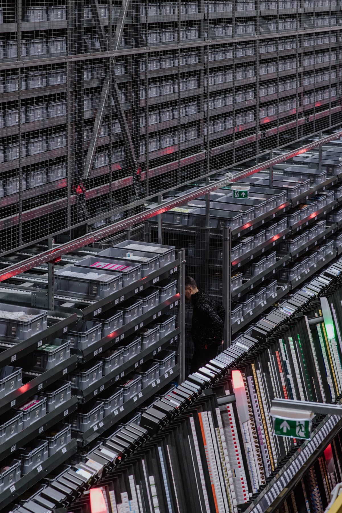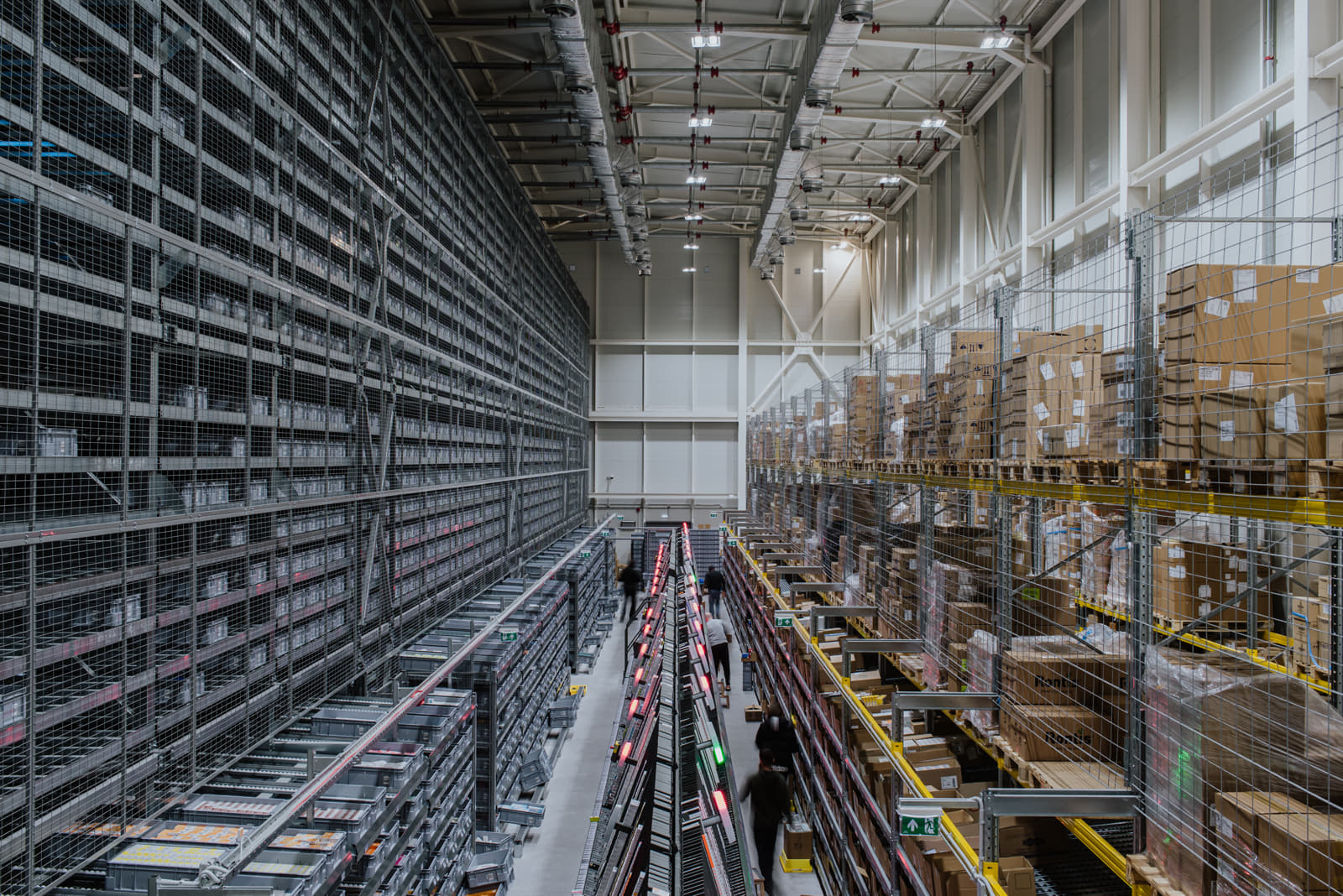 On the second floor, there are also storage spaces and non-automated stations for collecting and packaging goods, mainly for exports and returns.