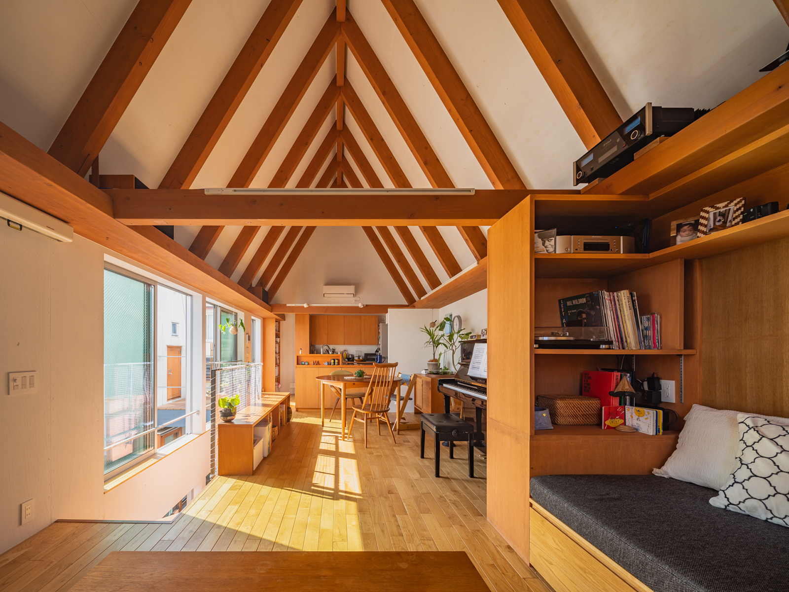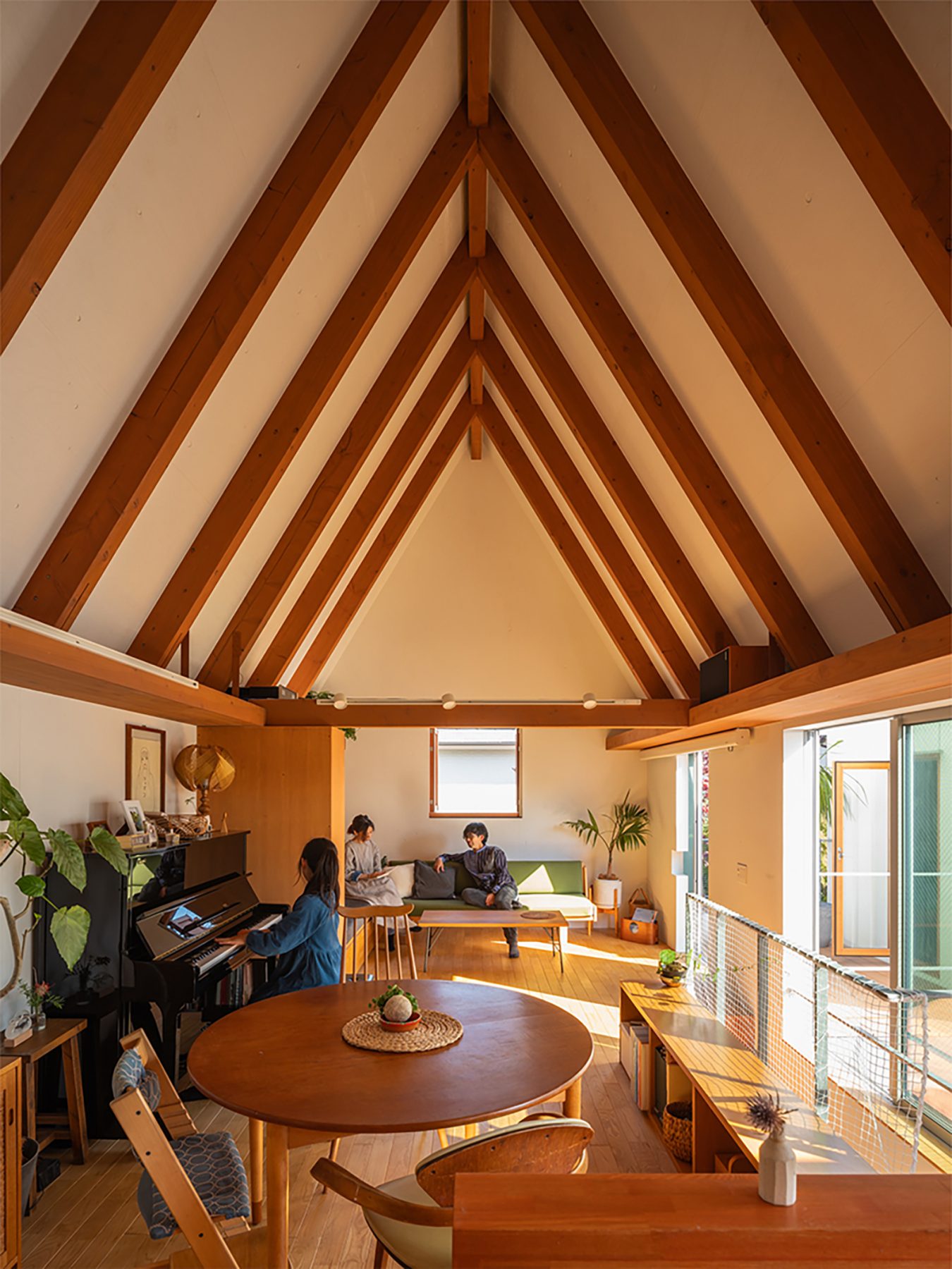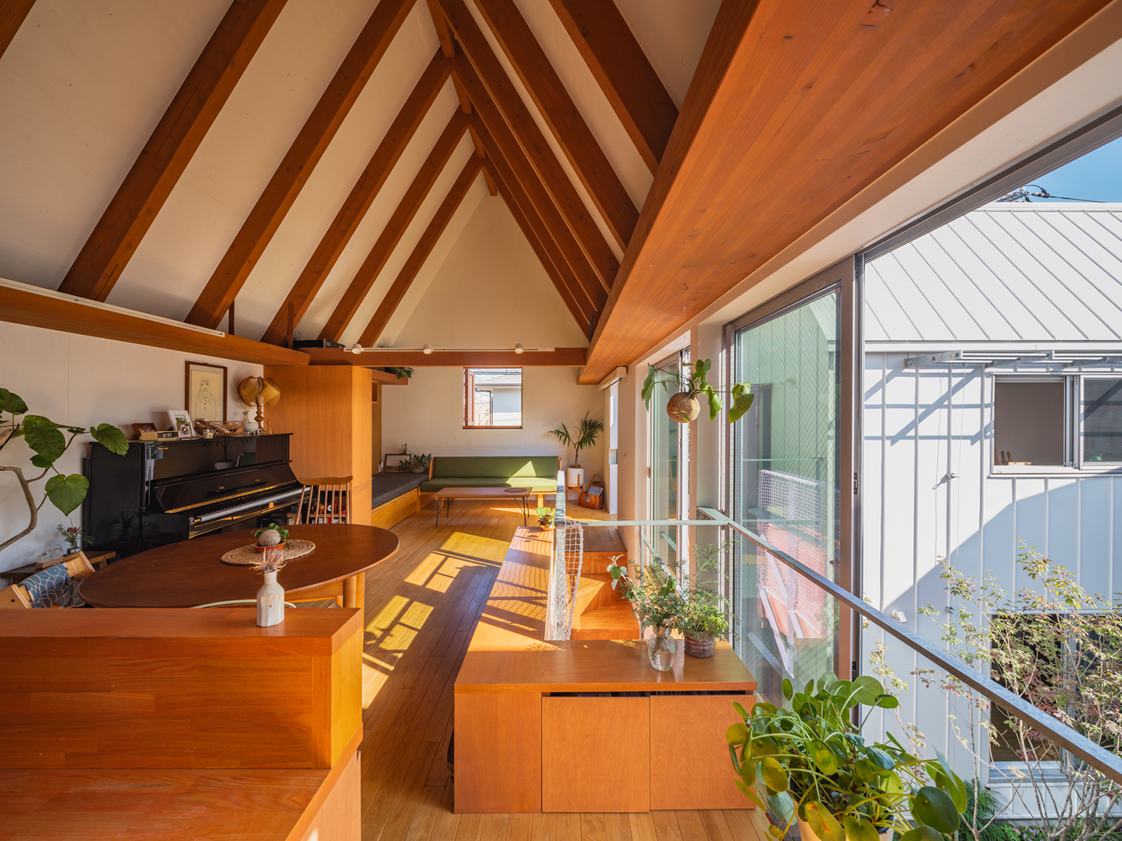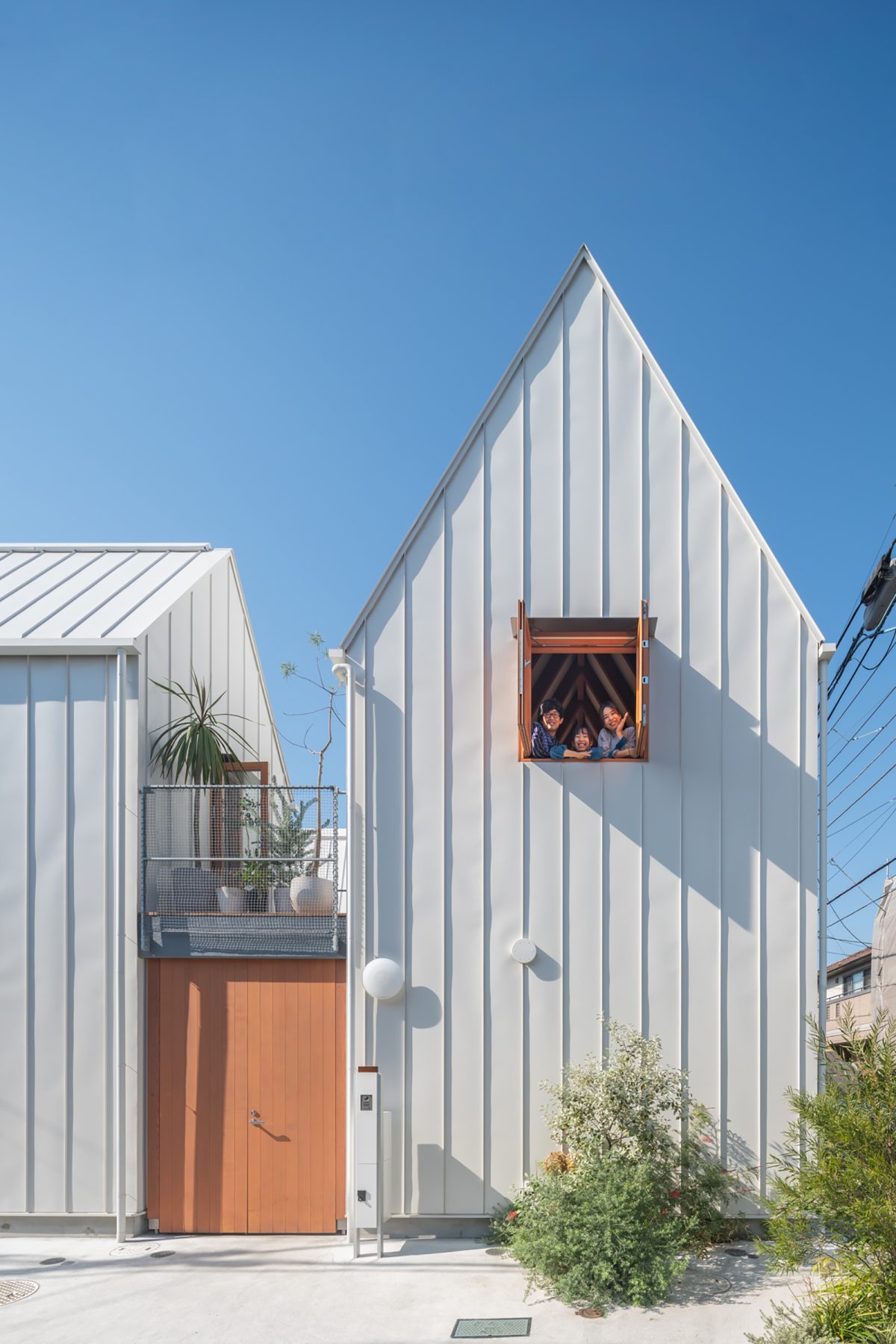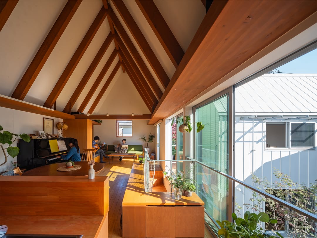 Starting from there, Kaku₋Kaku Kanadel unfolds in the urban landscape of Tokyo as an intimate ecosystem tailored for an everyday life that fosters creativity, self-expression, and playfulness. Takeshi Hosaka’s architectural narrative springs from a family that has learned to live autonomously in order to share life together, forming a permeable home that allows them to exist—and evolve—like this. A father who is also a scriptwriter; a mother who is also an illustrator; and their daughter Haru, an emerging pianist and multidisciplinary talent, inhabit Kaku-Kaku Kanadel through a deliberate dispersal of dwelling into distinct yet interconnected volumes.