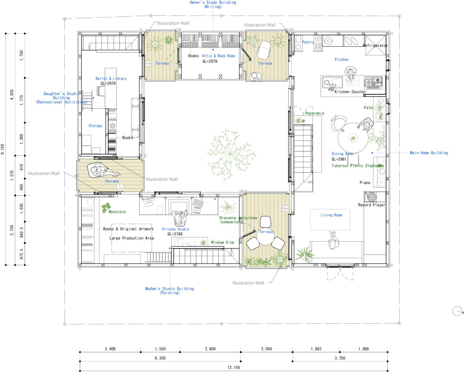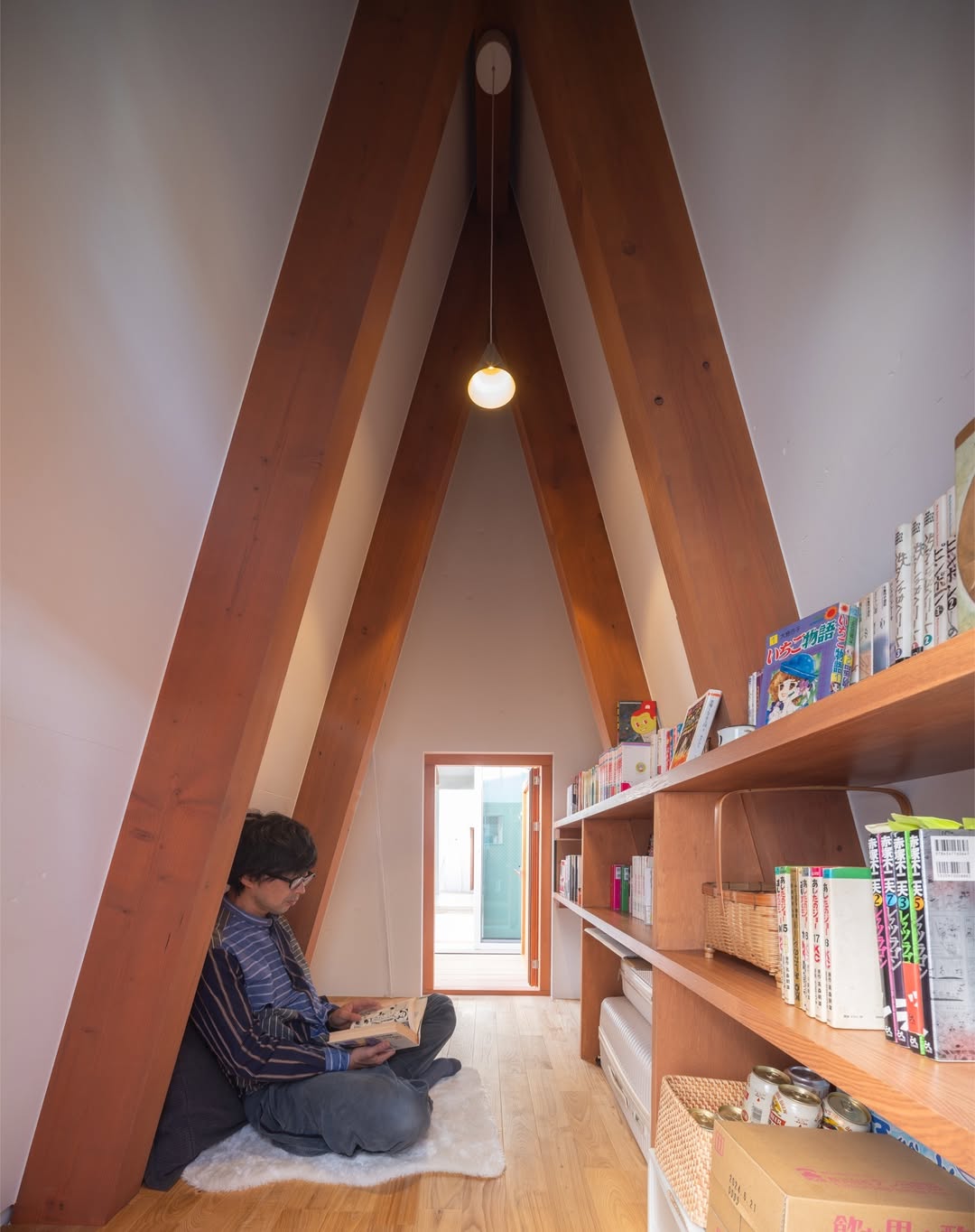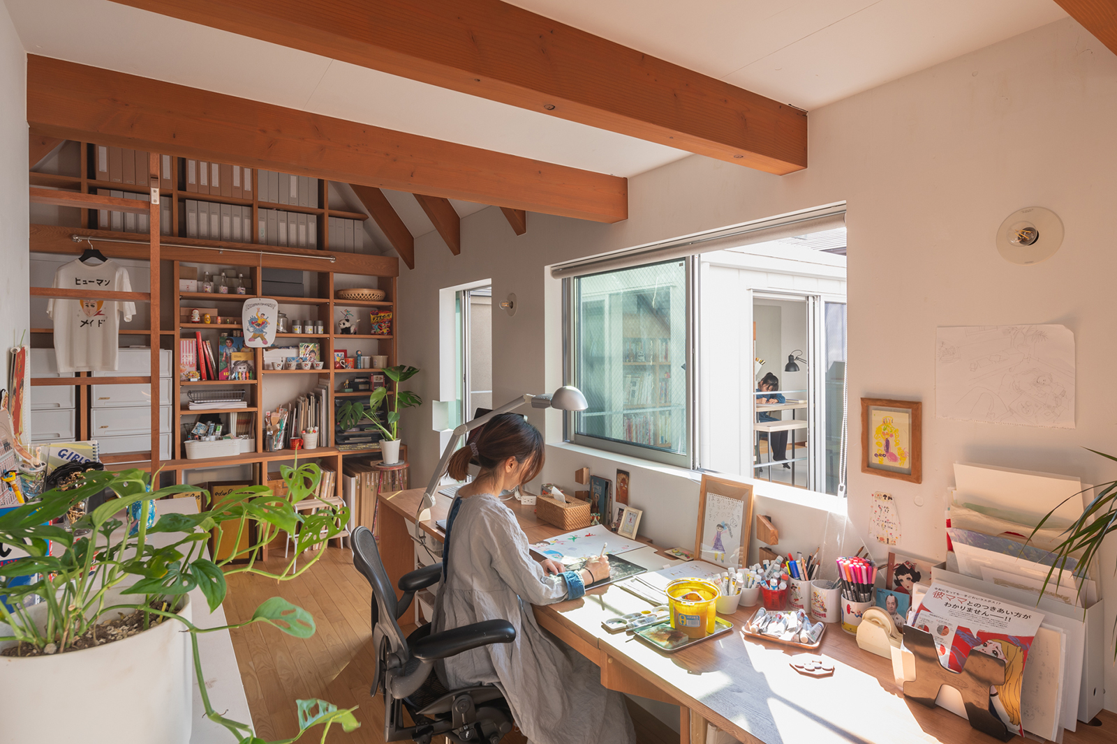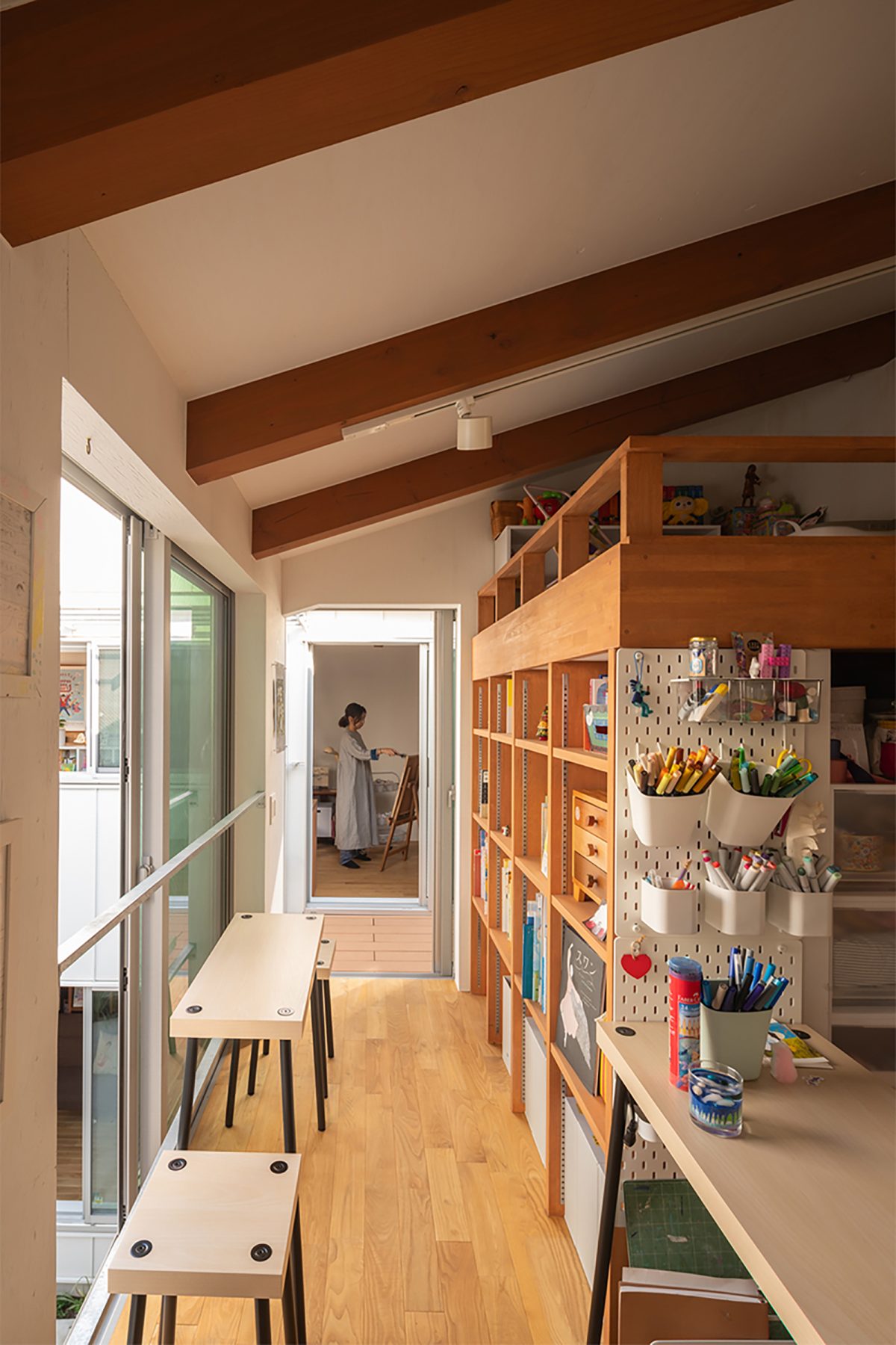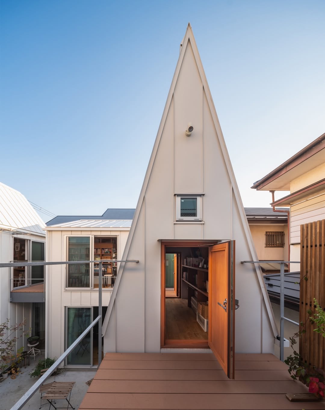 Starting from there, Kaku₋Kaku Kanadel unfolds in the urban landscape of Tokyo as an intimate ecosystem tailored for an everyday life that fosters creativity, self-expression, and playfulness. Takeshi Hosaka’s architectural narrative springs from a family that has learned to live autonomously in order to share life together, forming a permeable home that allows them to exist—and evolve—like this. A father who is also a scriptwriter; a mother who is also an illustrator; and their daughter Haru, an emerging pianist and multidisciplinary talent, inhabit Kaku-Kaku Kanadel through a deliberate dispersal of dwelling into distinct yet interconnected volumes.