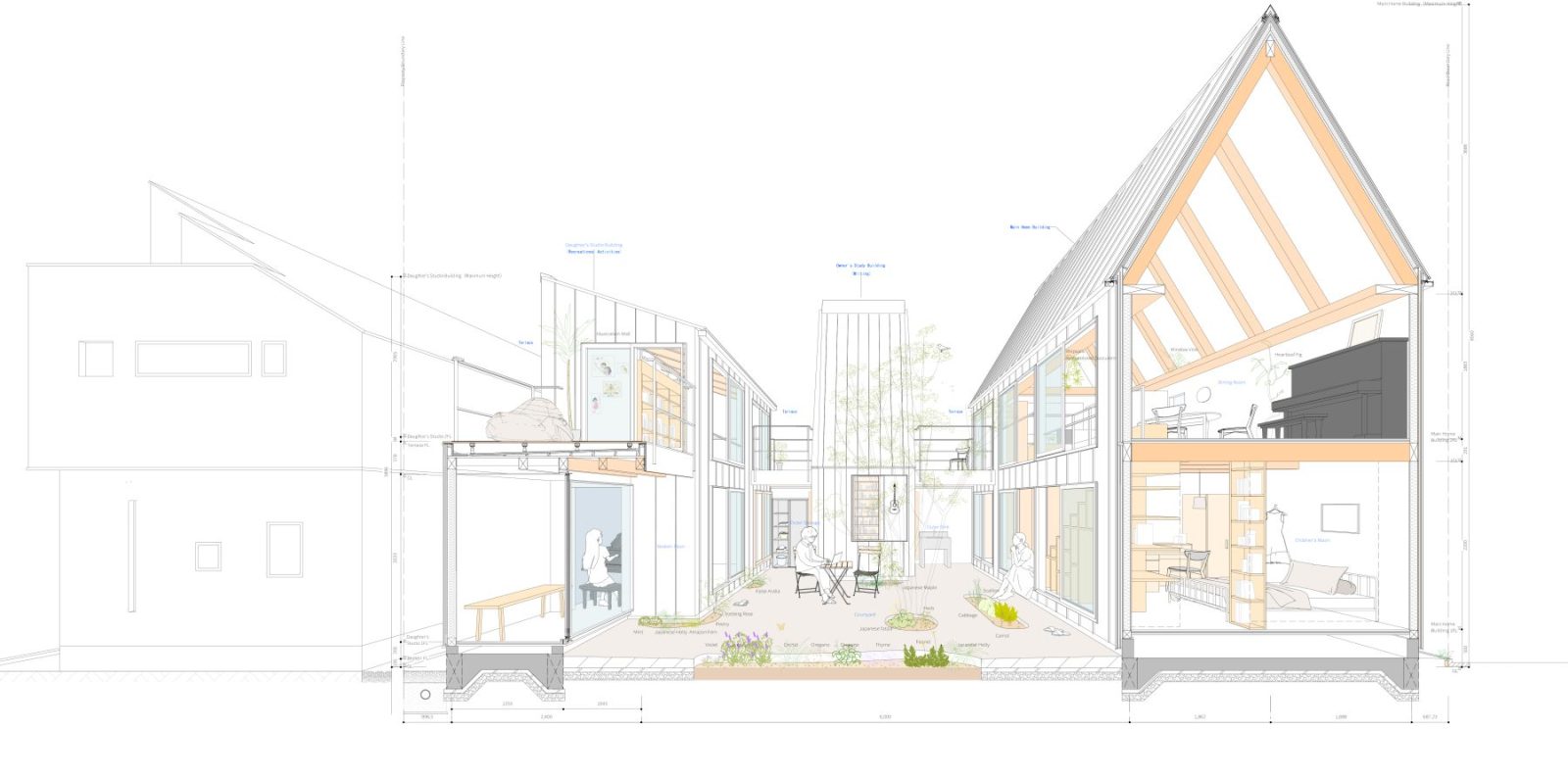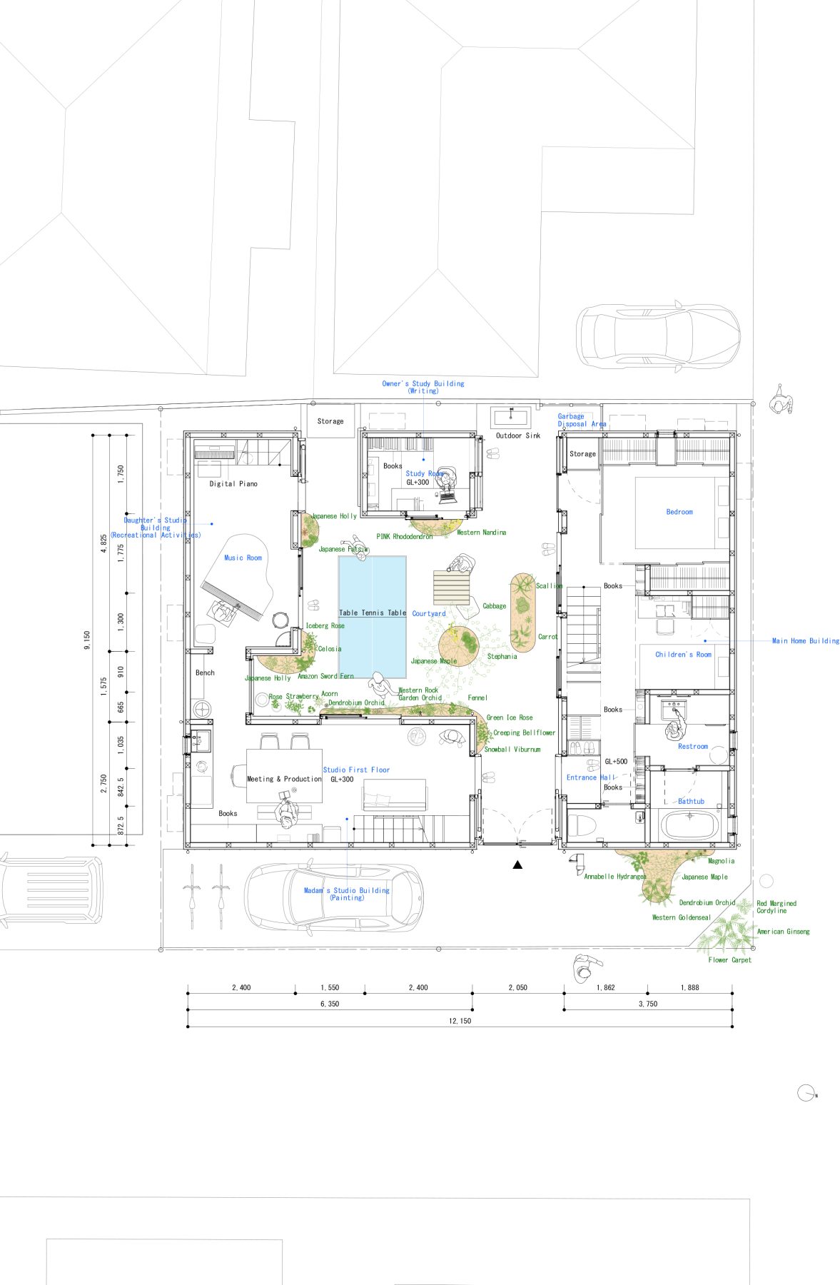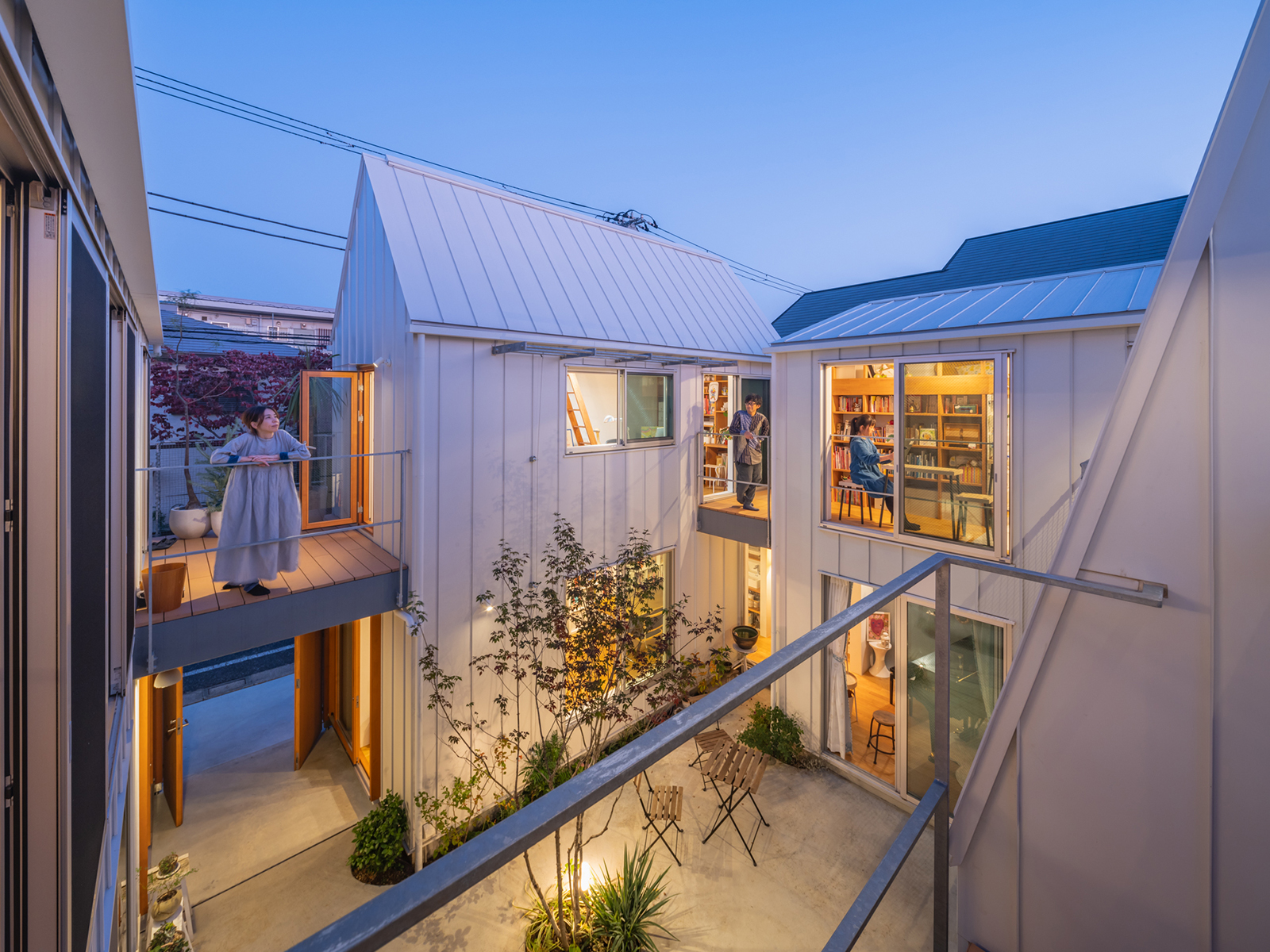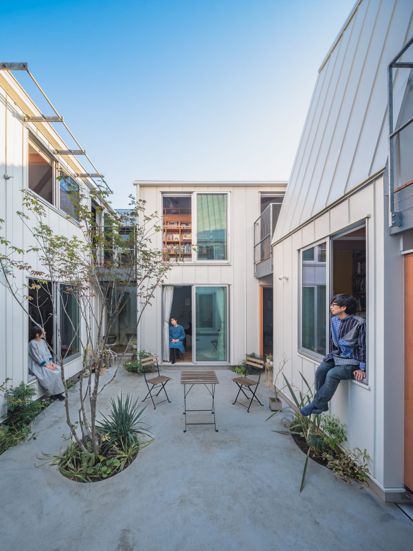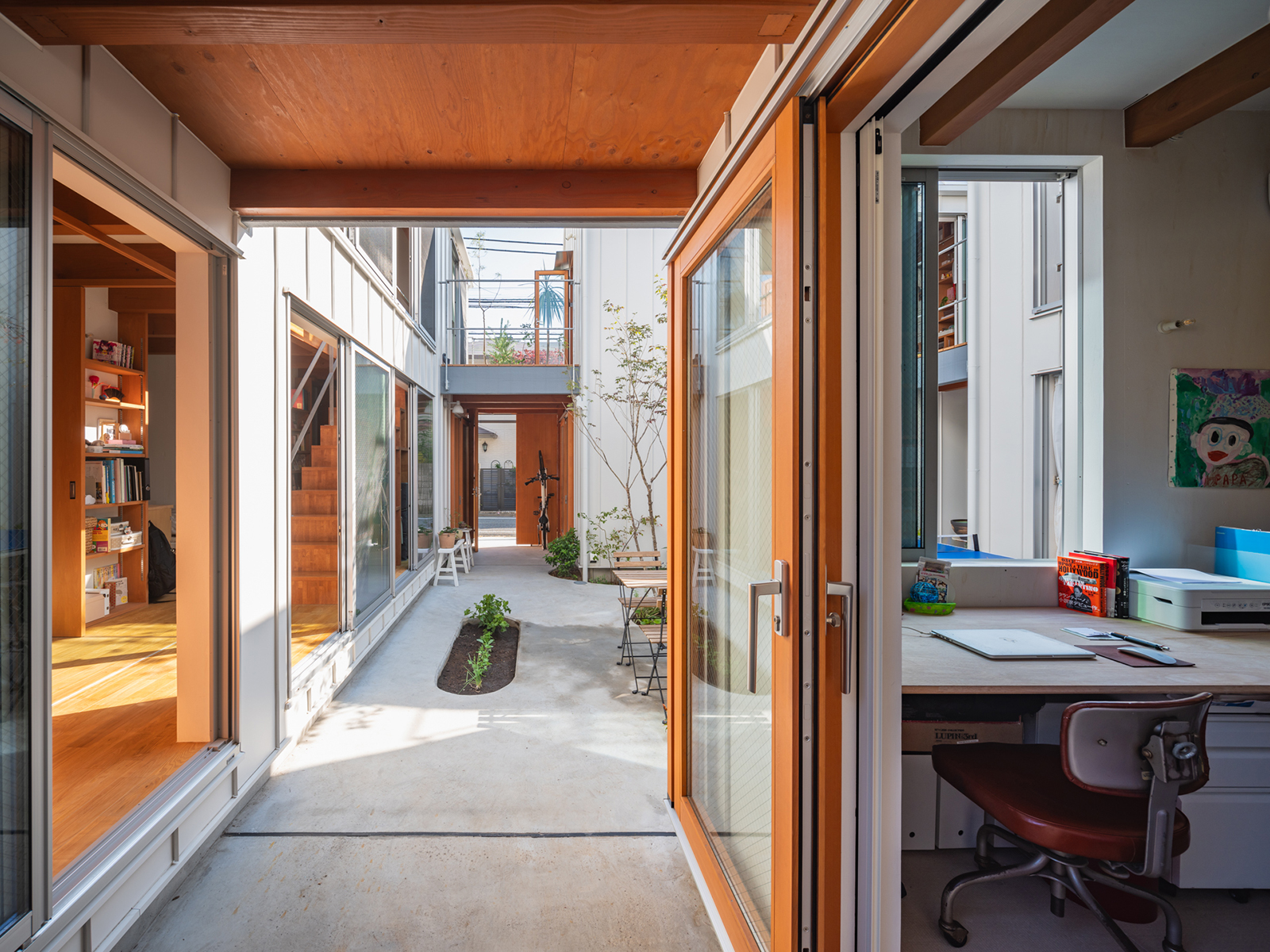 Three independent wings—each dedicated to an individual creative practice—are arranged alongside a shared living space, forming a constellation of four distinct volumes around a central courtyard. Rather than consolidating the family’s everyday life into a unified interior, Hosaka constructs what he describes as a “small village” of domestic life, where separation and encounter coexist through gardens, terraces, and narrow passageways that blur the threshold between inside and outside.