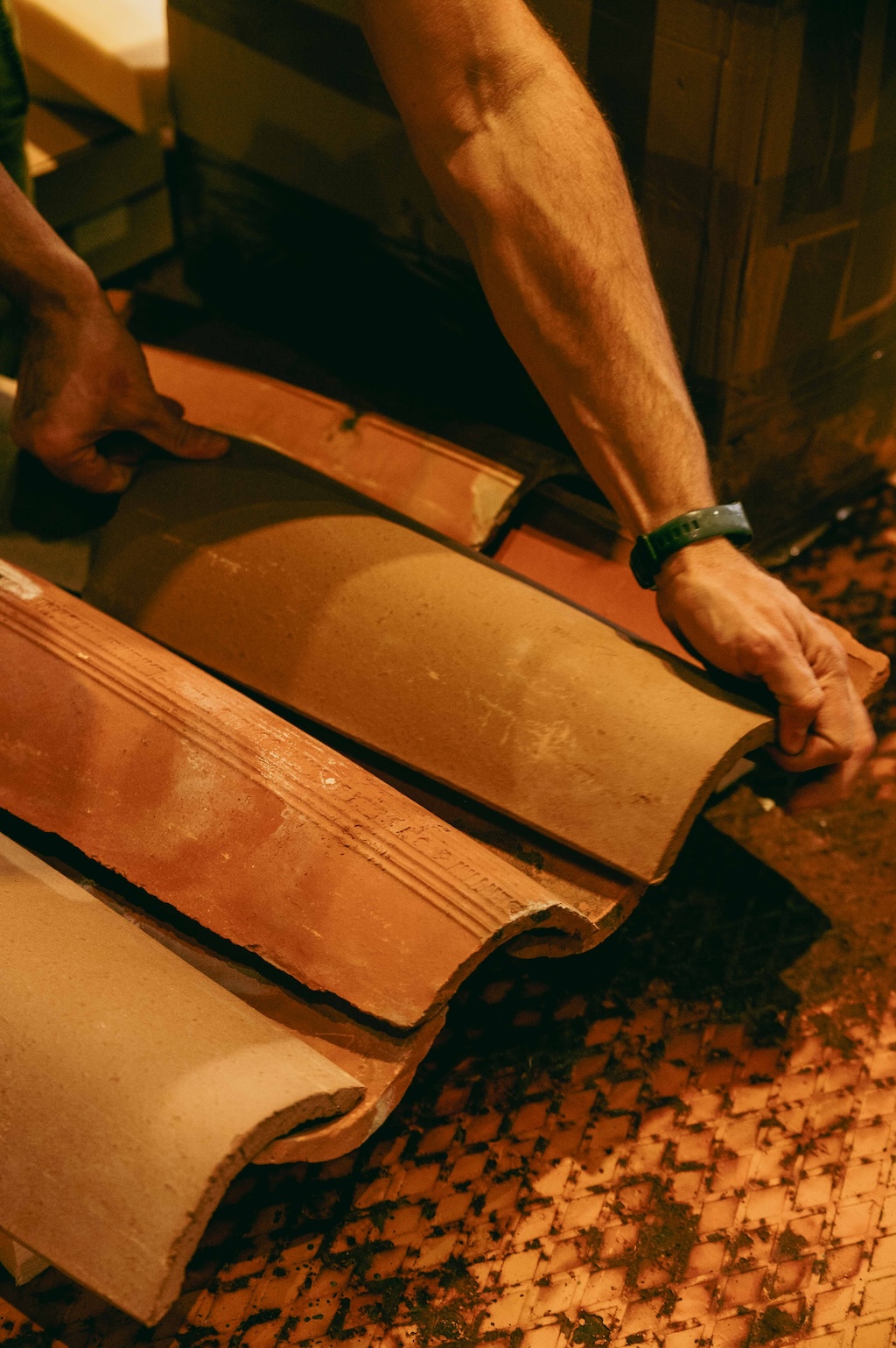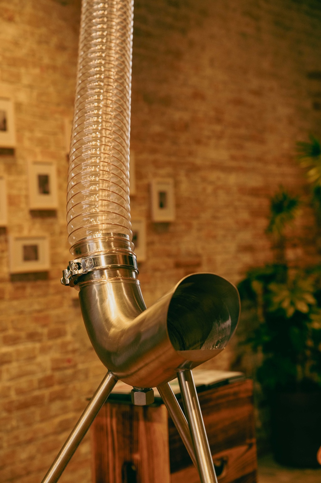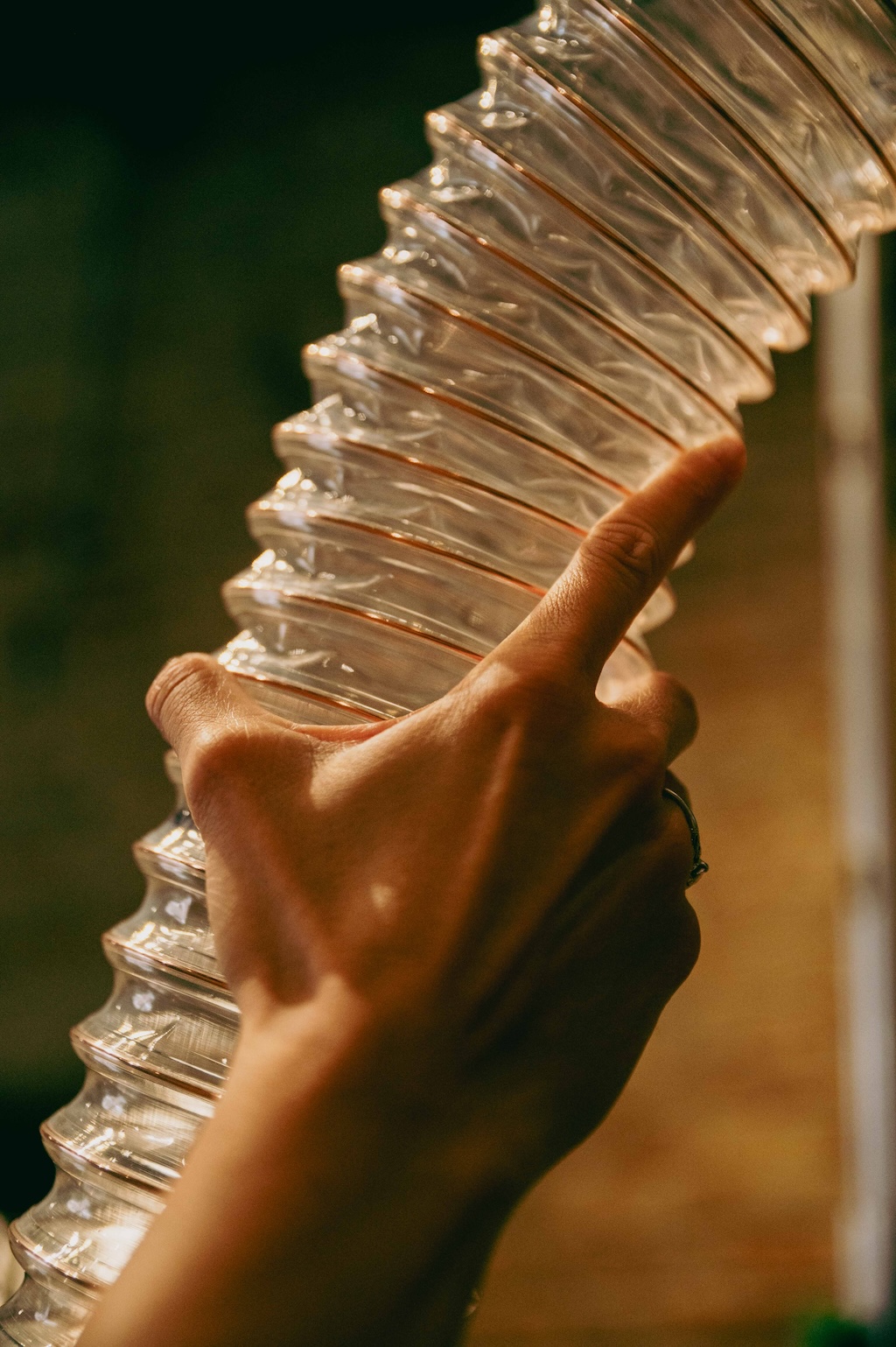 The exhibition also features a contribution by artist Nero / Alessandro Neretti. His work Rain on Skin — visible only from above in the Arzignano residence — is represented here at full scale by a limited-edition roof tile, displayed on workshop trolleys. The roofing system, with its distinctive device for collecting and channeling rainwater, is further illustrated by a 1:1-scale section of the transparent downspout, shown in the garden.