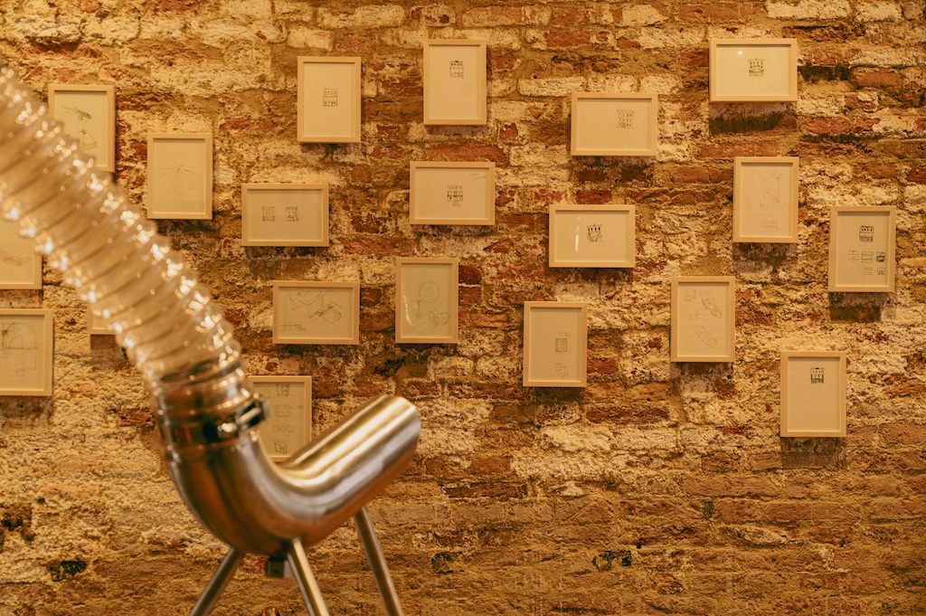 Located on the ground floor of the historic Ca’ Da Mosto, within the ancient Sotoportego del Traghetto connecting the courtyard to the Grand Canal in Venice, the exhibition documents the evolving process behind 1:1 Study Model. At the entrance, a model introduces the home’s central spatial device — a helical staircase, spray-painted silver and culminating in a small dome. The staircase becomes both instrument and mediator, while the model as a whole reveals the project’s layers, discoveries, and on-site improvisations.