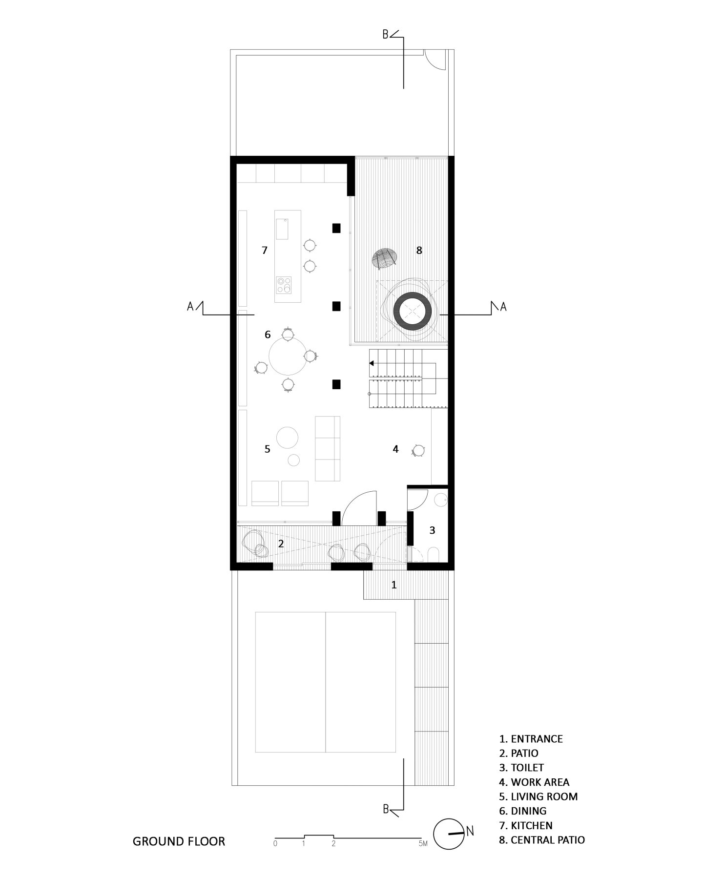 Το δεύτερο αίθριο, που χαρακτηρίζεται από την αρχιτεκτονική μελέτη ως κεντρικό, τοποθετείται στην καρδιά της ιδιωτικής σφαίρας της κατοικίας λειτουργώντας ως αγωγός σύνδεσης του σπιτιού με την αστική ζωή της πόλης και τα στοιχεία της φύσης. Το φαινόμενο της καμινάδας επιτρέπει, μέσω του κεντρικού αιθρίου, το δροσισμό των εσωτερικών χώρων με διαμπερή αερισμό, λούζοντάς τους, ταυτόχρονα, με άπλετο φυσικό φως. Στο ισόγειο, το κεντρικό αίθριο εφάπτεται με την πίσω όψη της κατοικίας δίνοντας πρόσβαση στο πεδίο της πόλης μέσω της πίσω αυλής. Σε άμεση επαφή και διάδραση με τους βασικούς χώρους διημέρευσης, την κουζίνα, την τραπεζαρία και το καθιστικό, ο χαρακτήρας του κεντρικού αιθρίου ορίζεται από το φυτεμένο μαστιχόδεντρο, πλαισιωμένο από κυκλική καθιστική επιφάνεια, που λειτουργεί ως το νέο τοτέμ του σπιτιού – σύμβολο της συλλογικής του ταυτότητας.