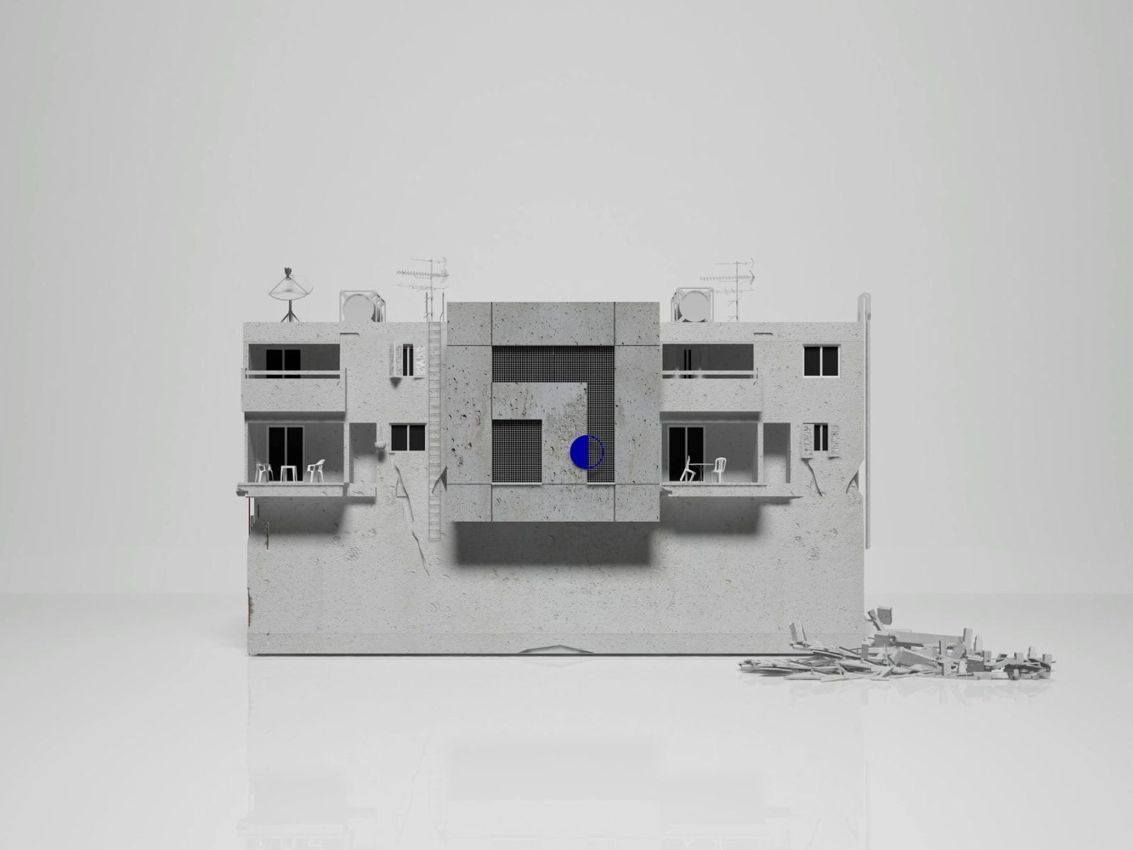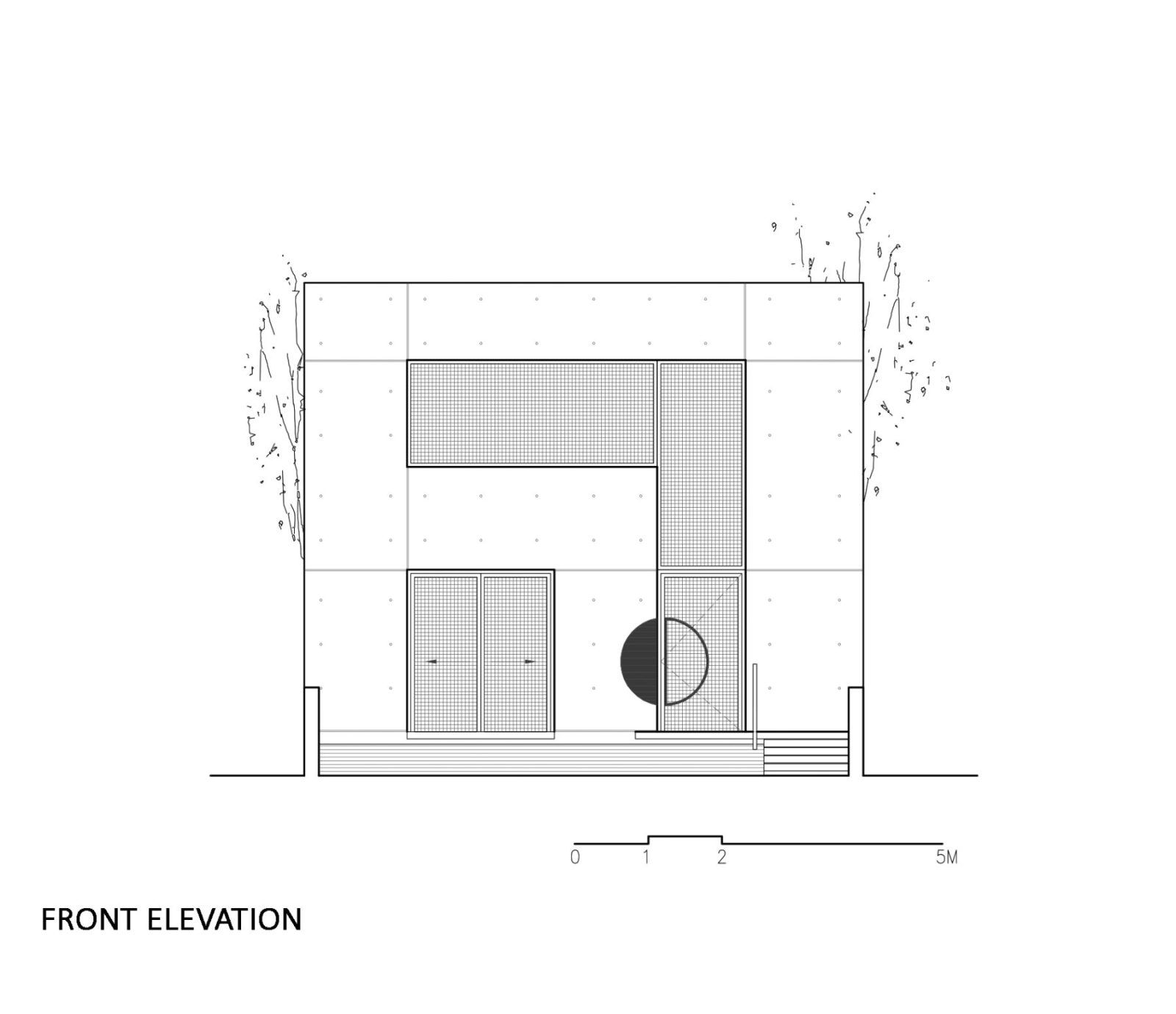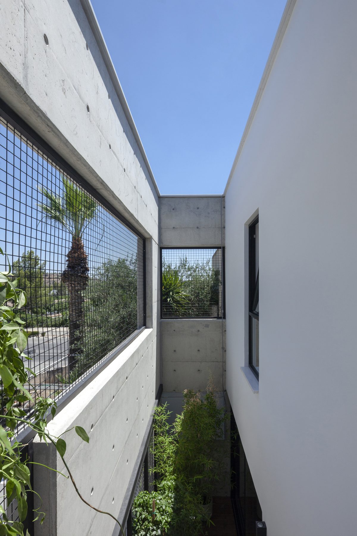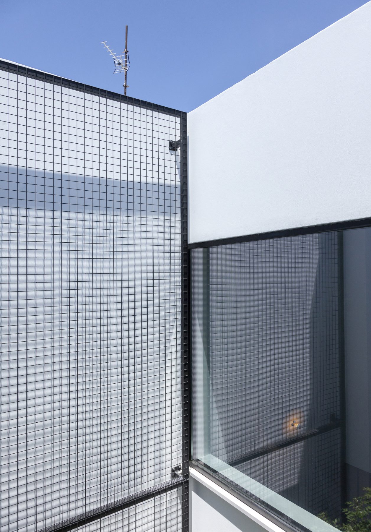 «Πρόκειται για ένα τείχος από εμφανές μπετόν, λαξευμένο με οπές που συμπληρώνονται με μεταλλικές σχαροειδείς επιφάνειες. Τα κενά και τα πλήρη του παραβάν ελέγχουν τη διέλευση του φωτός και του αέρα στο εσωτερικό της κατοικίας, προσφέρουν διαβαθμίσεις ιδιωτικότητας και ποικιλία οπτικών φυγών. Αναπτύσσεται ένας ανοικτός διάλογος μεταξύ κατοικίας και αστικού τοπίου που άλλοτε καδράρει σκηνές από την καθημερινότητα του συνοικισμού και άλλοτε προβάλλει σκηνογραφικά, στιγμιότυπα από τη ζωή της οικογένειας», επισημαίνει ο αρχιτέκτονας.