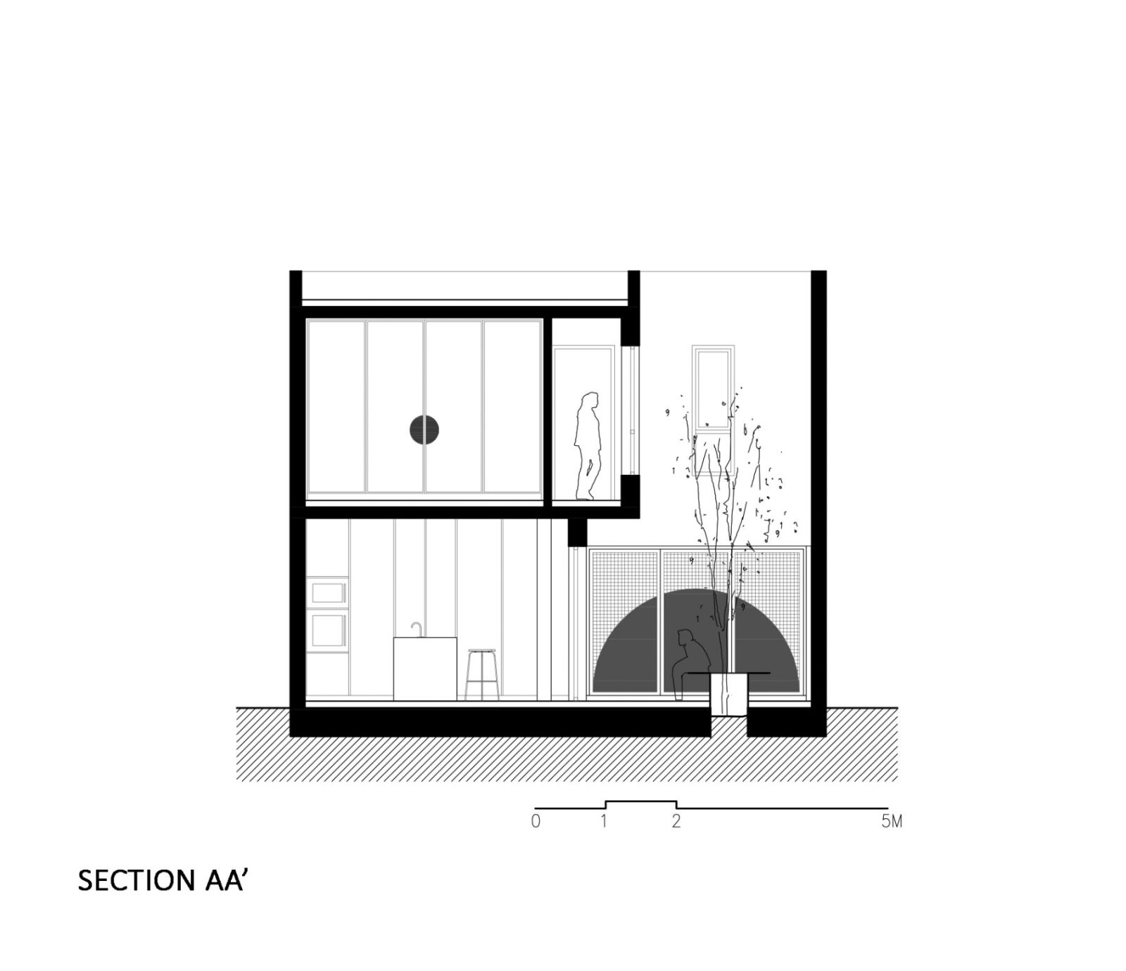 The second, central atrium lies at the heart of domestic life, connecting the house to the city and to nature. Through the chimney effect, it cools interiors with cross-ventilation while bathing the spaces in sunlight. A mastic tree, framed by a circular seating area, becomes the totem of the home, a living symbol of its collective identity and rootedness in the local community.
