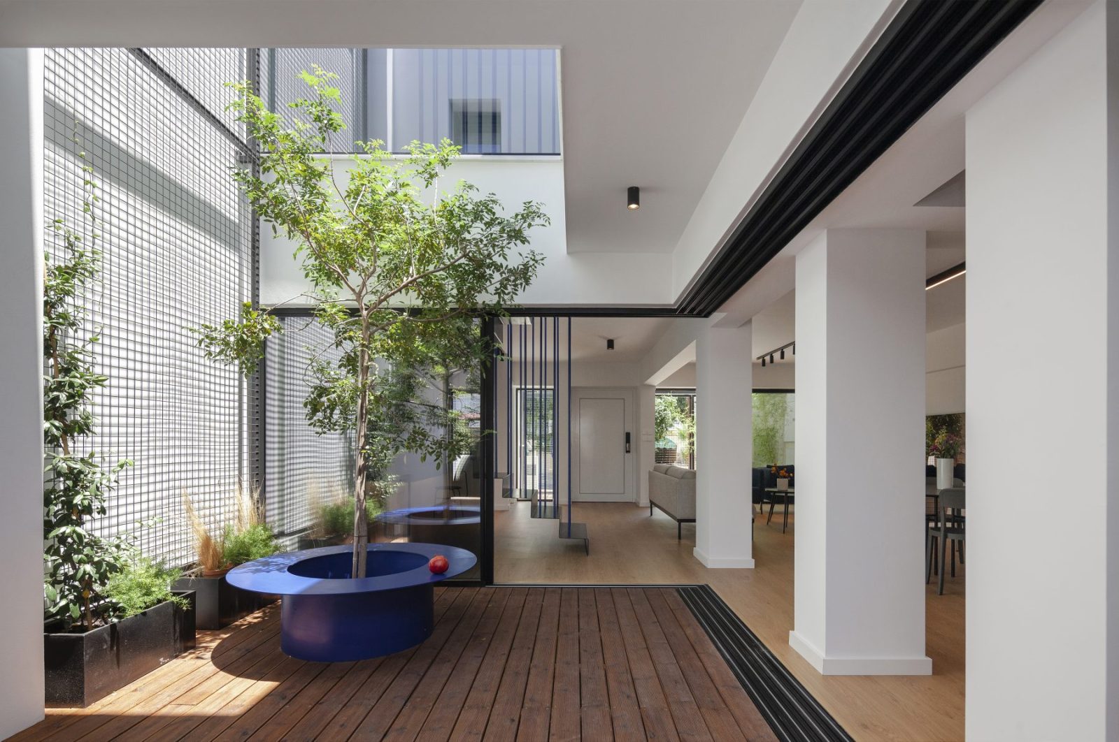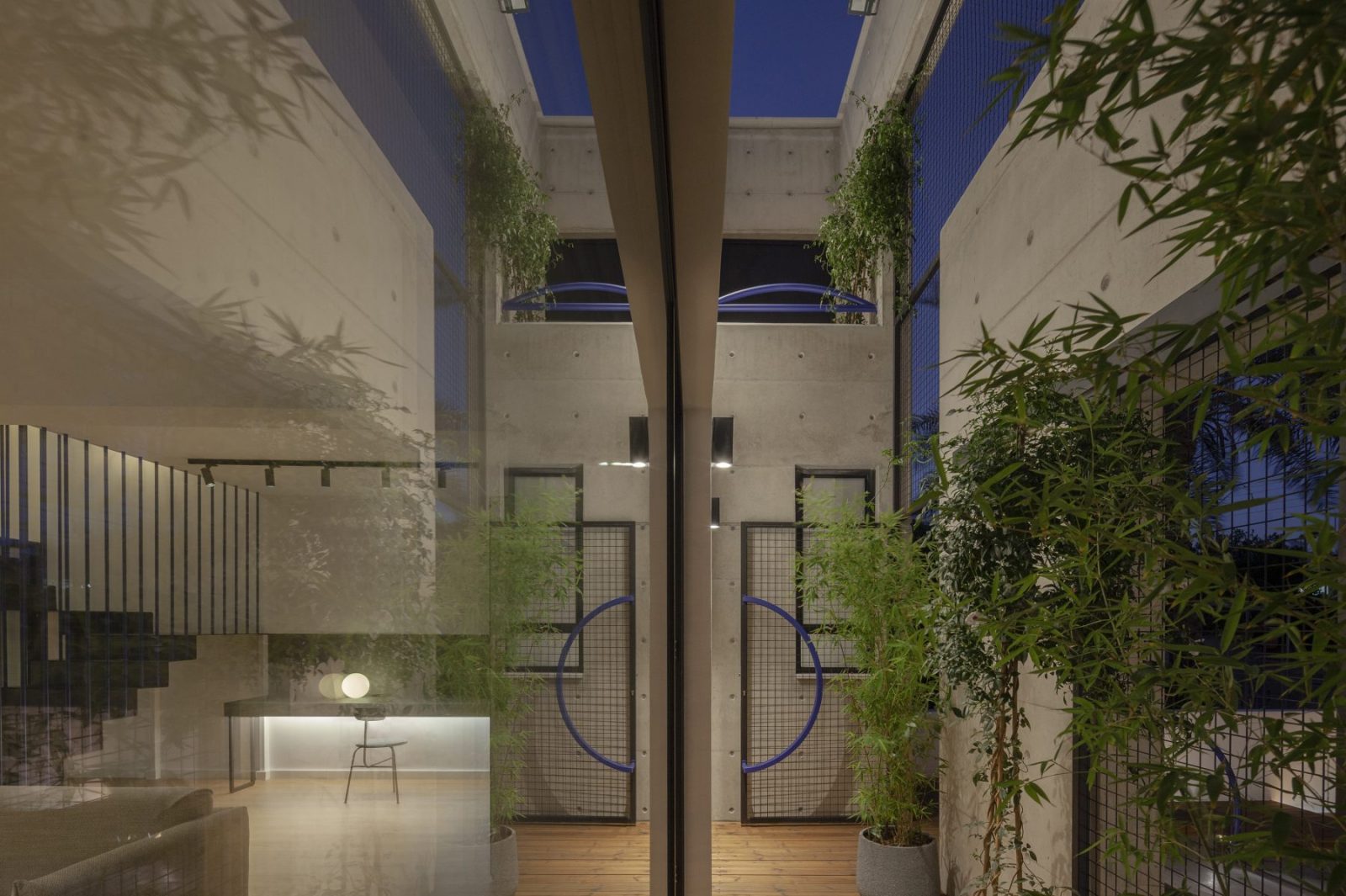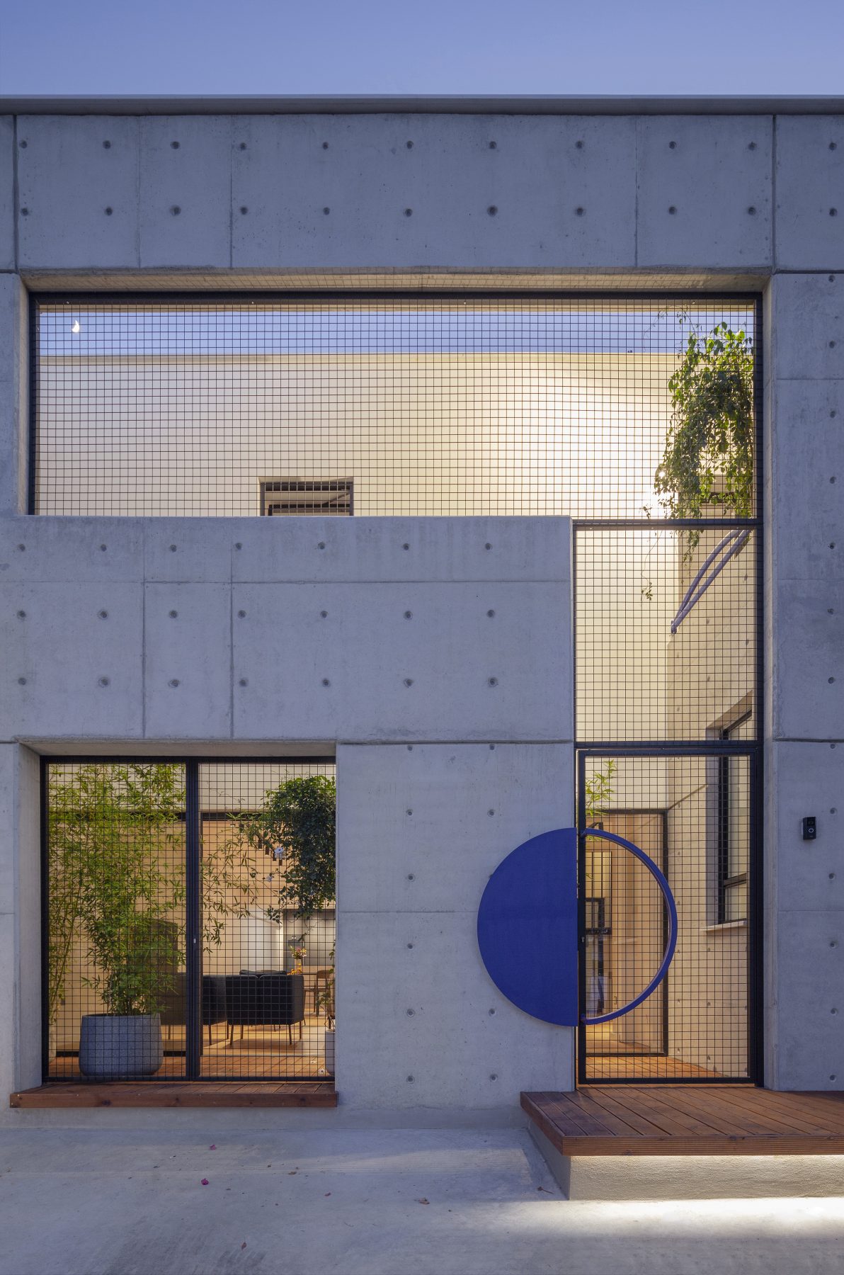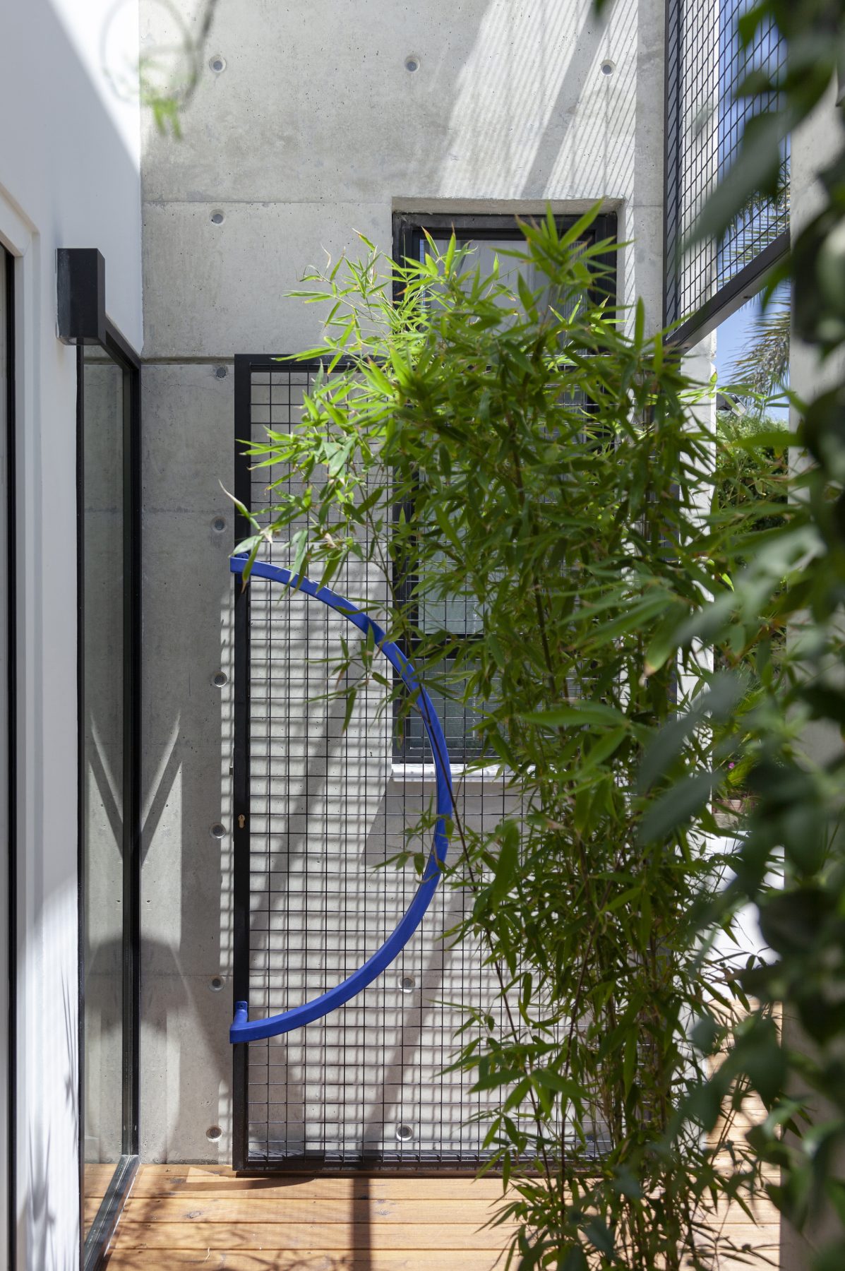 The first atrium works as a threshold greeting visitors at the main entrance, in dialogue with the new façade of exposed concrete. A vertical screen, 6.3 m high, enriched with luminous electric blue details, stands 1.3 m ahead of the pre-existing structure, crafting a protected open-air space under the sky. Here, the architecture orchestrates a poetic transition between old and new, urban and domestic, private and public, inside and outside.