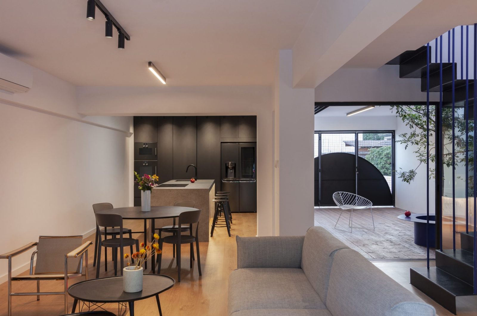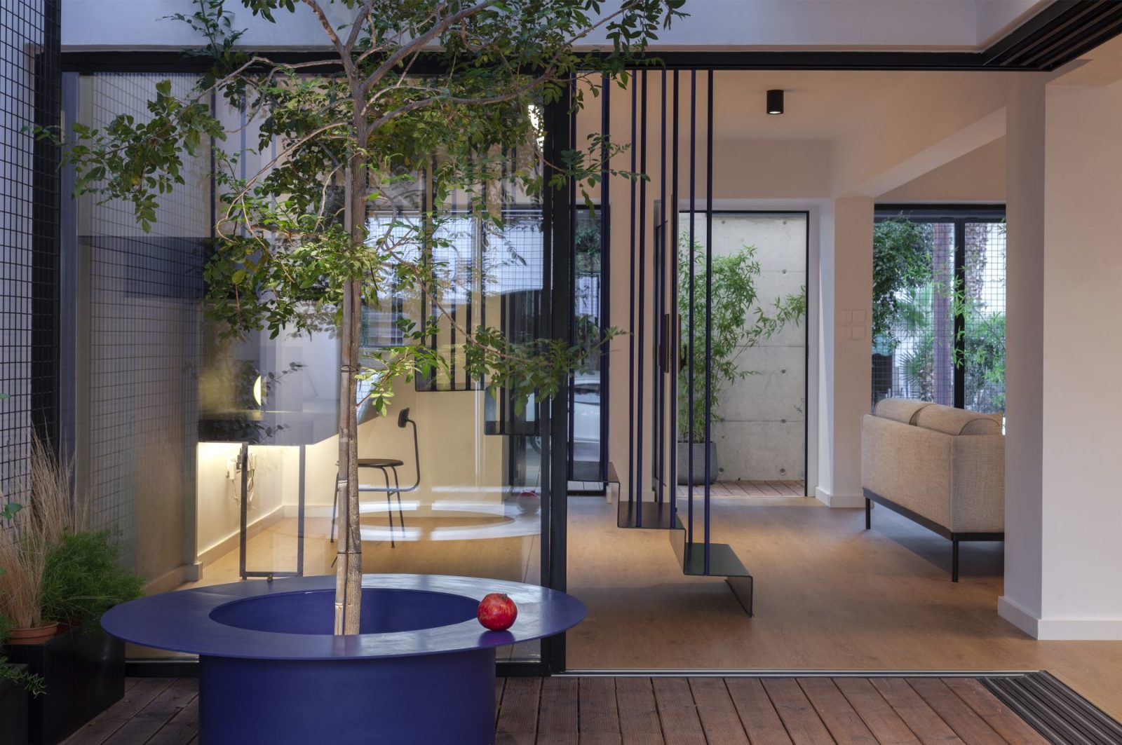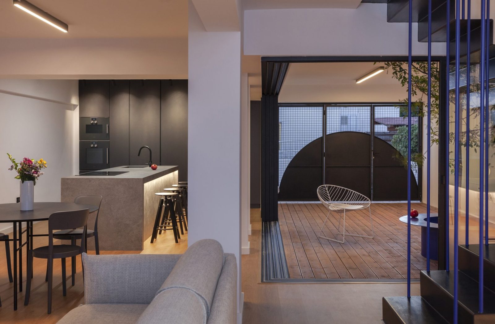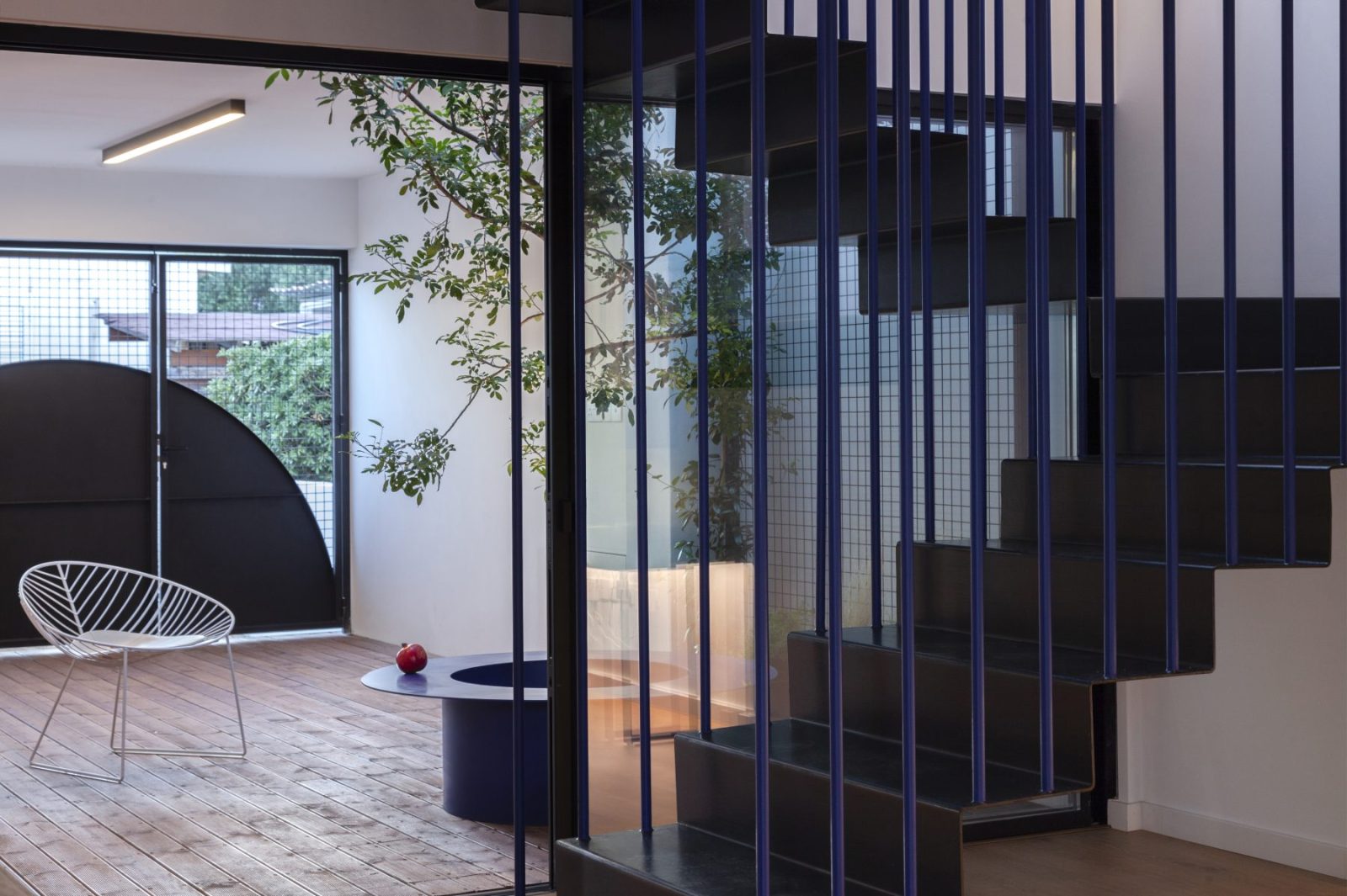 The first atrium works as a threshold greeting visitors at the main entrance, in dialogue with the new façade of exposed concrete. A vertical screen, 6.3 m high, enriched with luminous electric blue details, stands 1.3 m ahead of the pre-existing structure, crafting a protected open-air space under the sky. Here, the architecture orchestrates a poetic transition between old and new, urban and domestic, private and public, inside and outside.