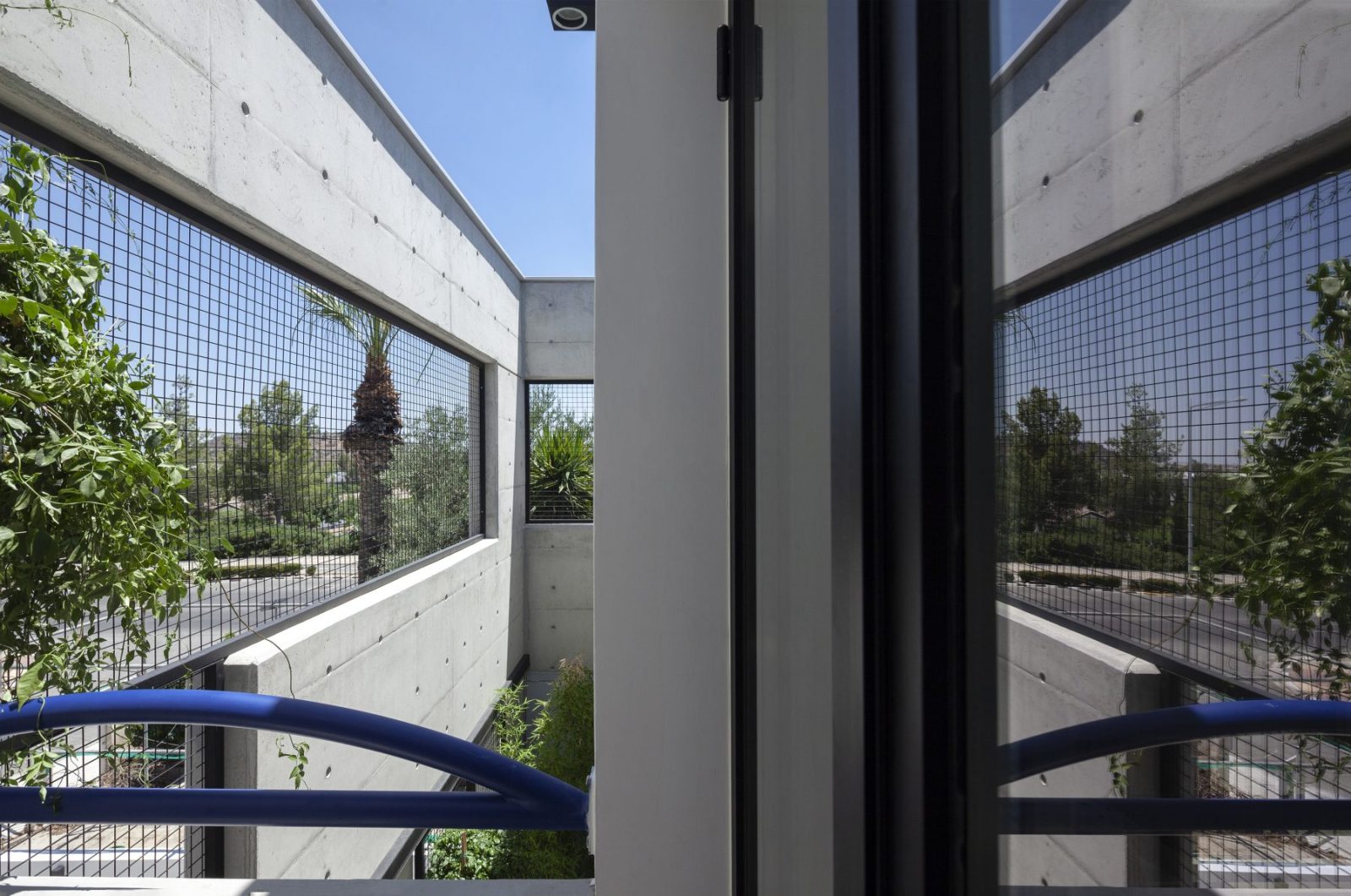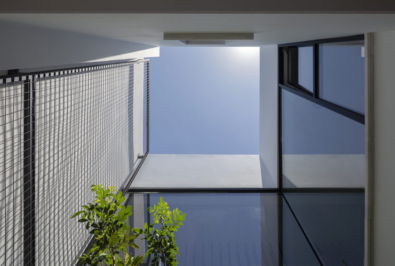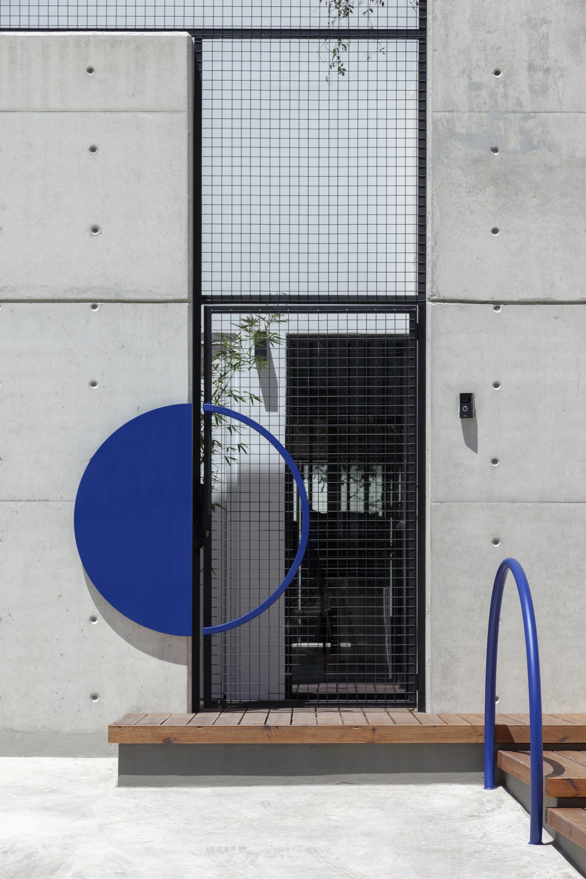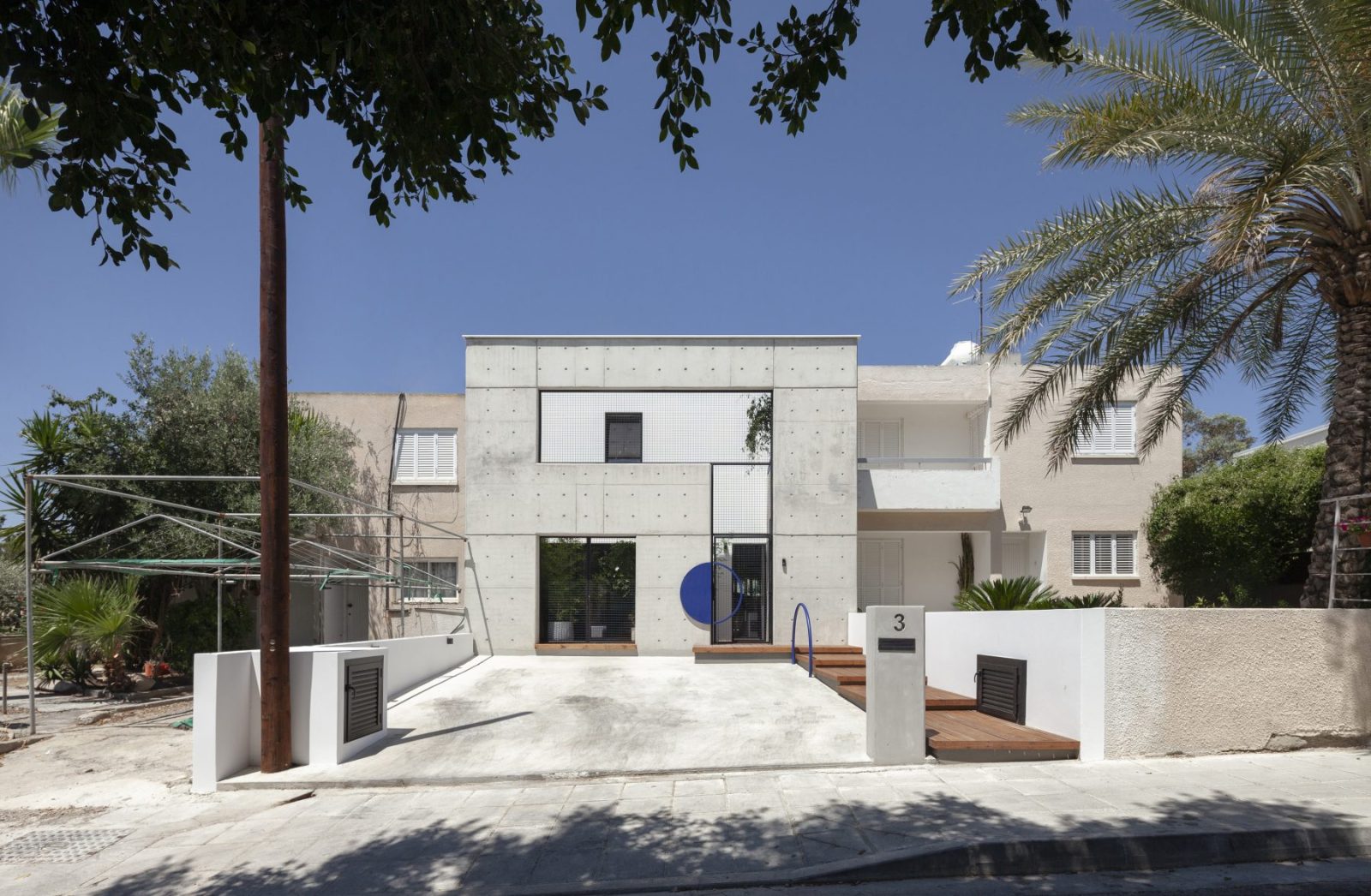 Το πρώτο αίθριο, που λειτουργεί ως καλωσόρισμα και κατώφλι, βρίσκεται στη κεντρική είσοδο του σπιτιού, σε άμεση συνάρτηση και αλληλεπίδραση με τη νέα χαρακτηριστική πρόσοψη που δημιουργήθηκε για την κατοικία από εμφανές σκυρόδεμα. Το μπετονένιο κατακόρυφο ‘παραβάν’, όπως το αποκαλεί ο αρχιτέκτονας, ύψους 6,3μ. με τις φωτεινές μπλε ηλεκτρίκ λεπτομέρειες, τοποθετείται σε απόσταση 1,3μ. από τον όγκο του προϋπάρχοντος κτηρίου εξασφαλίζοντας έναν προστατευμένο χώρο εκτόνωσης, με ταβάνι τον ουρανό, που λειτουργεί ως εναργής μετάβαση μεταξύ παλιού-νέου, ιδιωτικού-δημόσιου, κατοικίας-πόλης, εσωτερικού-εξωτερικού.