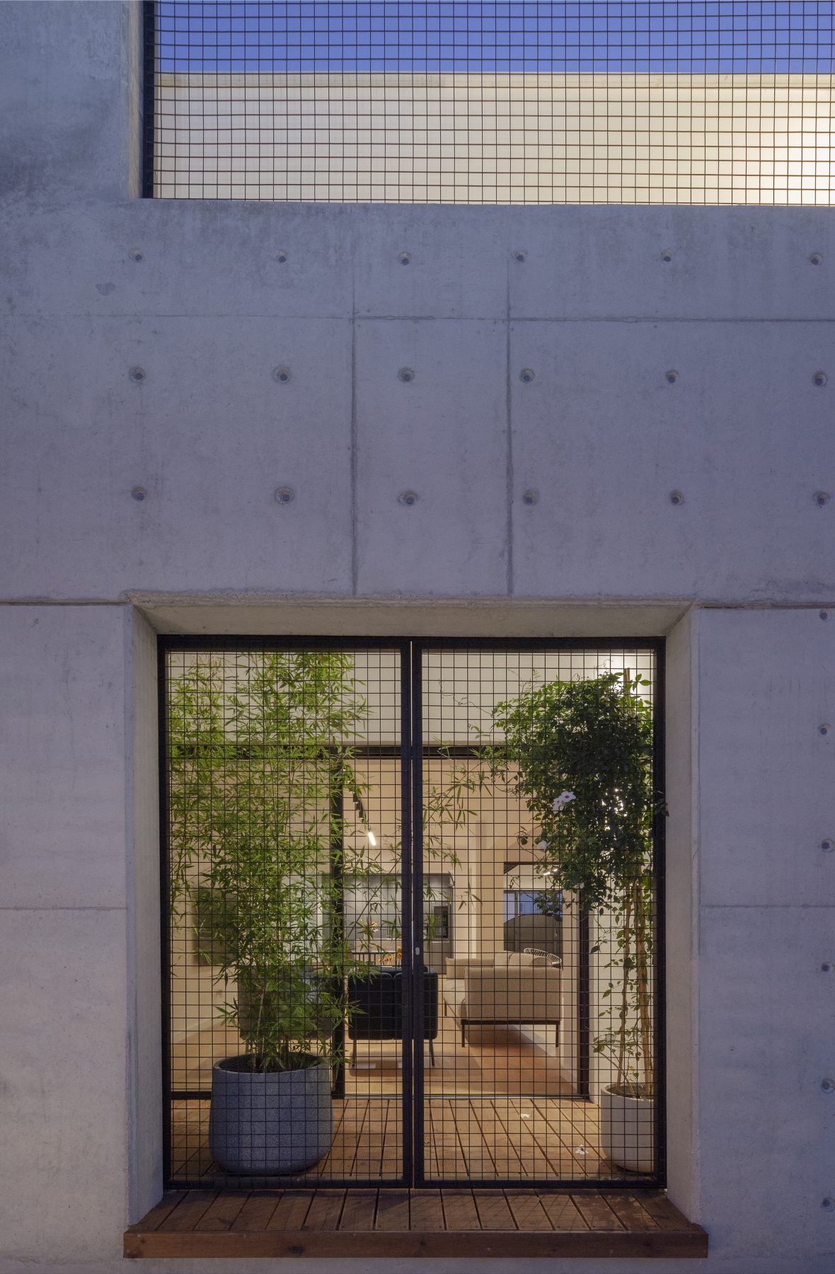 “The wall, carved with openings and complemented by metallic mesh panels, regulates light and airflow, creating layers of privacy and framing glimpses of life—both the settlement’s everyday rhythm and the intimate moments of the family,” explains the architect.