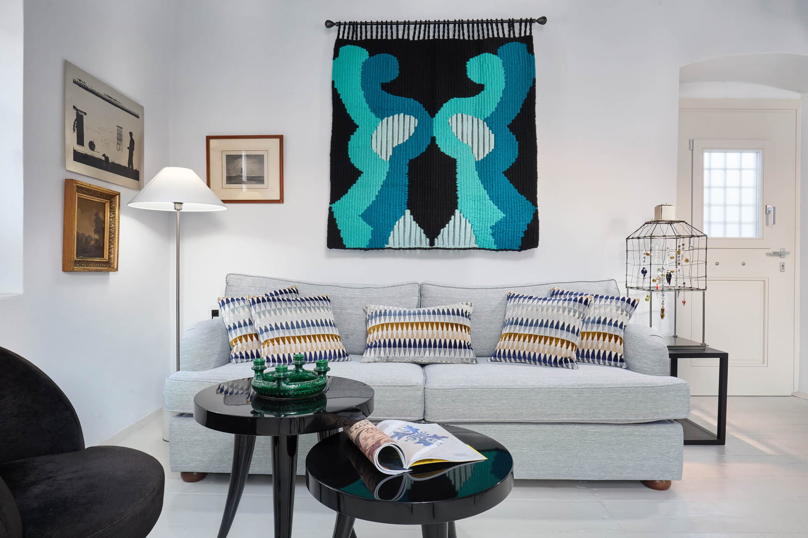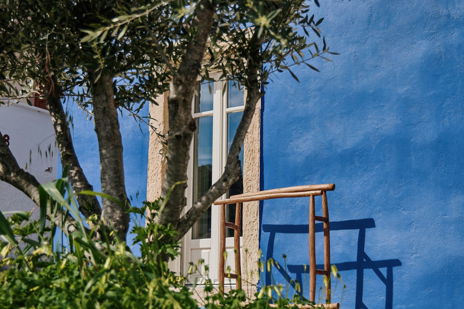 During the renovation, traces of all the building’s previous exterior colors were discovered beneath the old plaster: three different shades of blue, ochre, terracotta, and white. It was the vivid blue that ultimately captured the architect’s attention.
