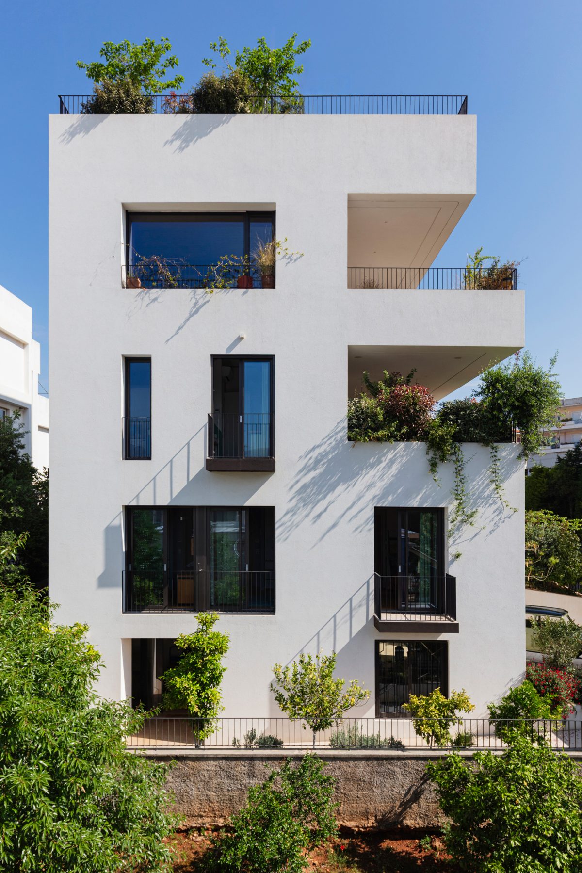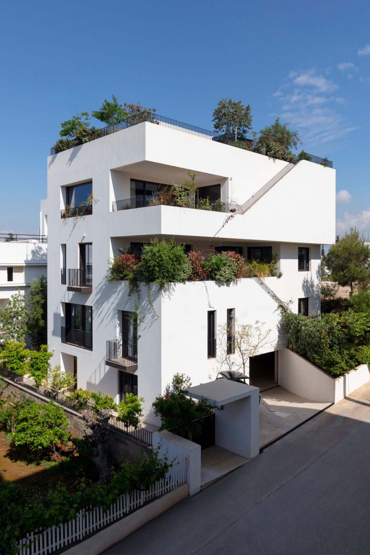 The outdoor living areas and external staircases are carved out of the main volume, lending the building a strong sculptural quality. The choice of white as the dominant color enhances the clarity of the massing, while planted surfaces and voids shape dynamic façades that reflect the project’s collective structure.