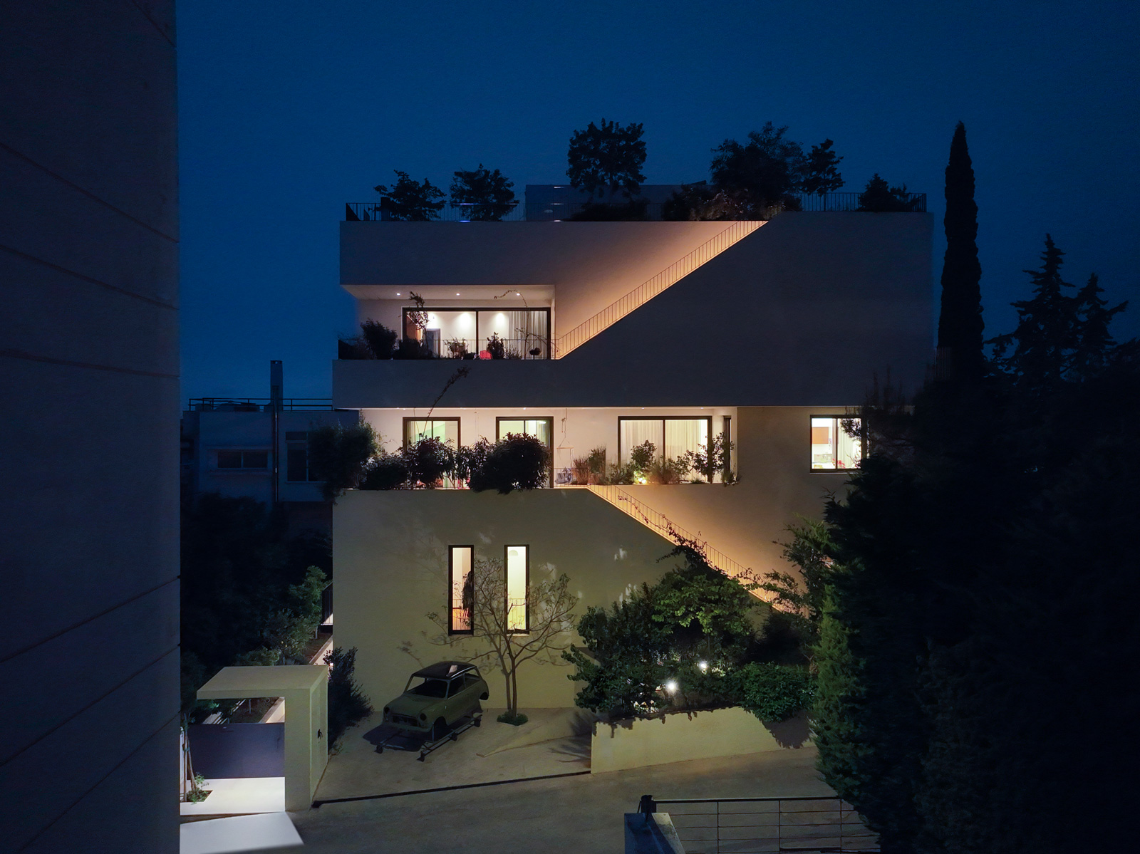 Ένας εσωτερικός πυρήνας κλιμακοστασίου, σε συνδυασμό με δύο εξωτερικές κλίμακες, συνδέει την κύρια αυλή, τους εξώστες και το φυτεμένο δώμα, συγκροτώντας ένα συνεχές δίκτυο κοινόχρηστων υπαίθριων χώρων που διατρέχει όλα τα επίπεδα του κτιρίου.