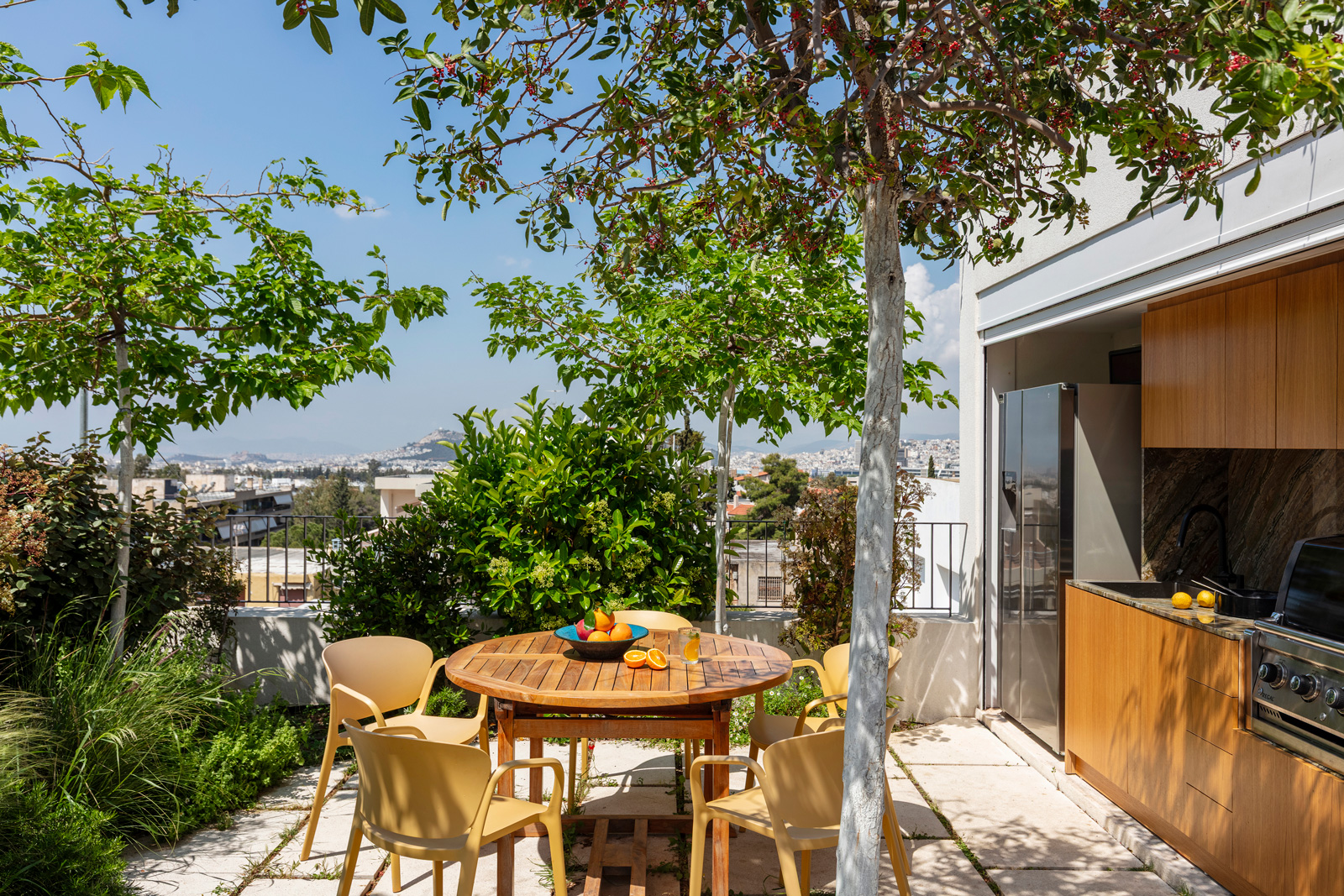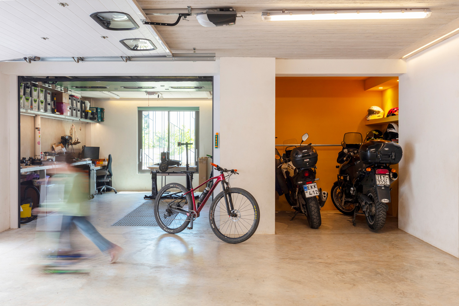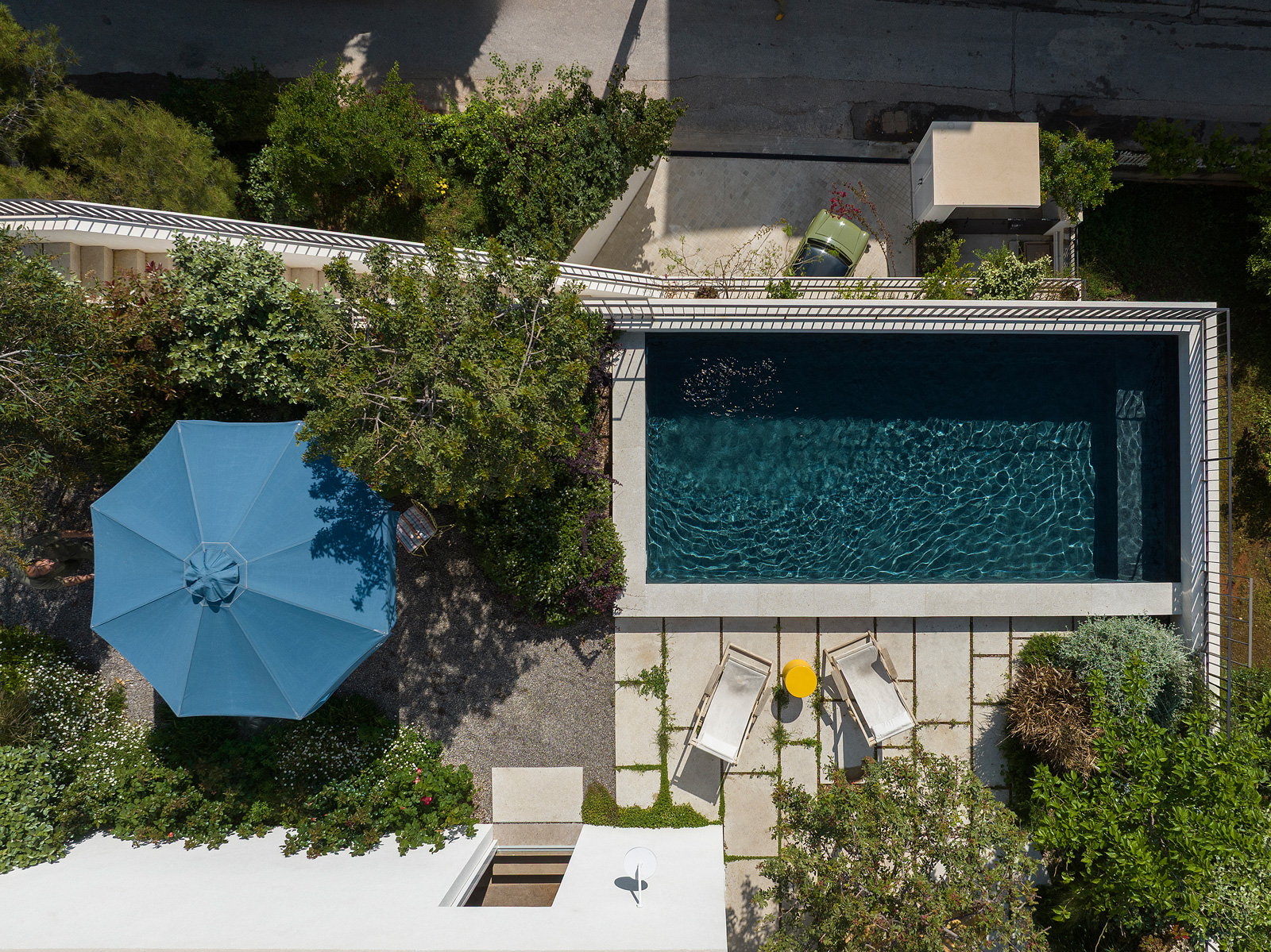 The planted roof serves as the primary meeting space for the residents, featuring a swimming pool, an outdoor kitchen and areas for shared dining with panoramic views towards Mount Hymettus and the city. At the same time, the semi-basement functions as a flexible multipurpose space, combining parking with a 3D printing workshop and supporting a range of activities, from play and exercise to social gatherings.