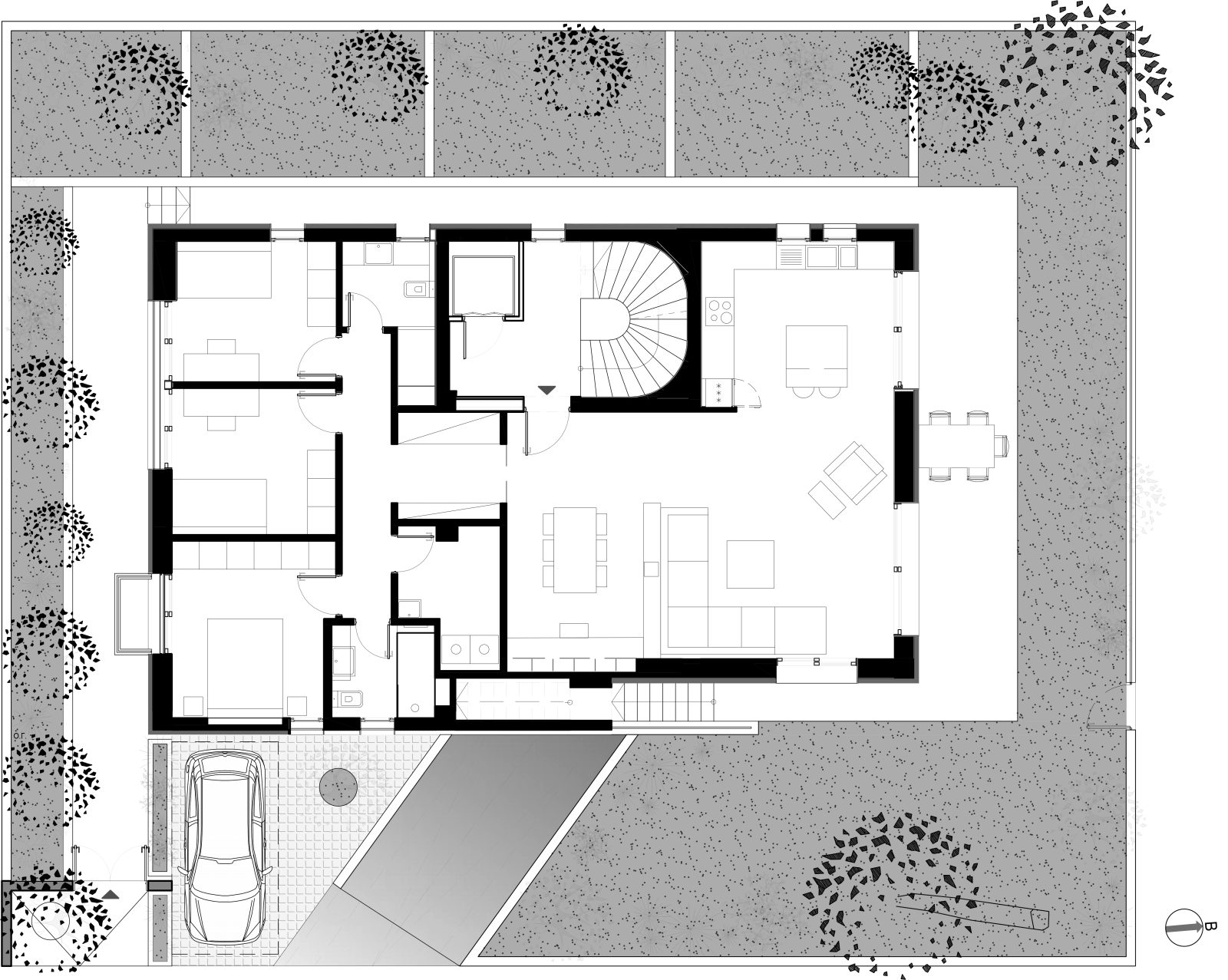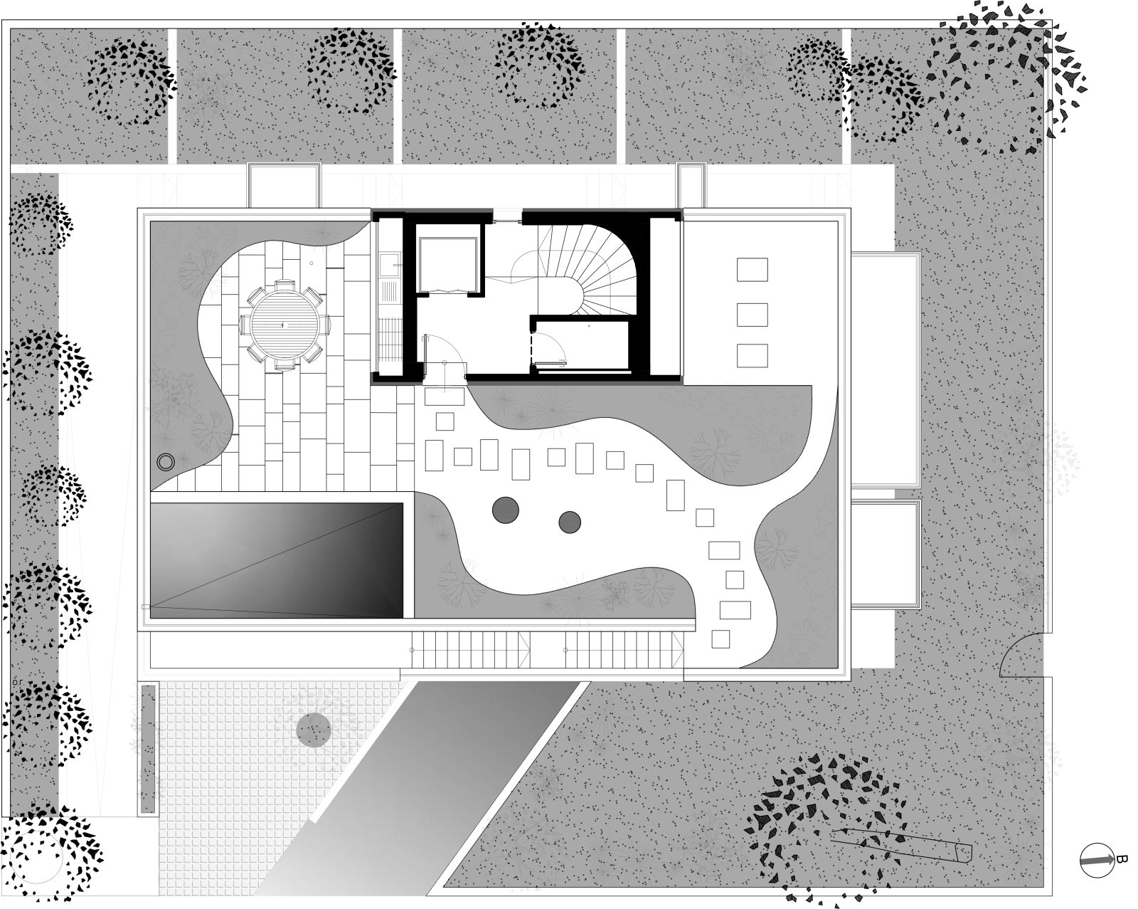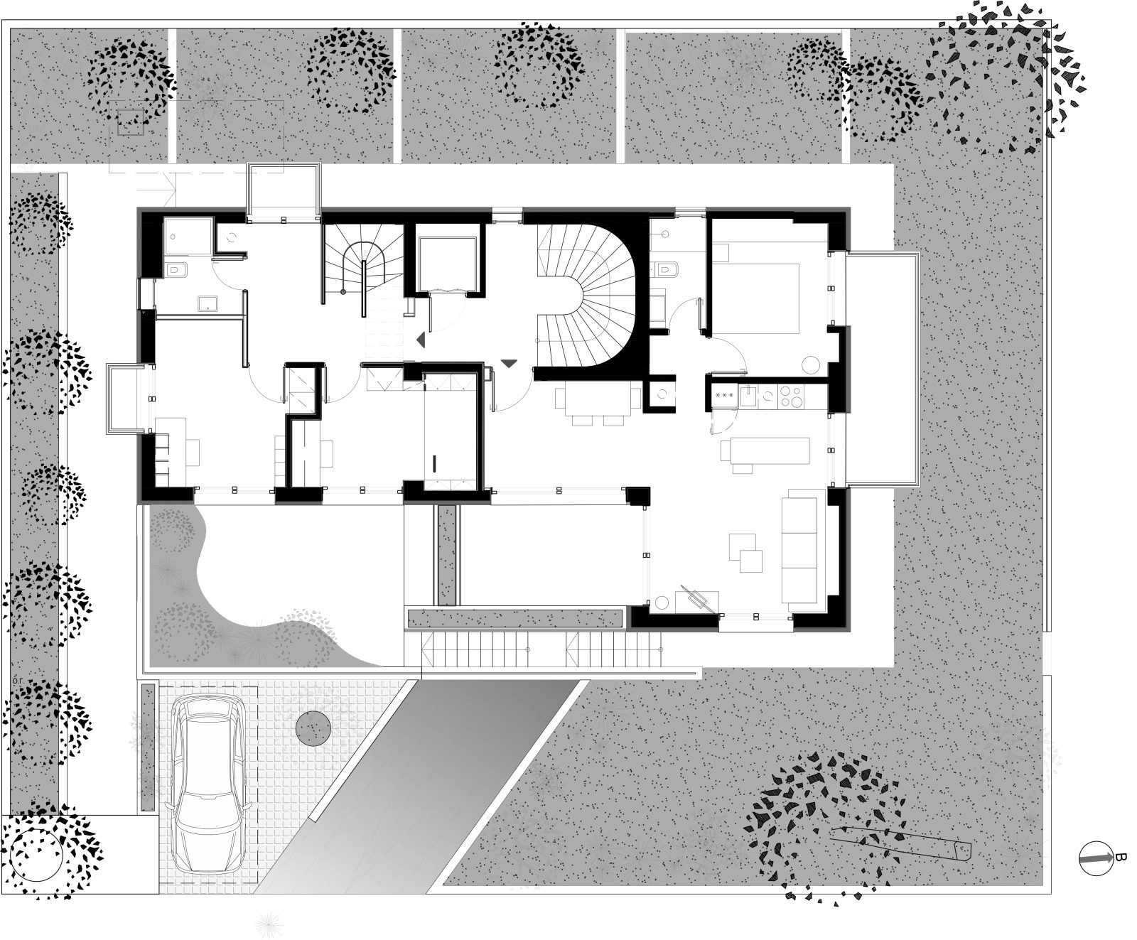 The architectural composition is organized around two fully autonomous residences, arranged on different levels and oriented in opposite directions (north–south), enhancing the sense of privacy. Each home was shaped according to the specific requirements of its family, in terms of scale, internal circulation, and the manner in which it connects to the shared spaces.