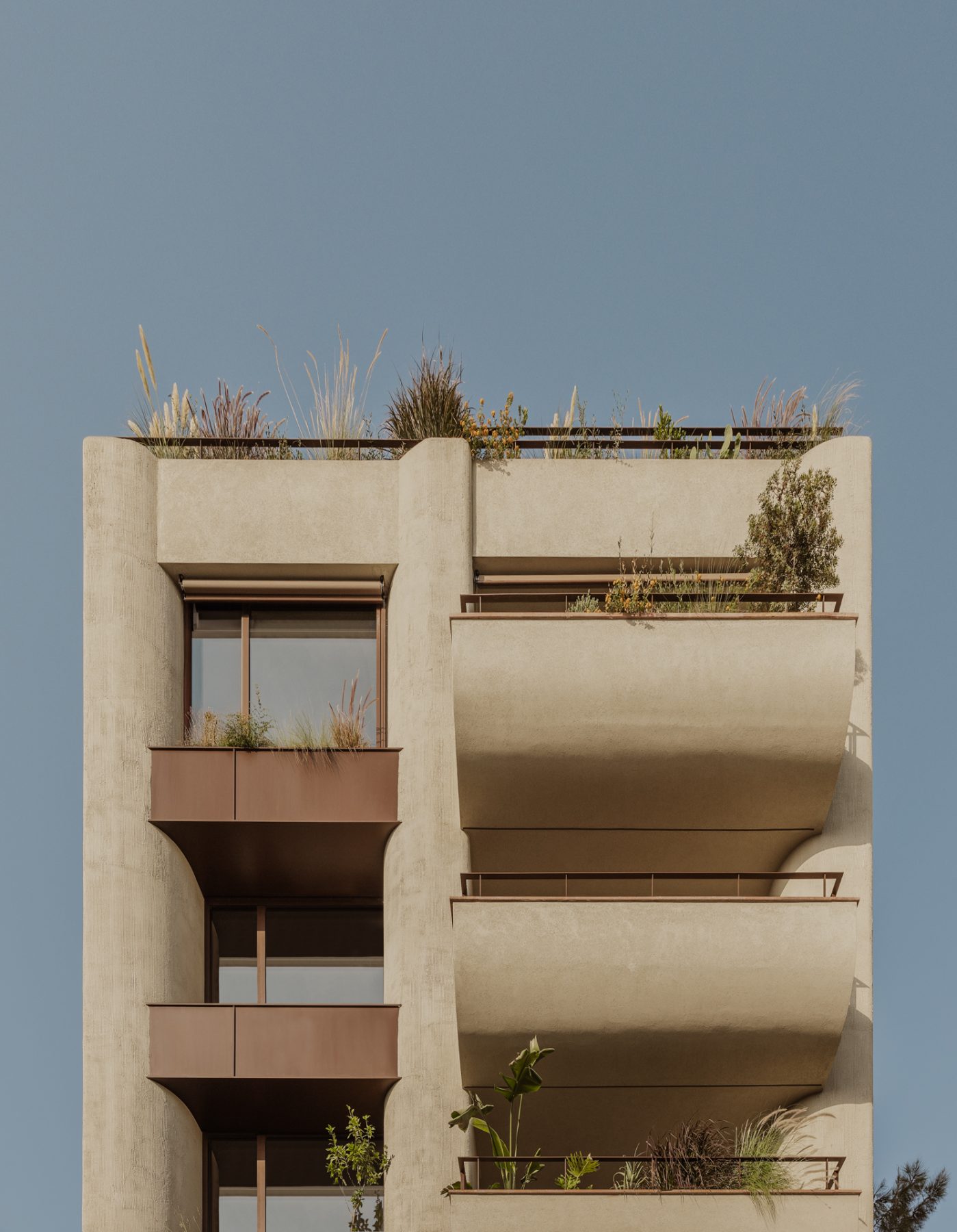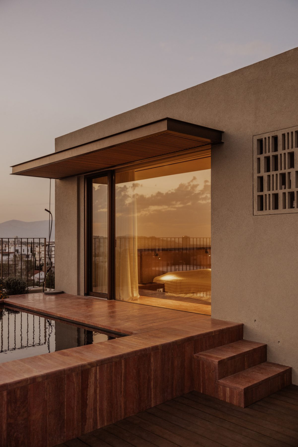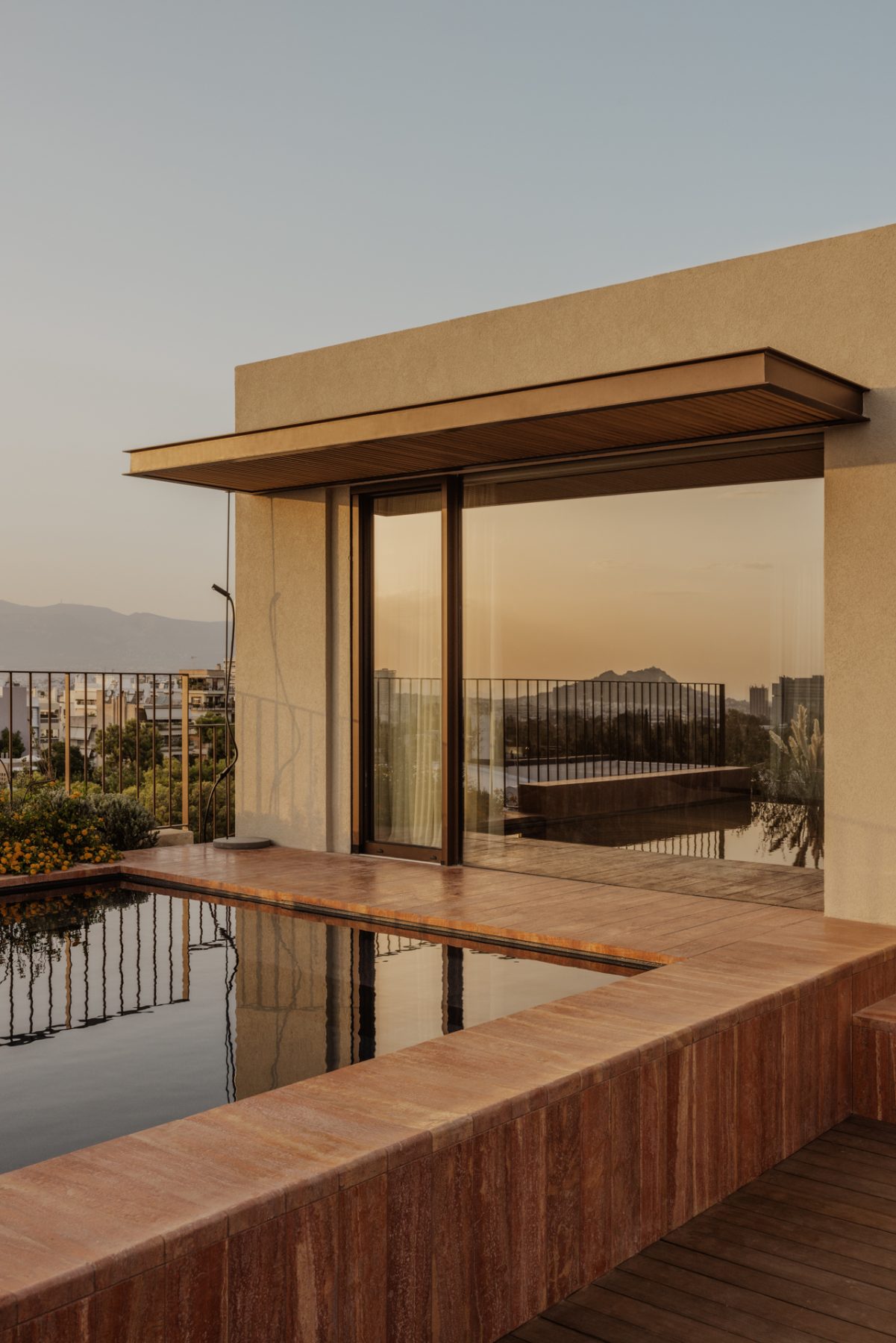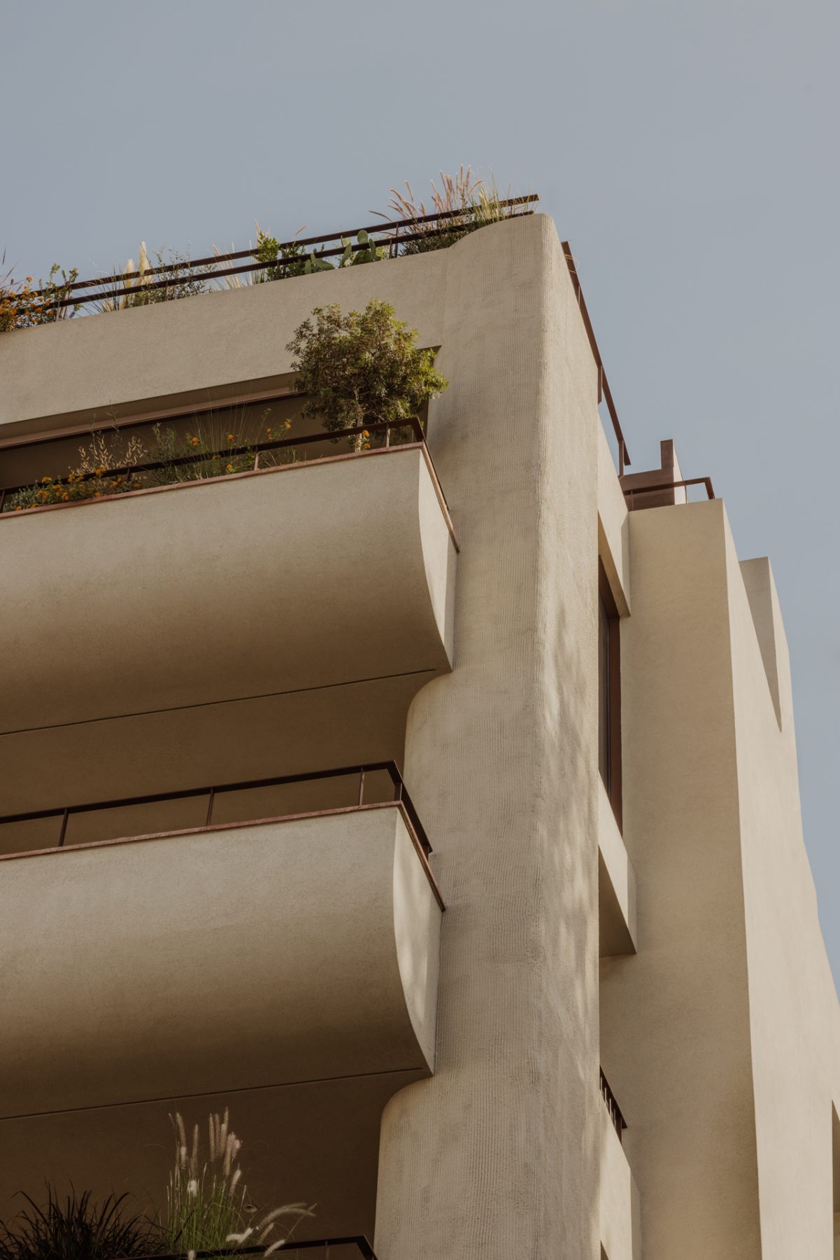 The residential building is confident and geometric, nodding to the spirit of the Golden Age of Papagou, a part of Athens largely developed during the 20th century and influenced by the International Style.