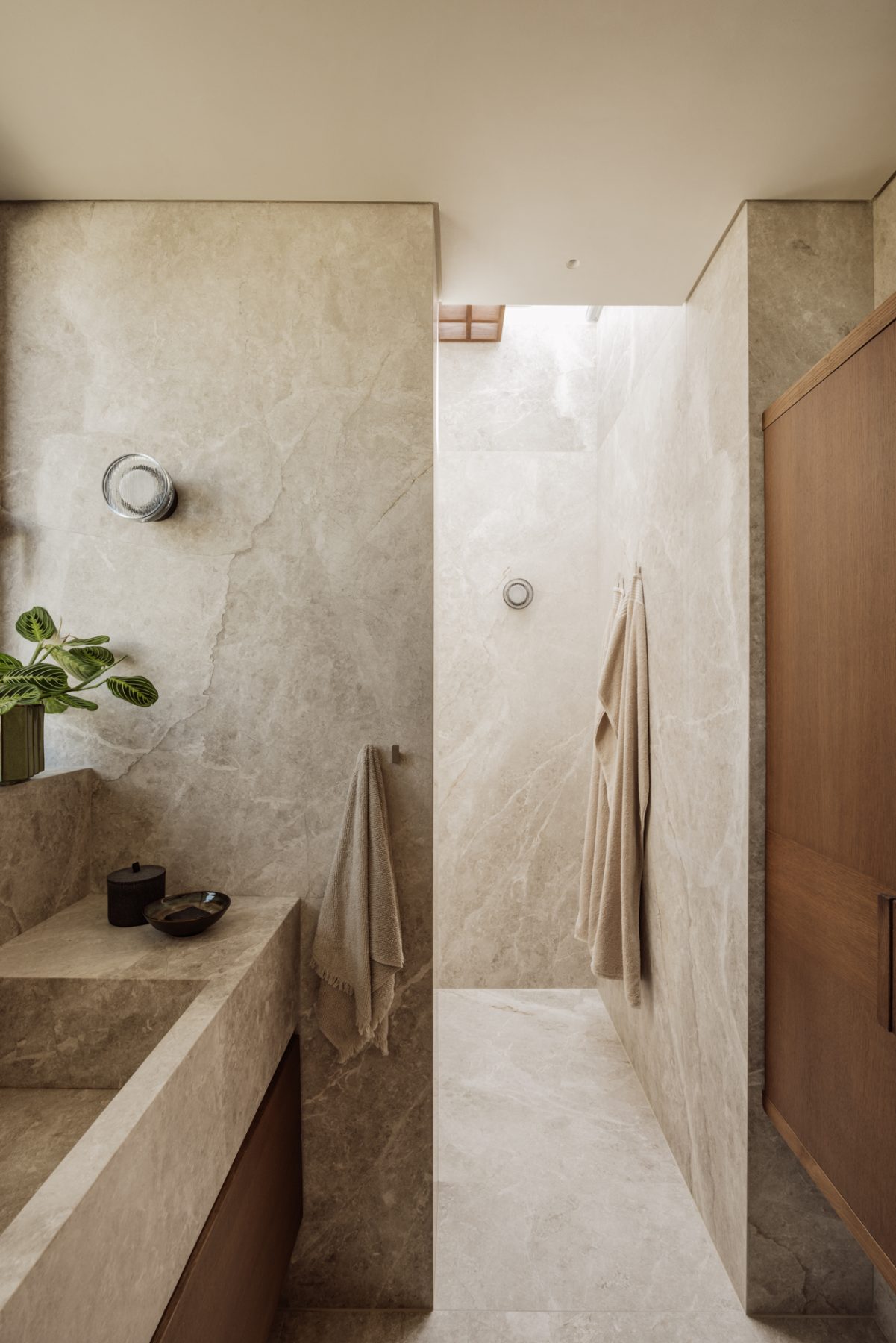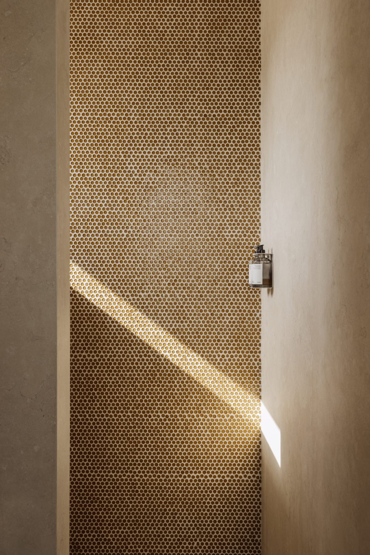 The idea of wellness and a biophilic approach were central to the design development, showcased through natural, tactile materials, such as marble, wood, textured render, travertino rosso, ceramic tiles, and oiled timber flooring.