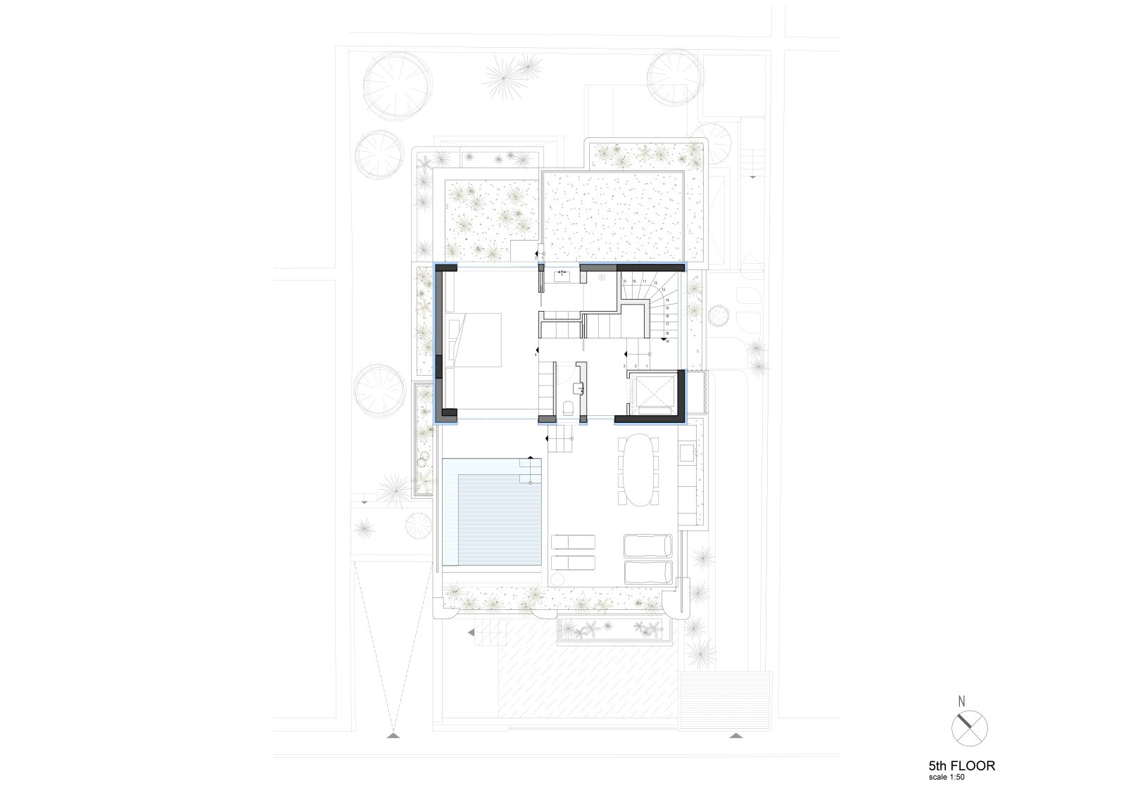 The home’s interior spreads across two floors and 230 sq m. The property’s first level contains two bedrooms and a flowing, open-plan living space, featuring discrete areas, defined through the clever use of furniture and light partitions, and including a large kitchen, ideal for entertaining. The primary bedroom suite, opening up to a planted roof terrace with a swimming pool, deck, and half-size basketball court, is found upstairs. Self-contained, highly personalised, and taking in the long, carefully framed views of greenery and the cityscape beyond, the project feels more like a detached single-family house in the sky than part of a larger development.