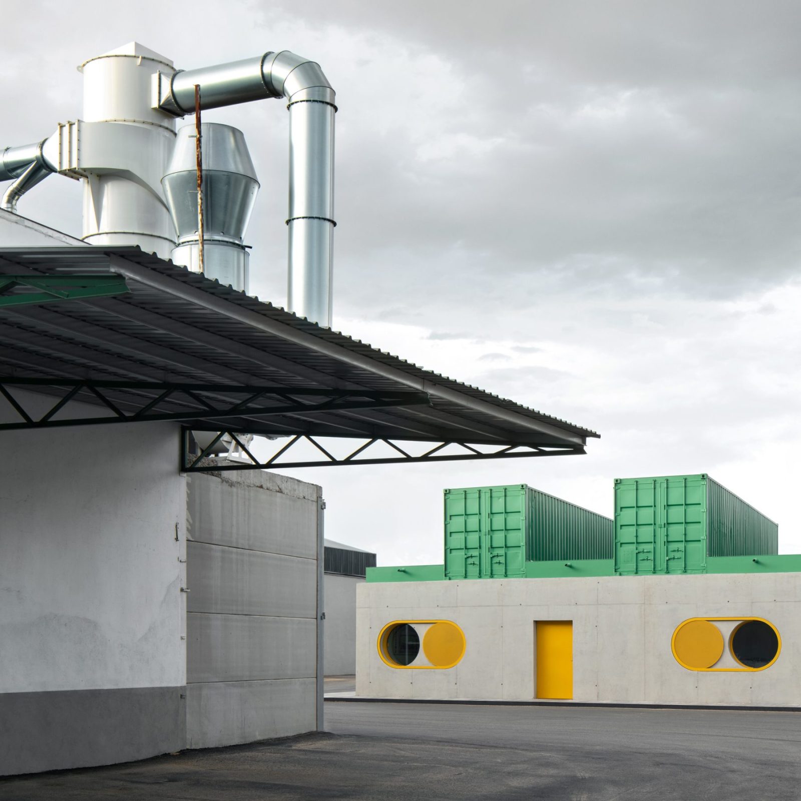 Spatially, the building is organised through a clear and repeatable system. Four reused shipping containers, opened along two sides, rest on a concrete plinth continuous with that of the adjacent warehouses.