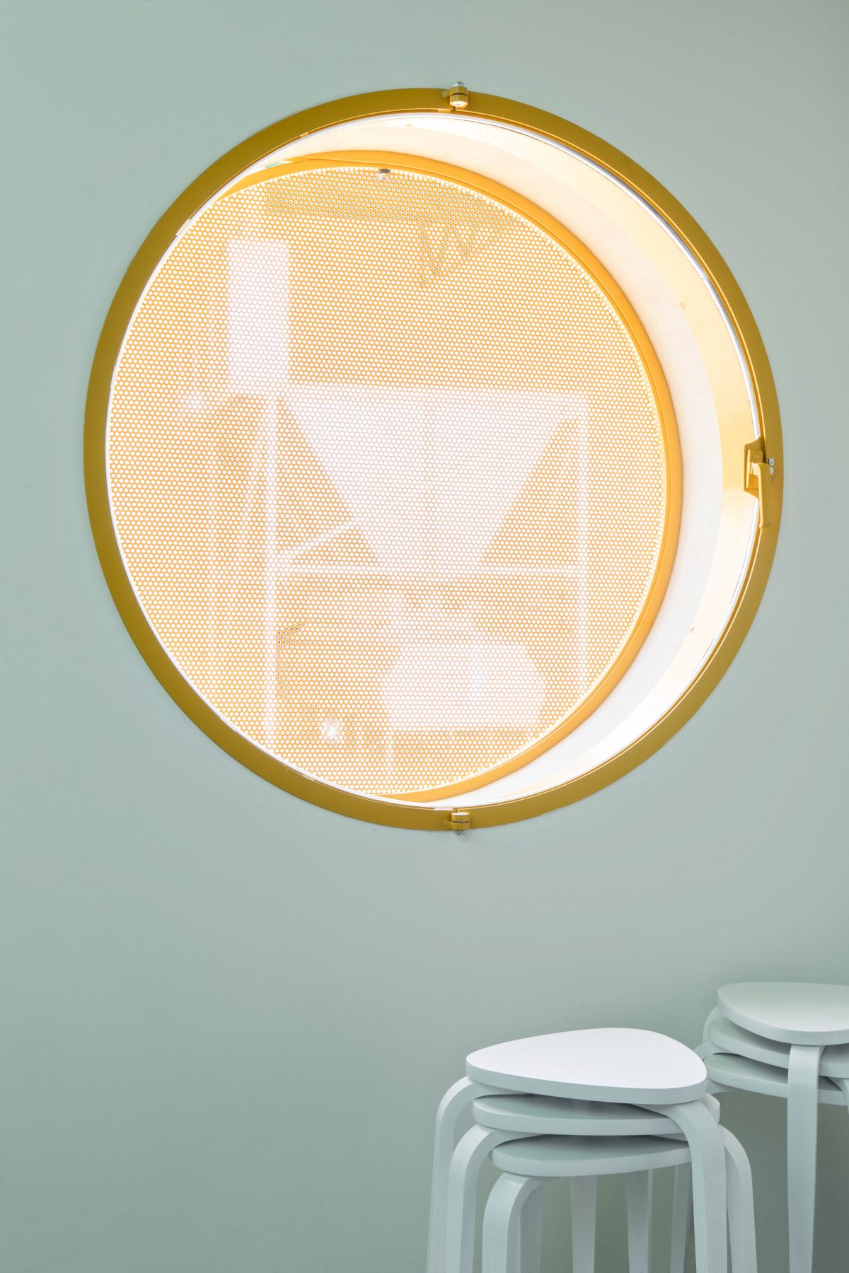 The façades, punctuated by a limited number of large circular openings, incorporate manually operated shutters that behave almost as mechanical devices — elements that allow the building to alternately expose or withdraw itself from its surroundings.