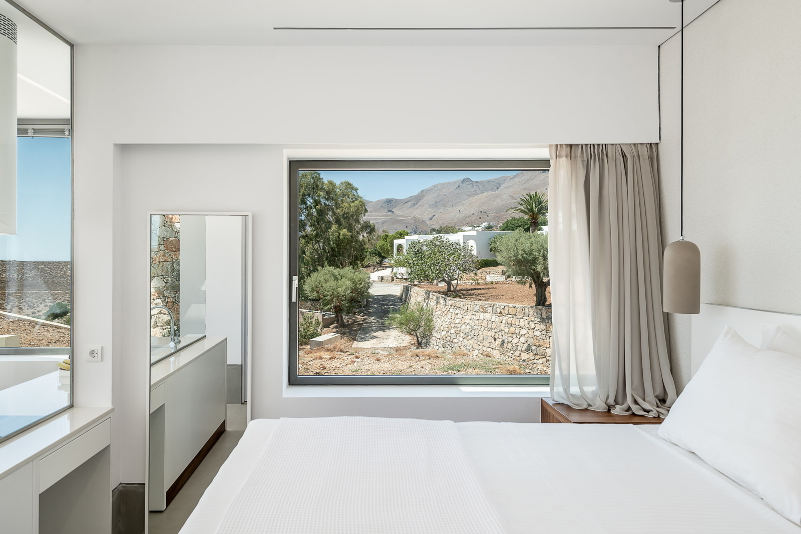White colour is used to outline the “valleys’” ridges, on the buildings’ facades and landscaping walls. The walkway that connects the suites’ domain entrance with the adjacent hotel is paved with stone, a material that ascends vertically to hold the soils beyond the buildings’ area. Stone blends with the surrounding rocky terrain -being cut from it actually- as well as with the various enclosures and fences of old. Polished concrete of mostly white cement is used for the rest of the hard landscaping, in order to give a sense of a continuous ground.
