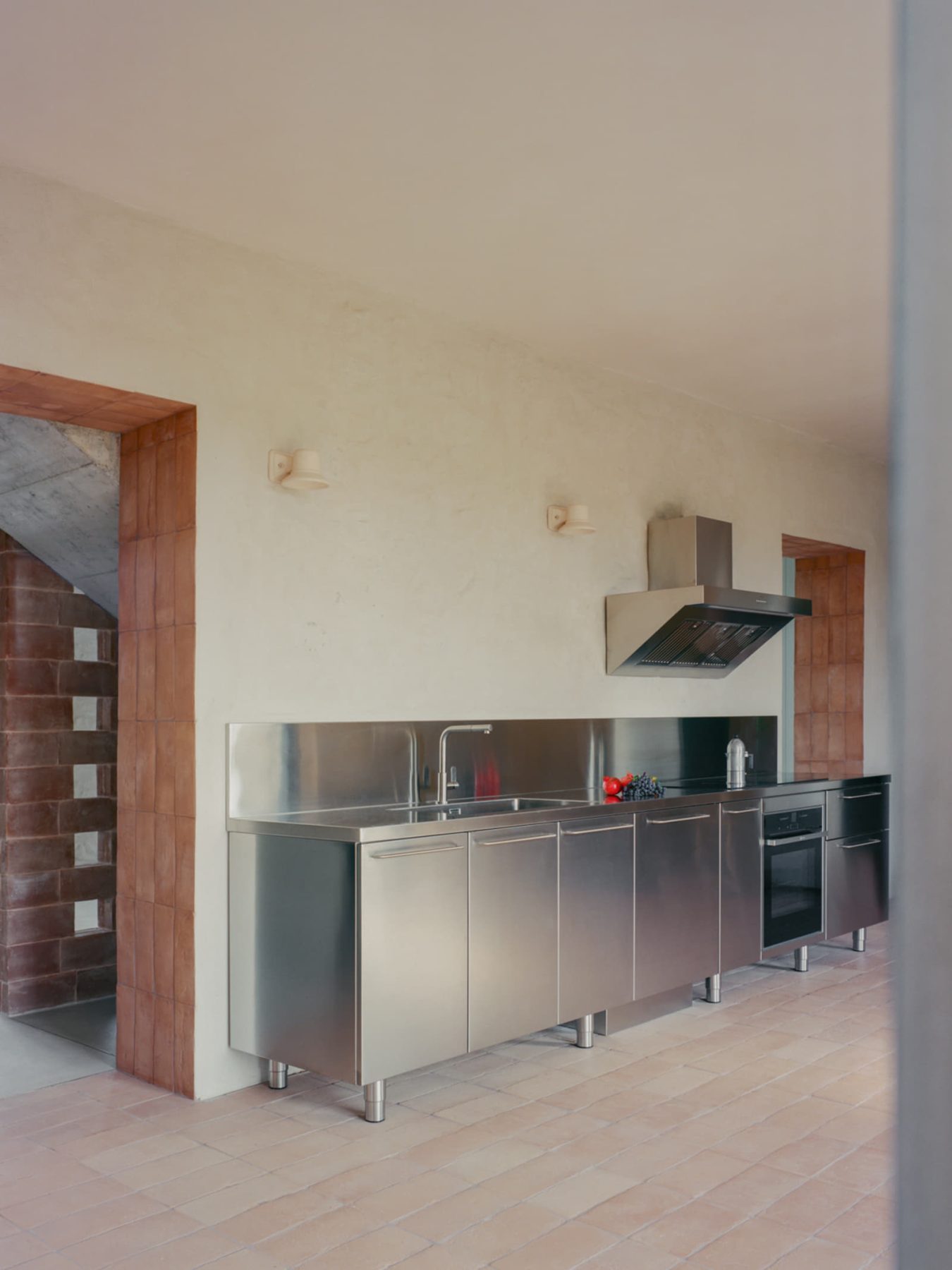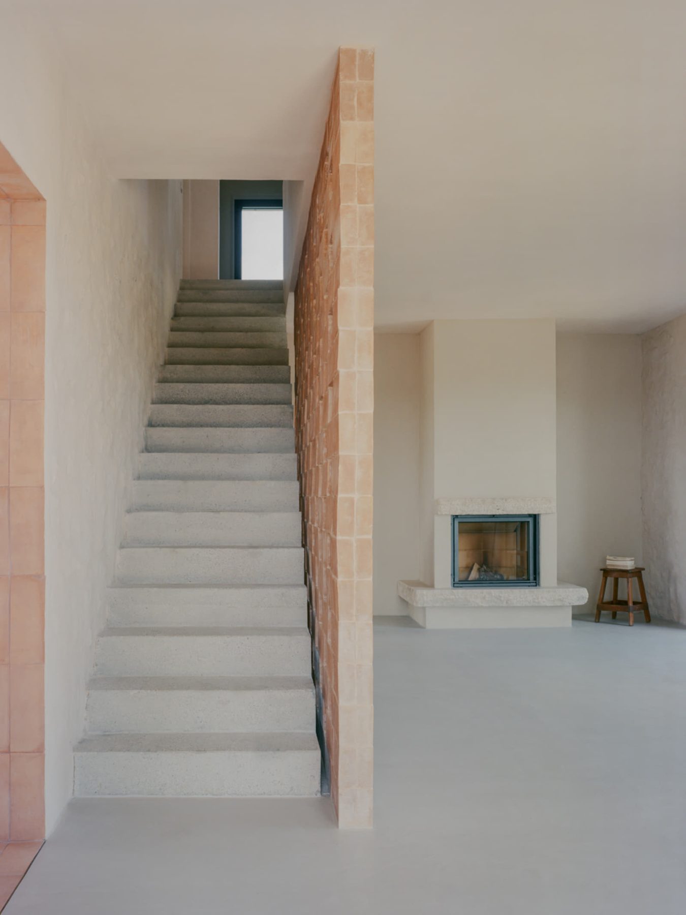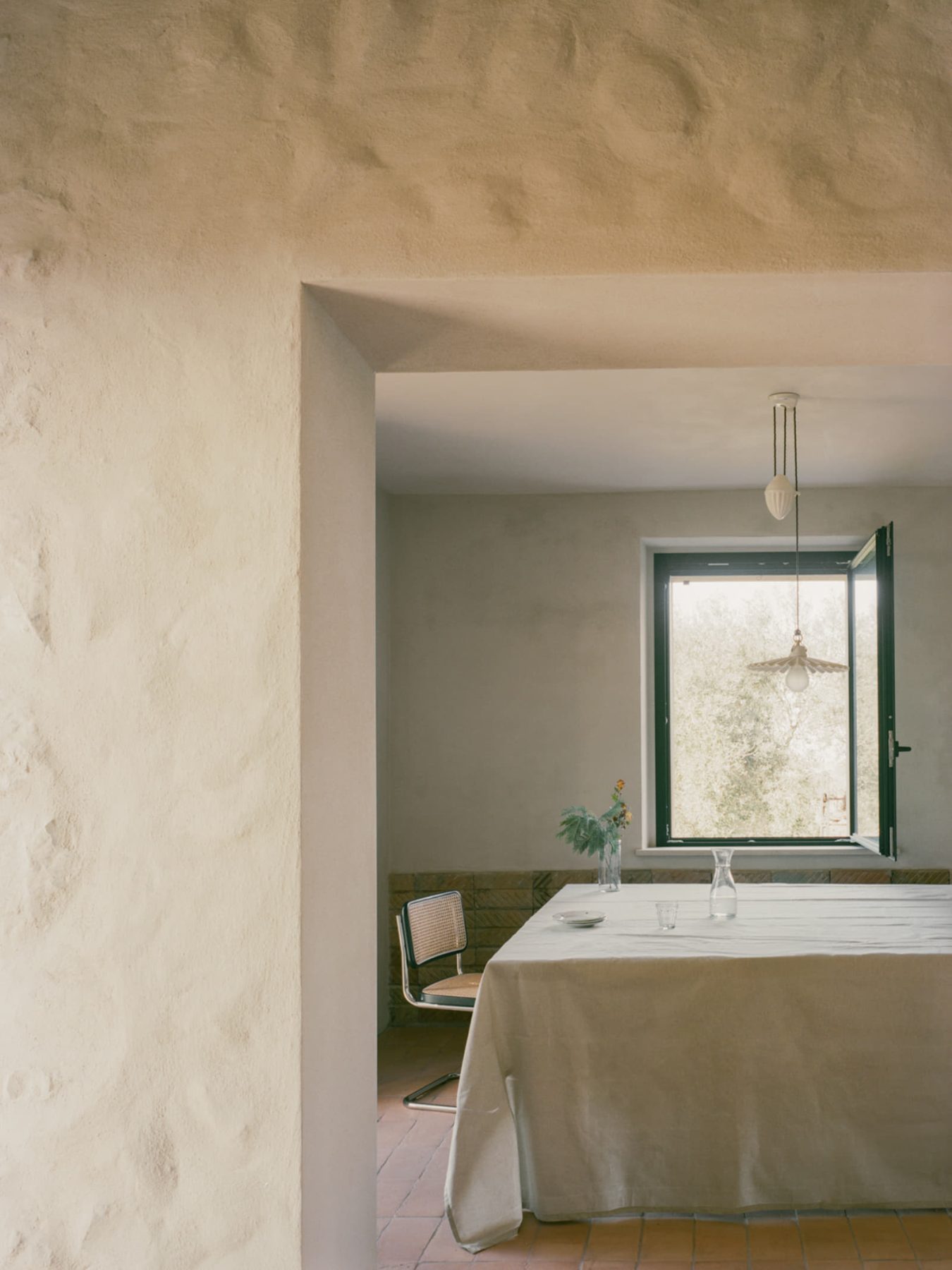 The stone blocks were stripped of old plaster and brought back to light, while parts of the original carved terracotta brick floor from the stables were recovered and repurposed on a wall in the dining room and upstairs bedroom.