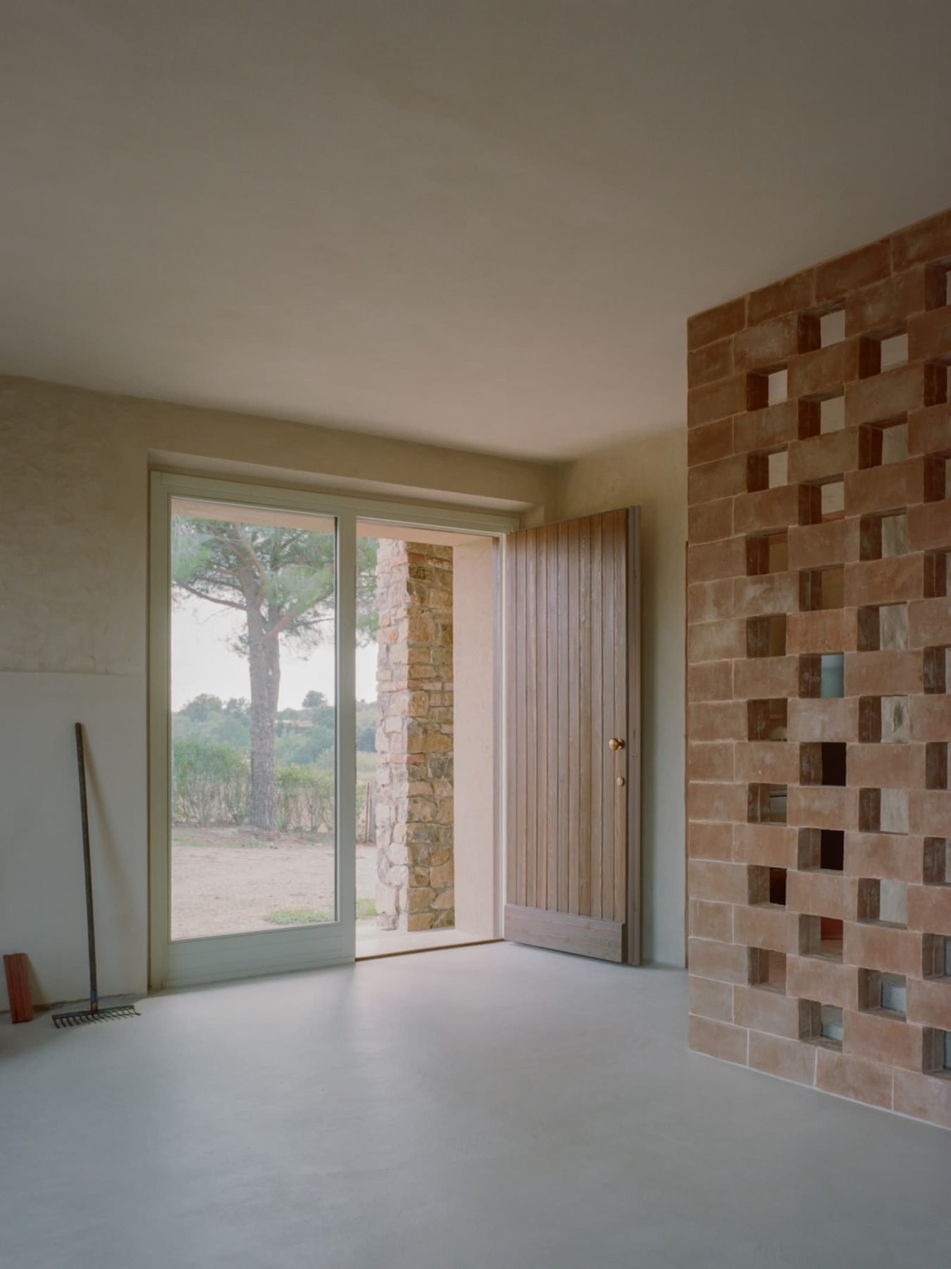 A brick lattice wall, typical of Tuscan rural architecture, was used as a partition between the staircase—now a new internal concrete element—and the living room, which features a continuous surface in the same material.