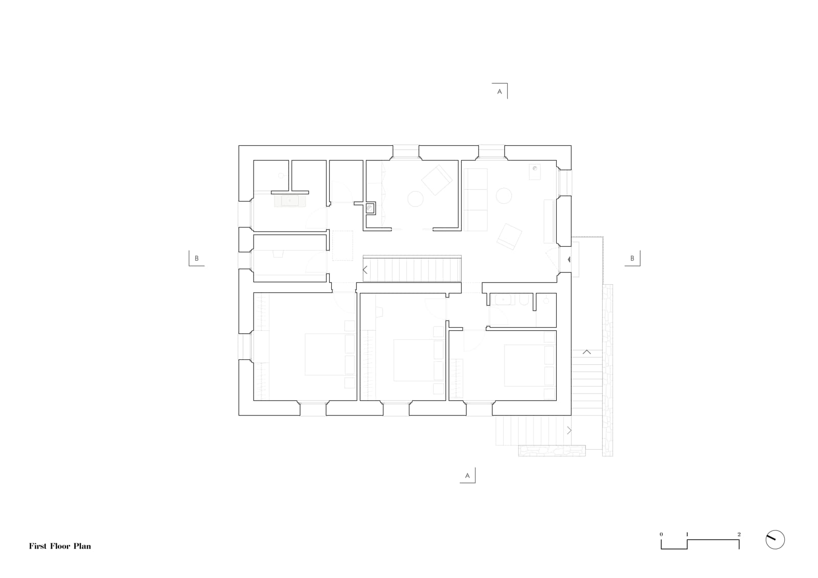 The design preserved the original layout and its main structural elements, such as the tuff and stone walls. The external staircase was reimagined as a sculptural stone wall, gaining form and materiality like a true second façade.