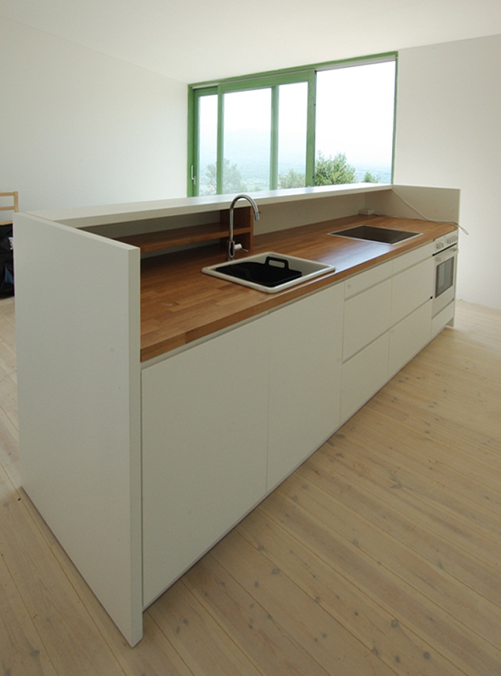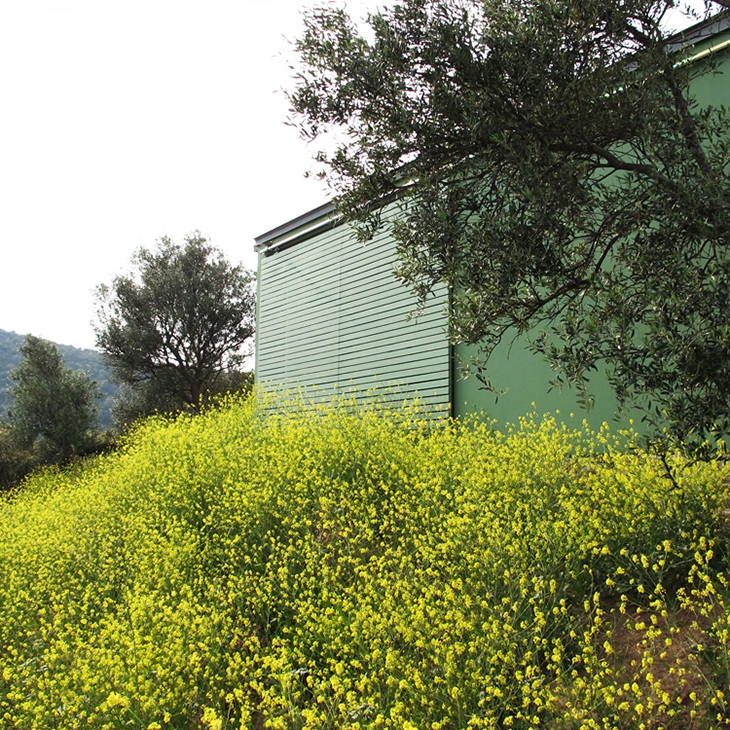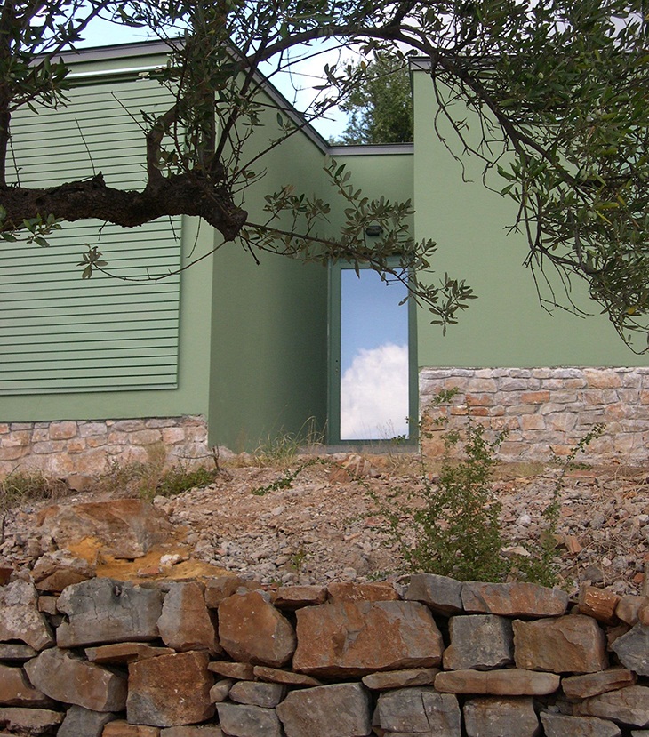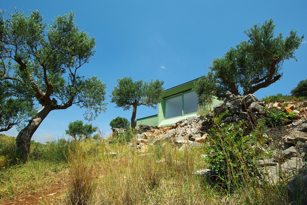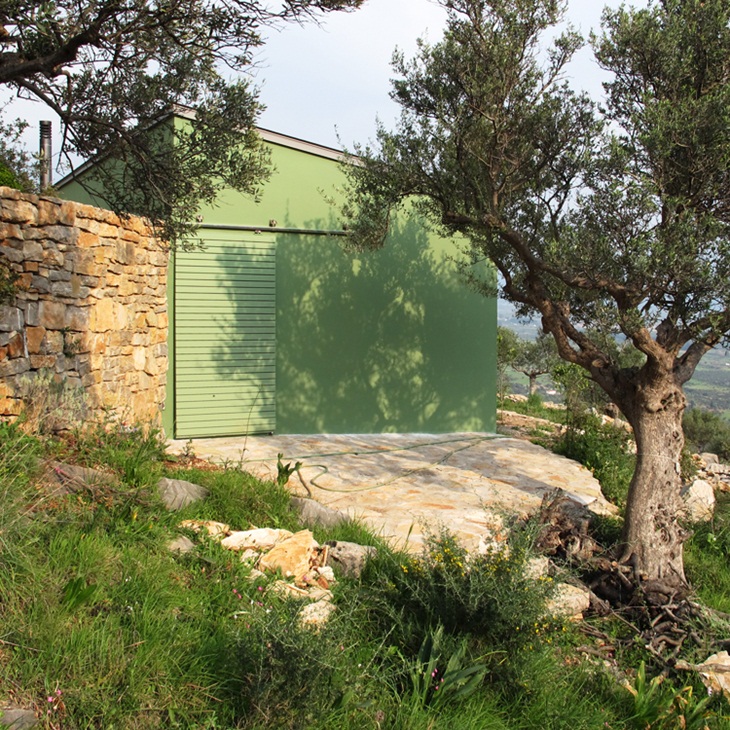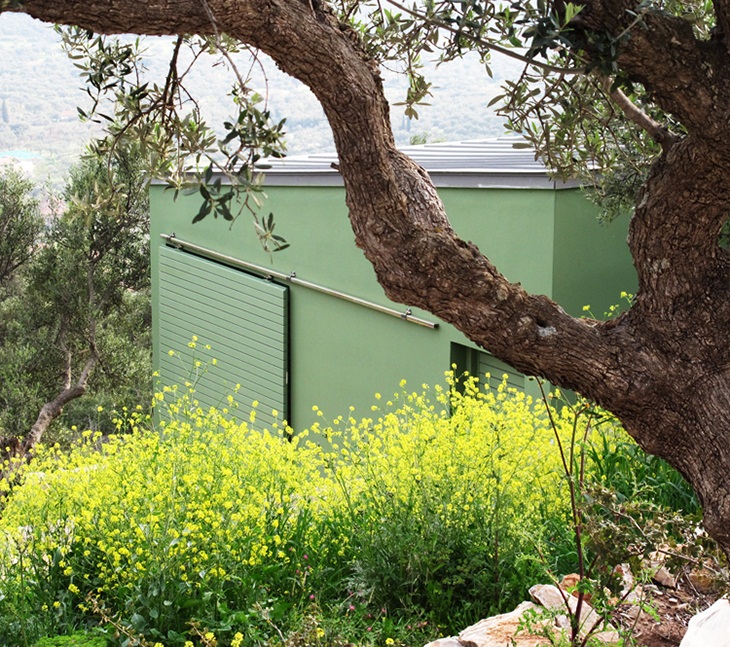 The buildings have the same general ethos but they were designed and adjusted to achieve the perfect fit for each specific spot constituting them different from each other, both in form and size. They adapt to the topography and the green color of the facades makes them blend in among the olive trees.