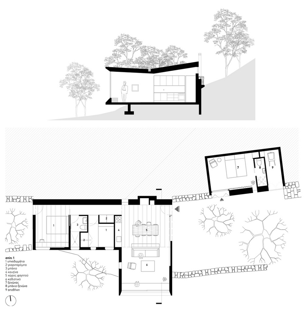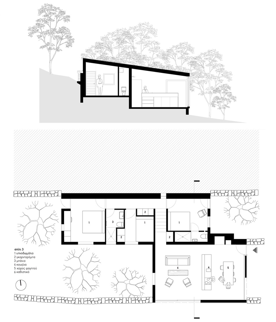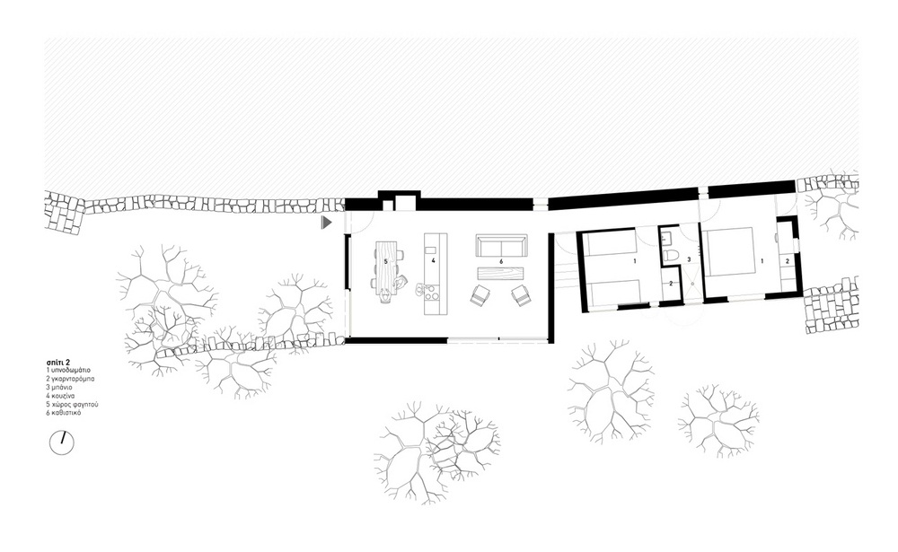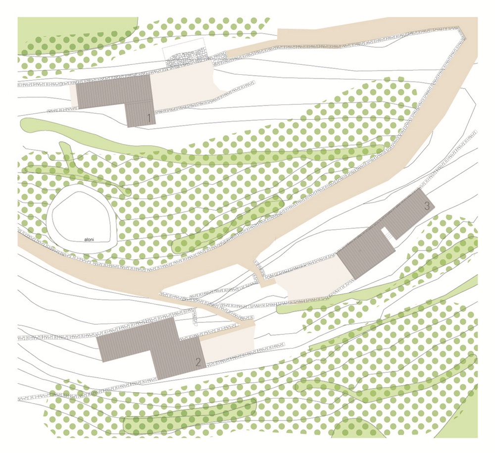 The site, a beautiful olive grove in the Peloponnese with an intense topography and a magnificent view to the messinian plane, was the starting point for the design of the three houses. The three buildings were spread on the site so that they could be close το each other but still have privacy. The site is traditionally terraced with stone walls and the three houses relate to these stone walls following the natural curvature of the mountain terrain.