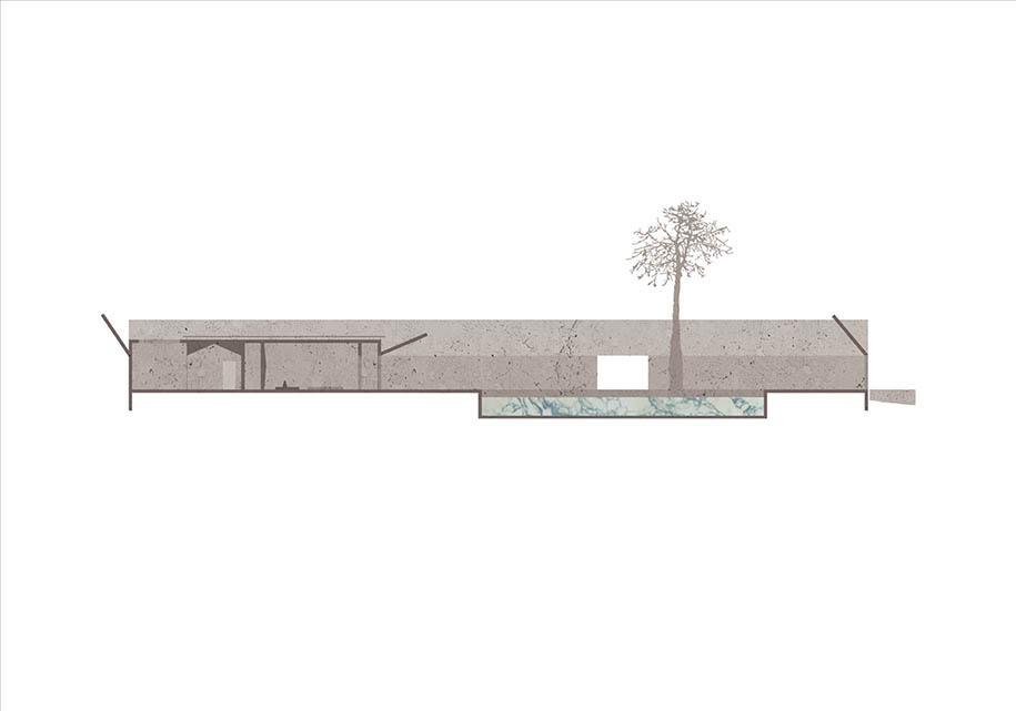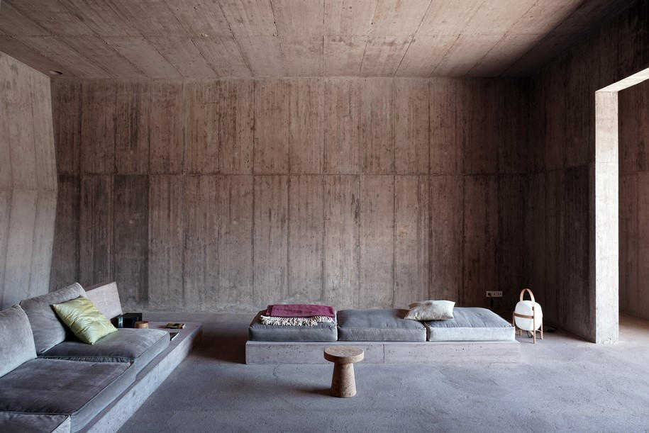 It overlooks the pool and offers a view through the southern door in the garden wall across a flat and empty landscape. A curved hallway allows the inhabitants to retreat into shadows and into the introverted private rooms.
