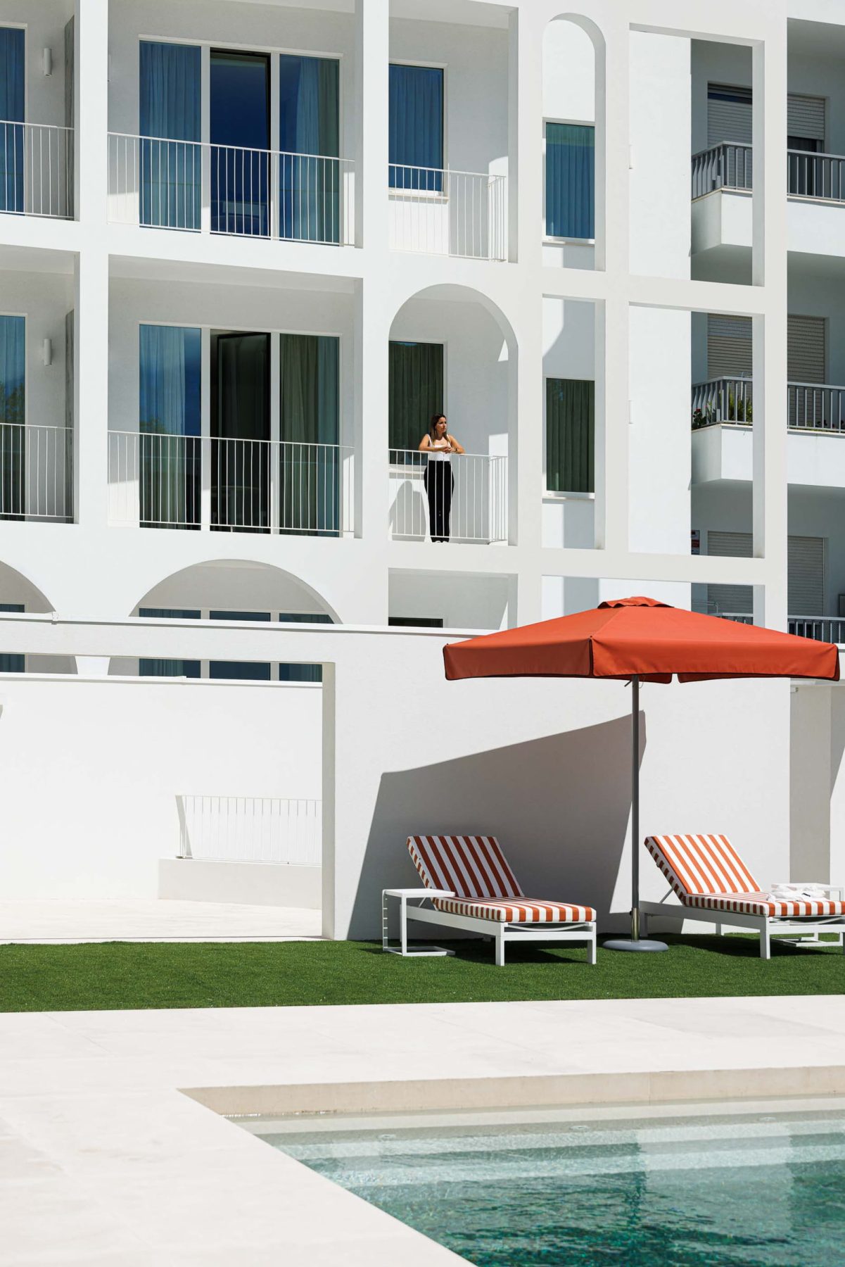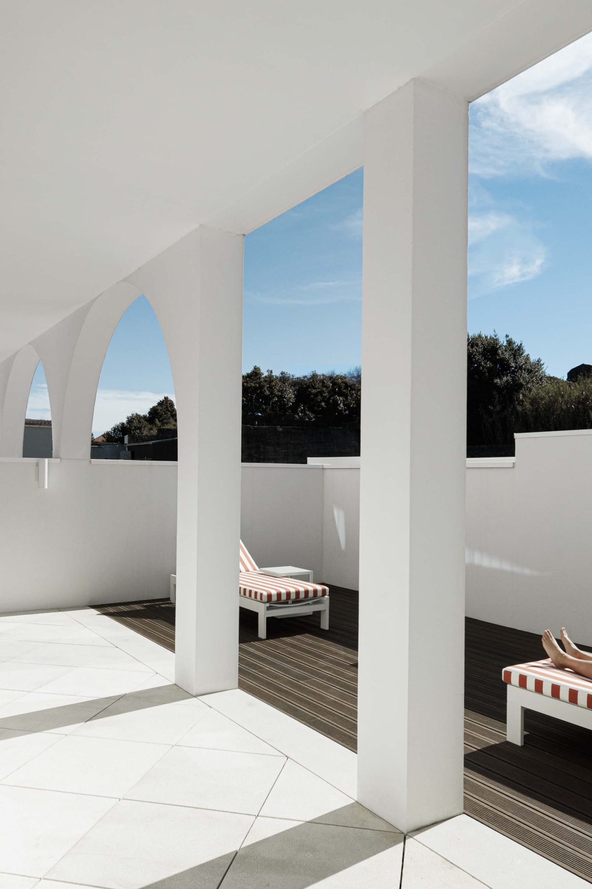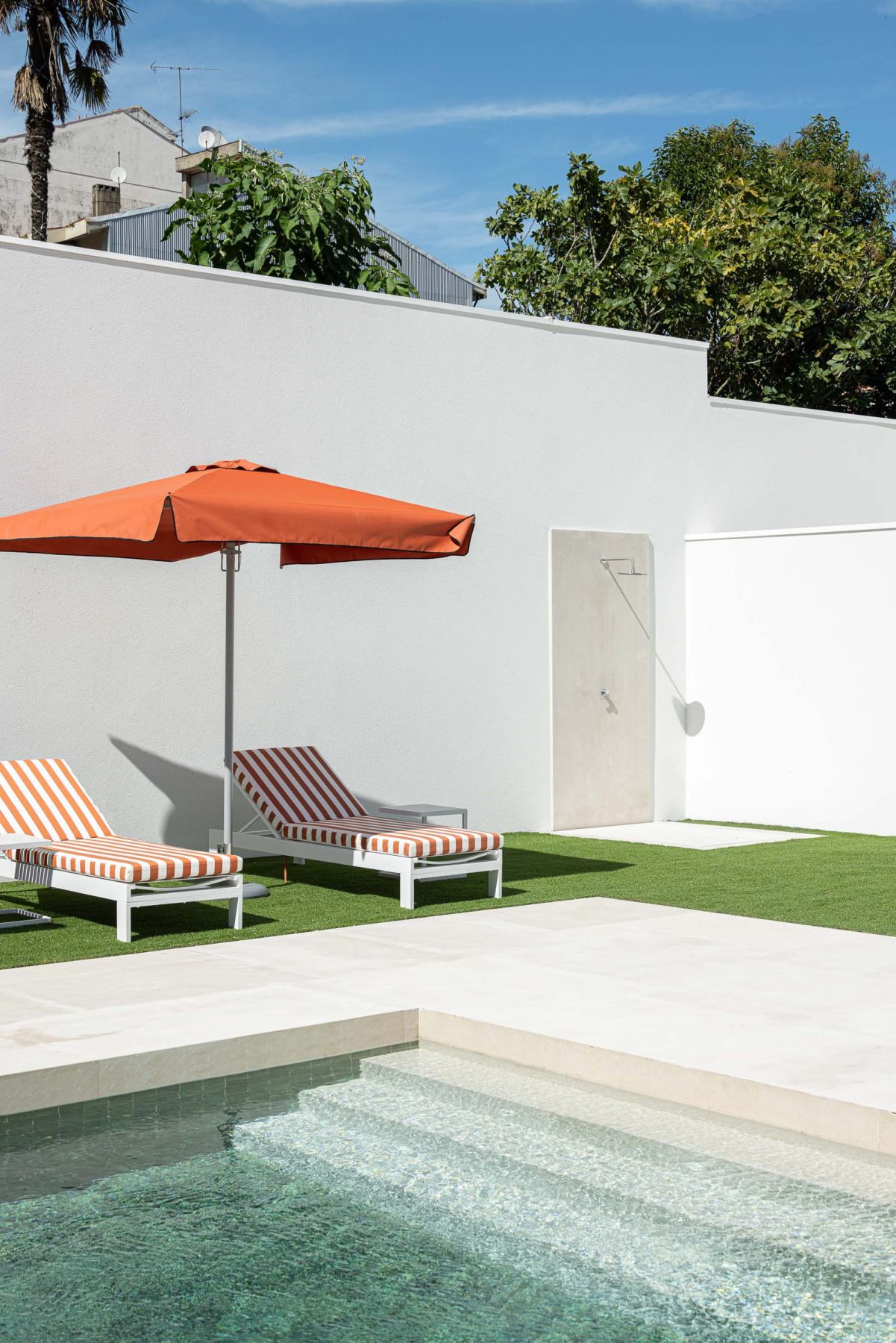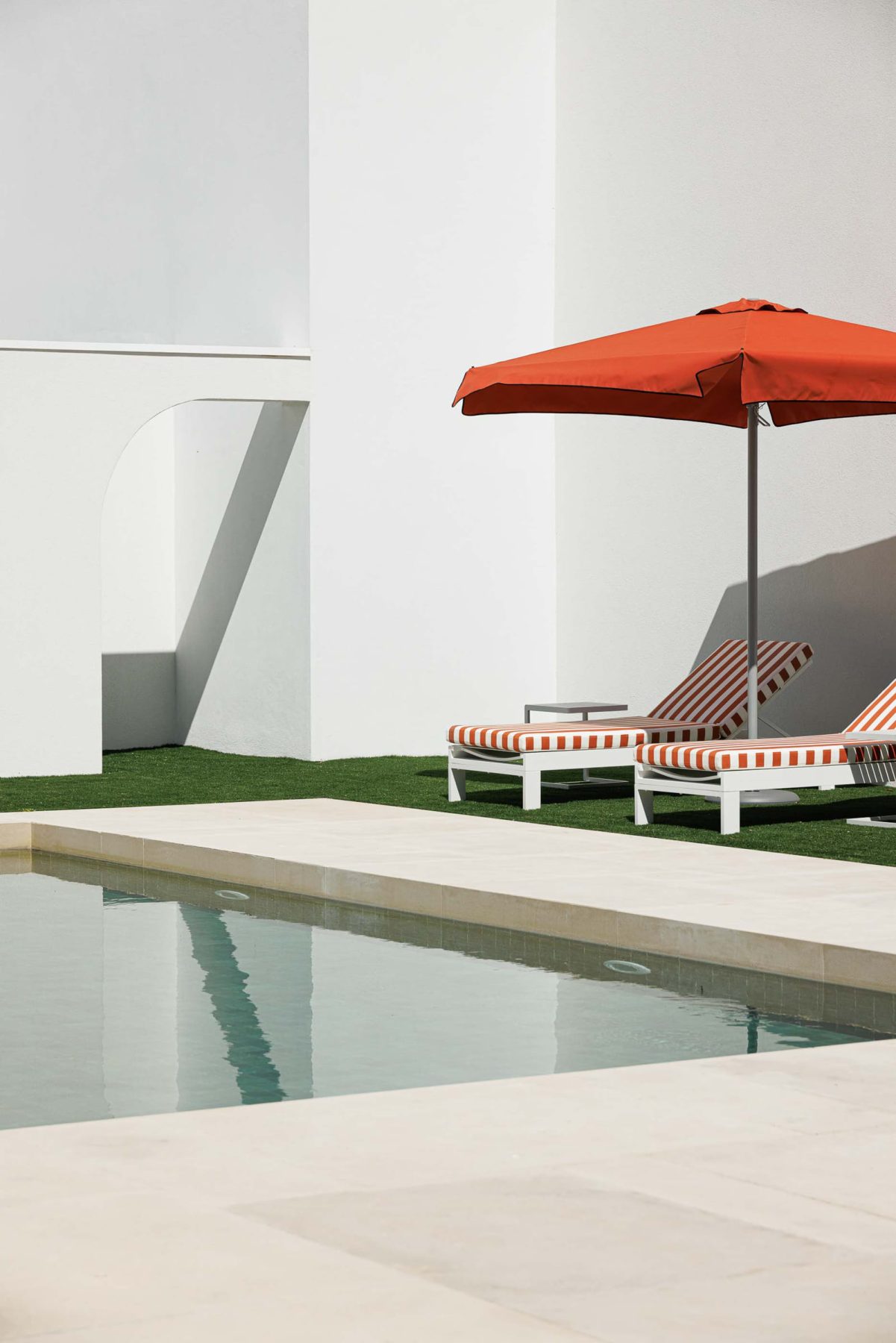 The rear elevation (once fragmented and technically overloaded) is reimagined through a second skin: a geometric structure that expands the envelope and projects balconies overlooking the courtyard and pool. This addition echoes the formal vocabulary of the interiors, unifying mass, void, and rhythm.