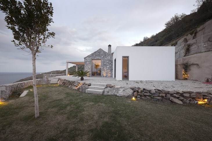 “It all started as a simple snapshot; At a very steep site with clear view towards the sea a holiday retreat protects its inhabitants from the sun heat and the strong winds while soothing the senses under the moonlight. We have placed the building at the only available naturally formed plateau of the site in order to avoid unnecessary groundworks that could spoil the relief.